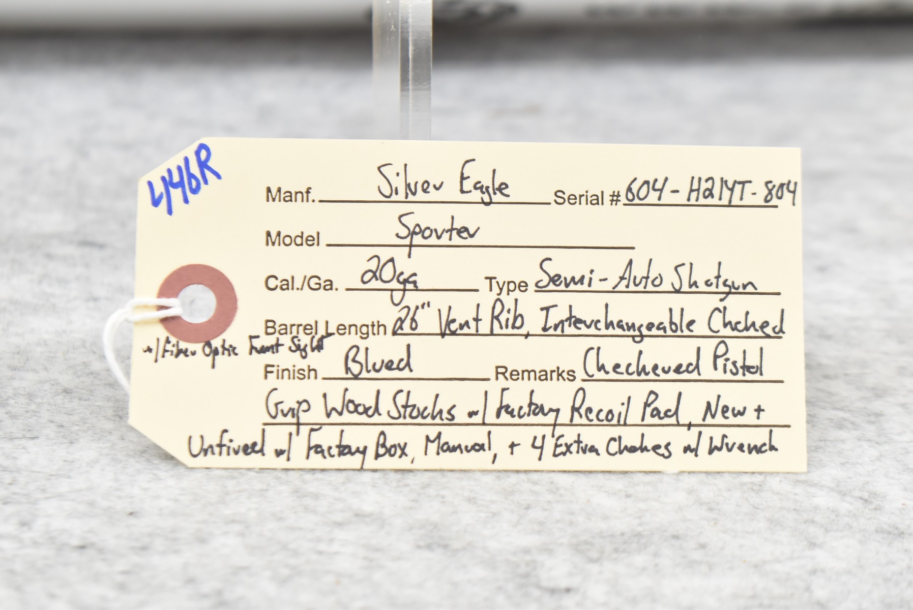 446R.     Silver Eagle – Mod. Sporter – 20ga. Semi-Auto Shotgun – w/26” Vent Rib Interchangeable Choked Barrel w/Fiber Optic Front Sight – Blued Finish – w/Checkered Pistol Grip Wood Stocks w/Factory Recoil Pad – Unfired w/Factory Box, Manual, and 4 Extra Chokes w/Wrench
