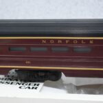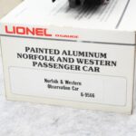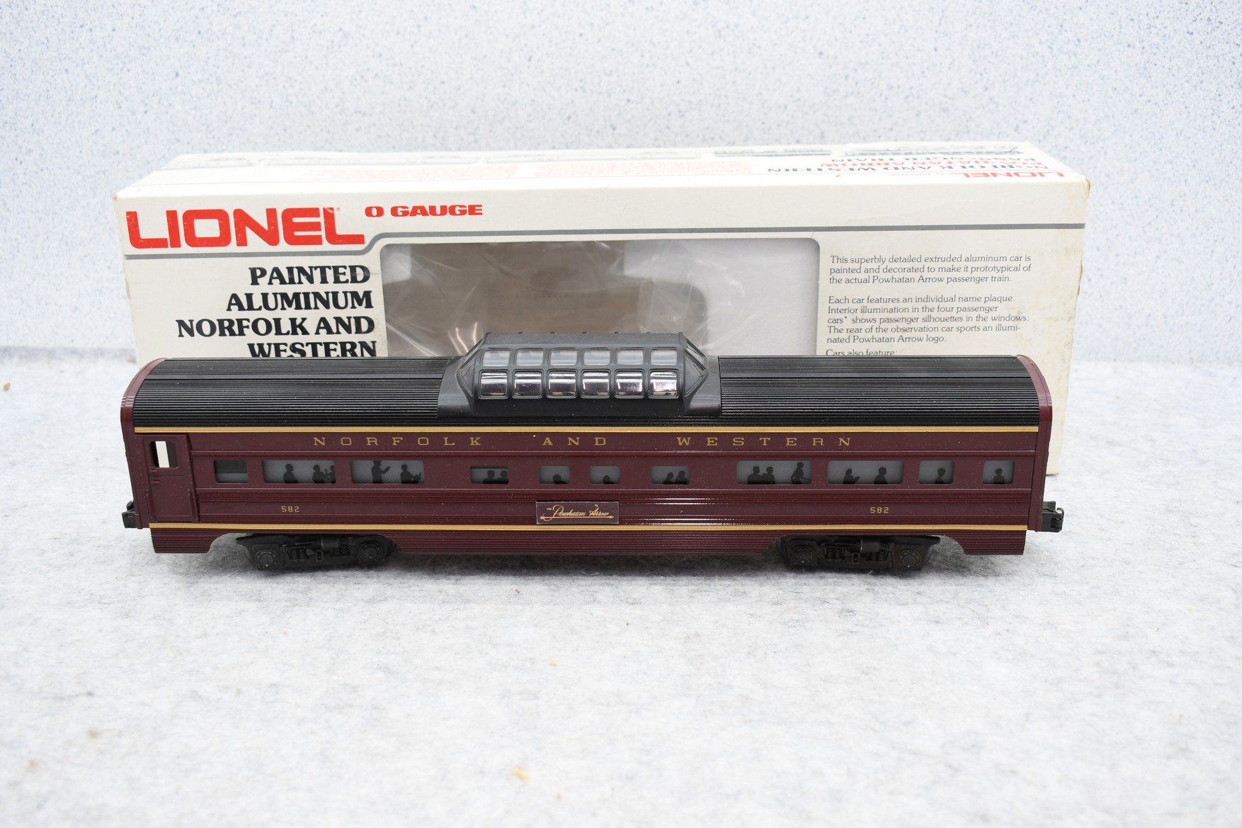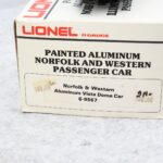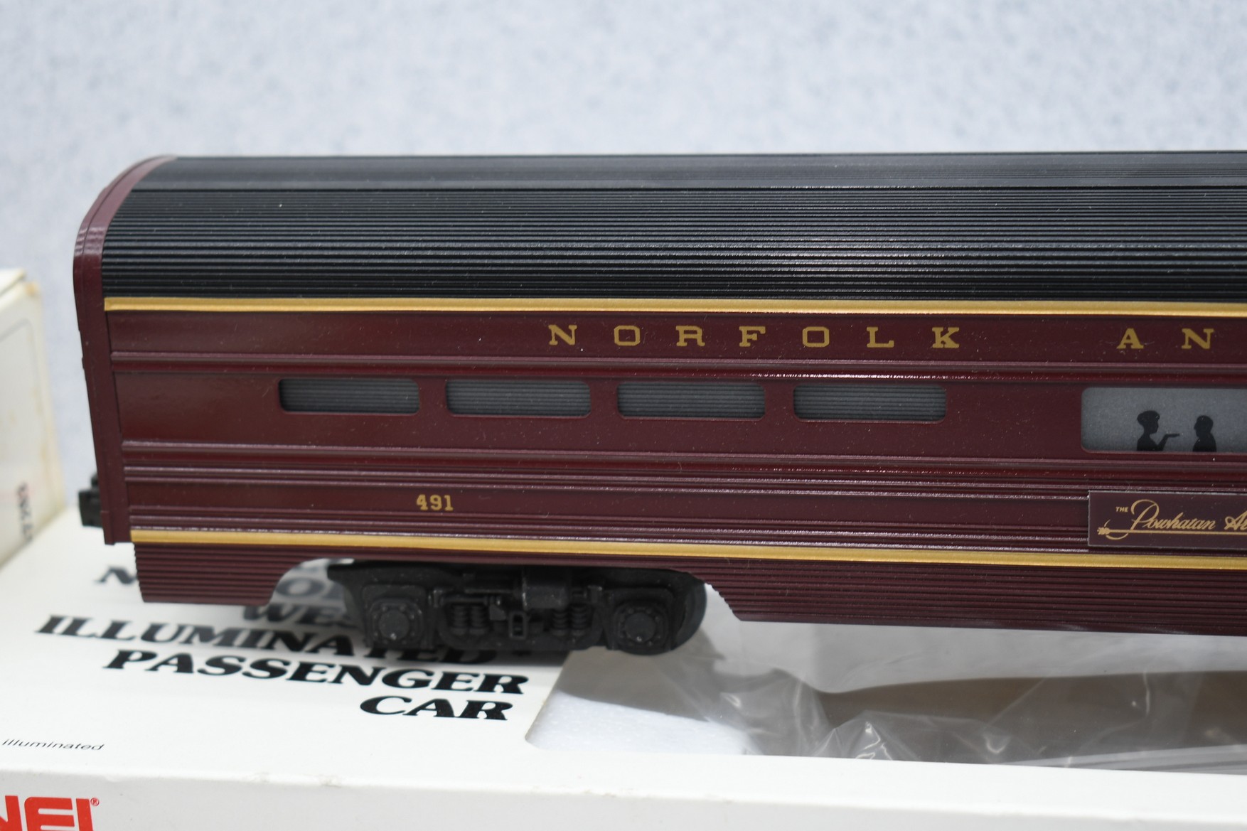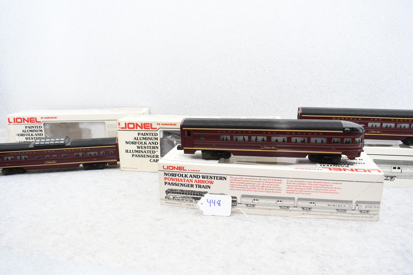 448. Lot of 4 Lionel O gauge passenger cars including 6-9567 Norfolk & Western aluminum Vista Dome car, 6-7203 Norfolk & Western Aluminum Dining car, 6-9562 Norfolk & Western Baggage car & 6-9566 Norfolk & Western Observation car. All with original boxes