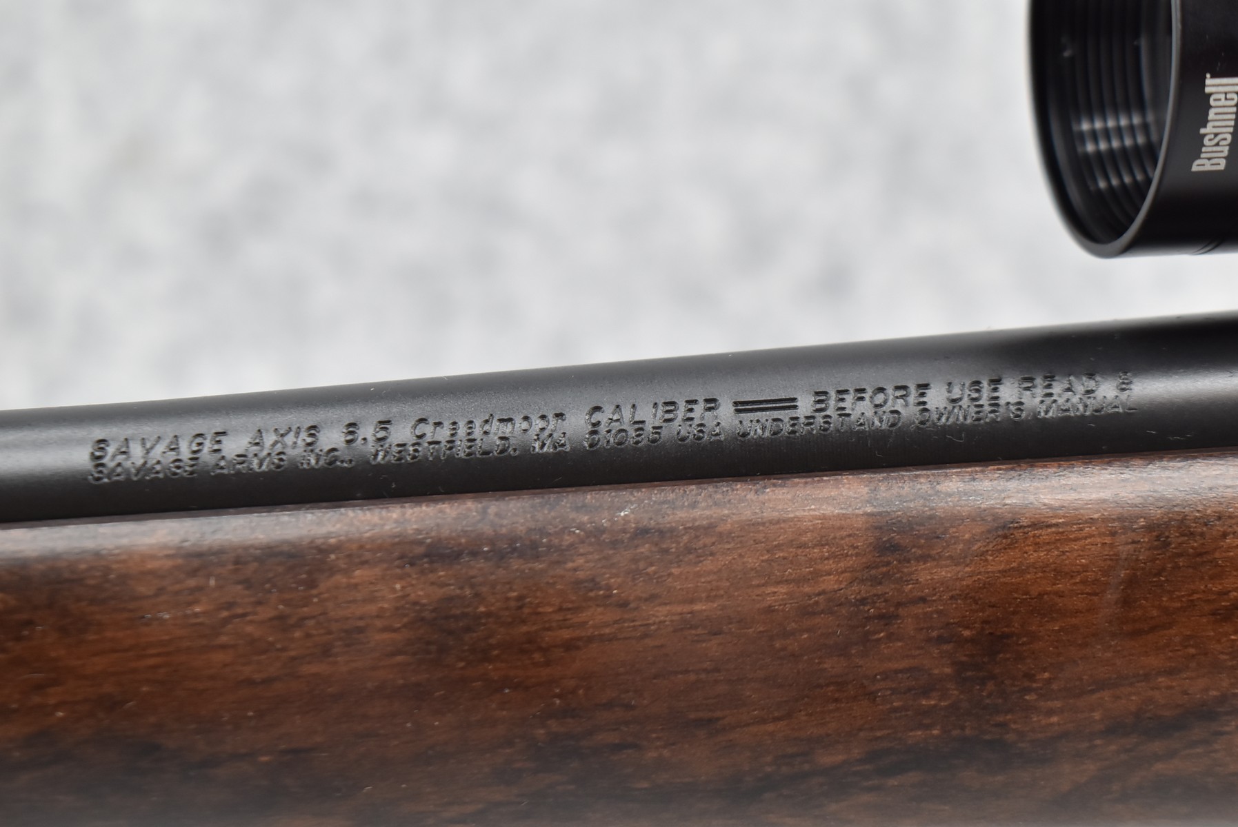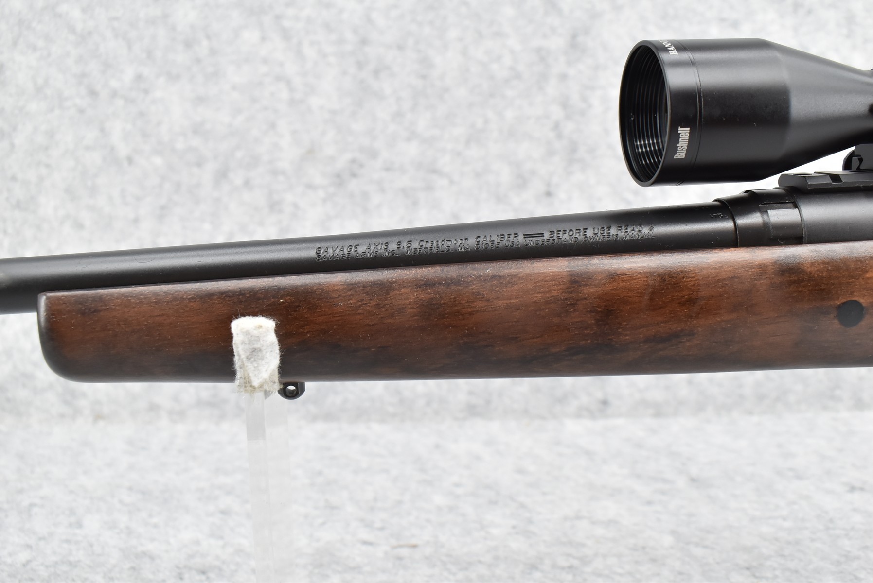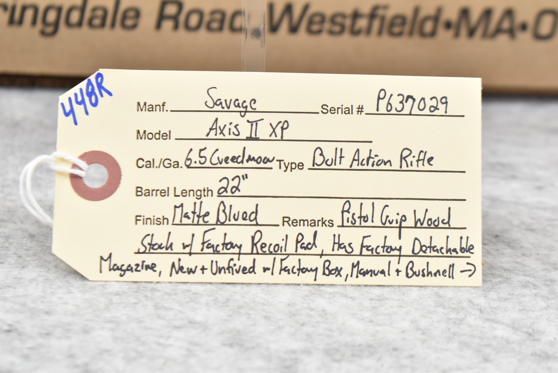 448R. Savage – Mod. Axis II XP – 6.5 Creedmoor Cal. Bolt Action Rifle – w/22” Barrel – Matte Blued Finish – w/Pistol Grip Wood stock w/Factory Recoil Pad – w/Factory Detachable Magazine – w/Accu-Trigger – New & Unfired w/Factory Box, Manual & Bushnell 3x-9x Scope & Mounts