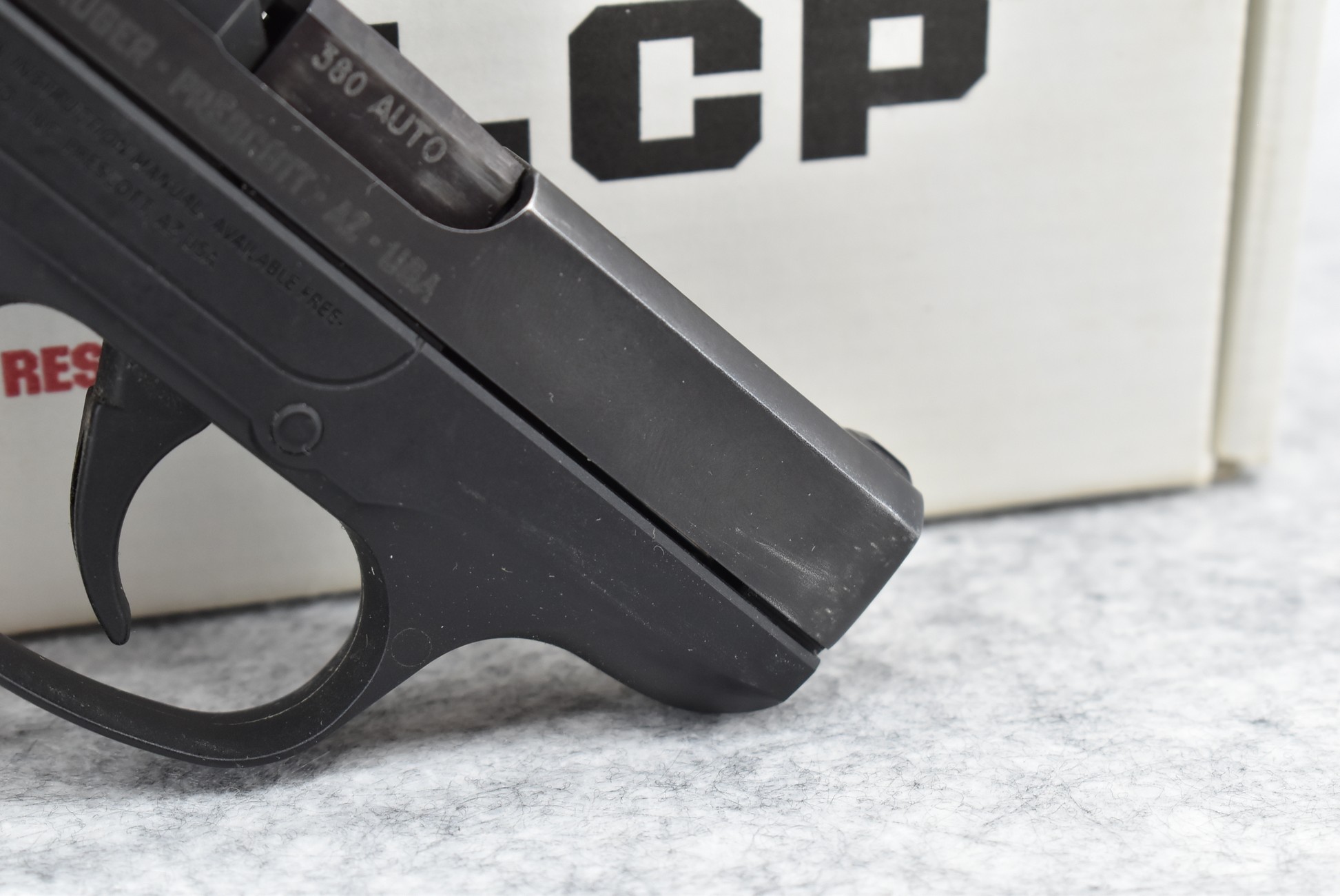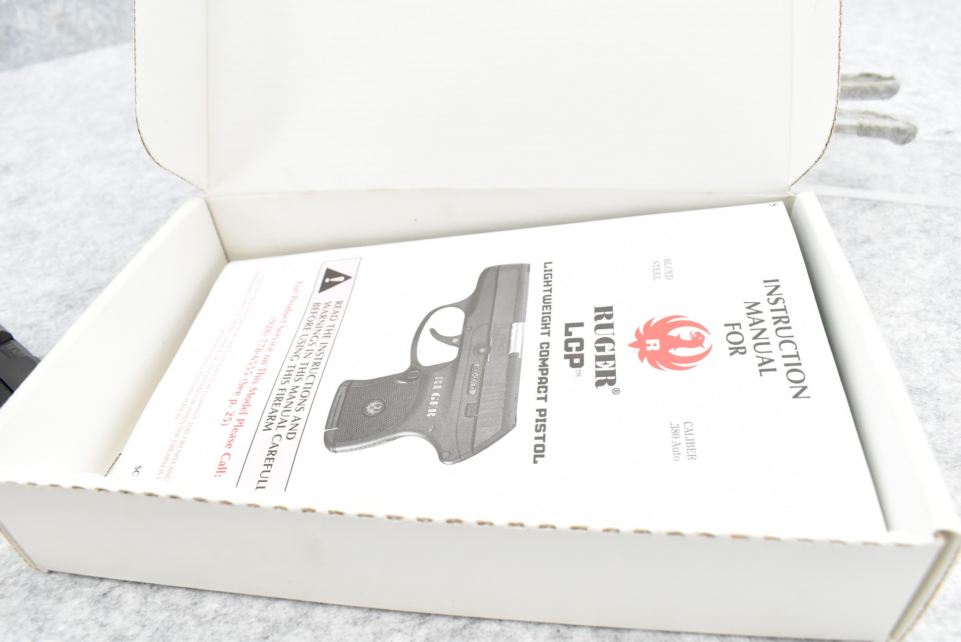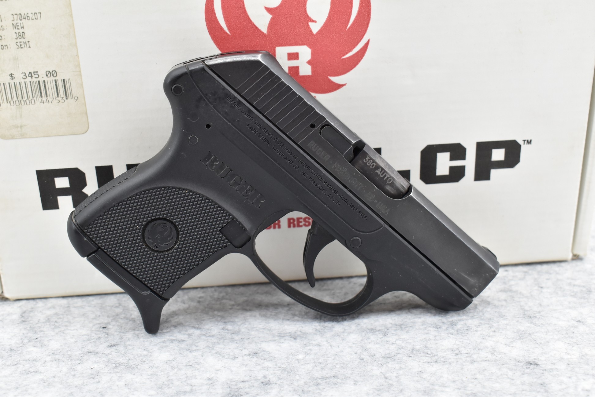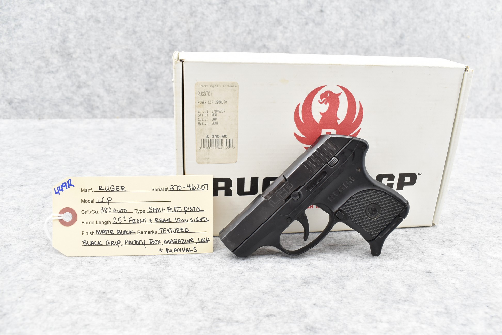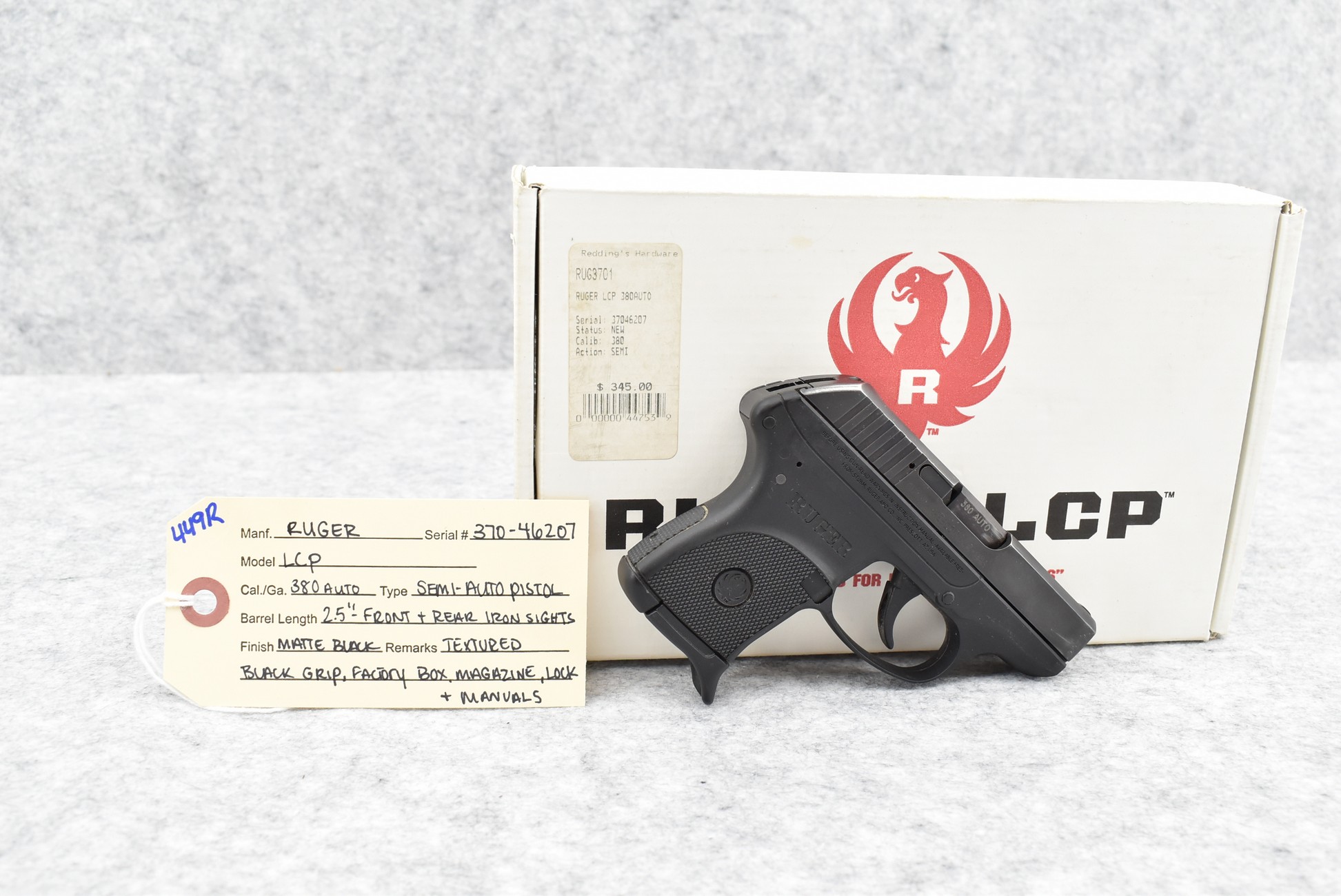 449R. Ruger – Mod. LCP – 380 Auto Cal. Semi-Auto Pistol – w/2½” Barrel w/Front and Rear Iron Sights – Matte Black Finish – w/Textured Black Grip – w/Factory Magazine – w/Factory Box and Manual