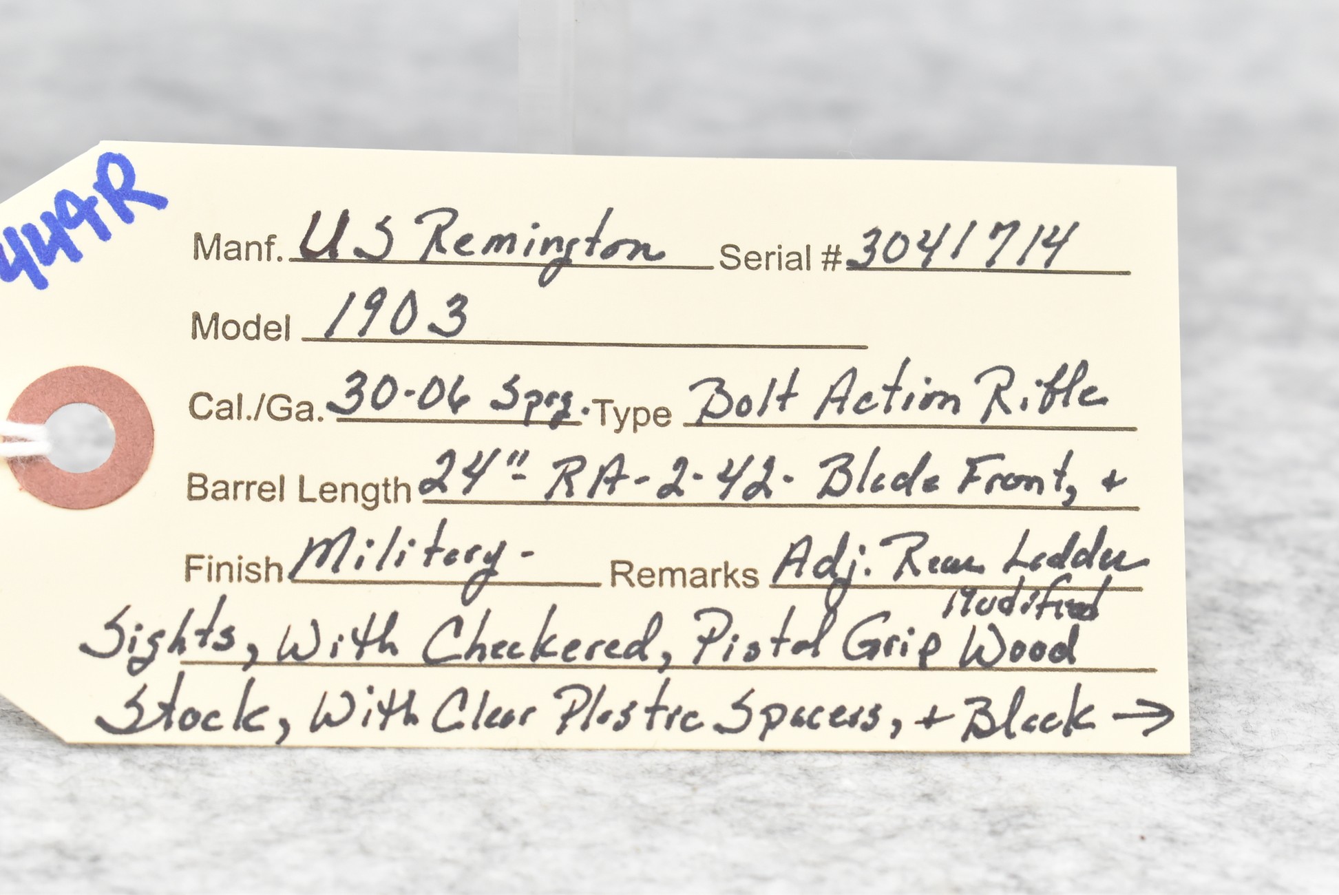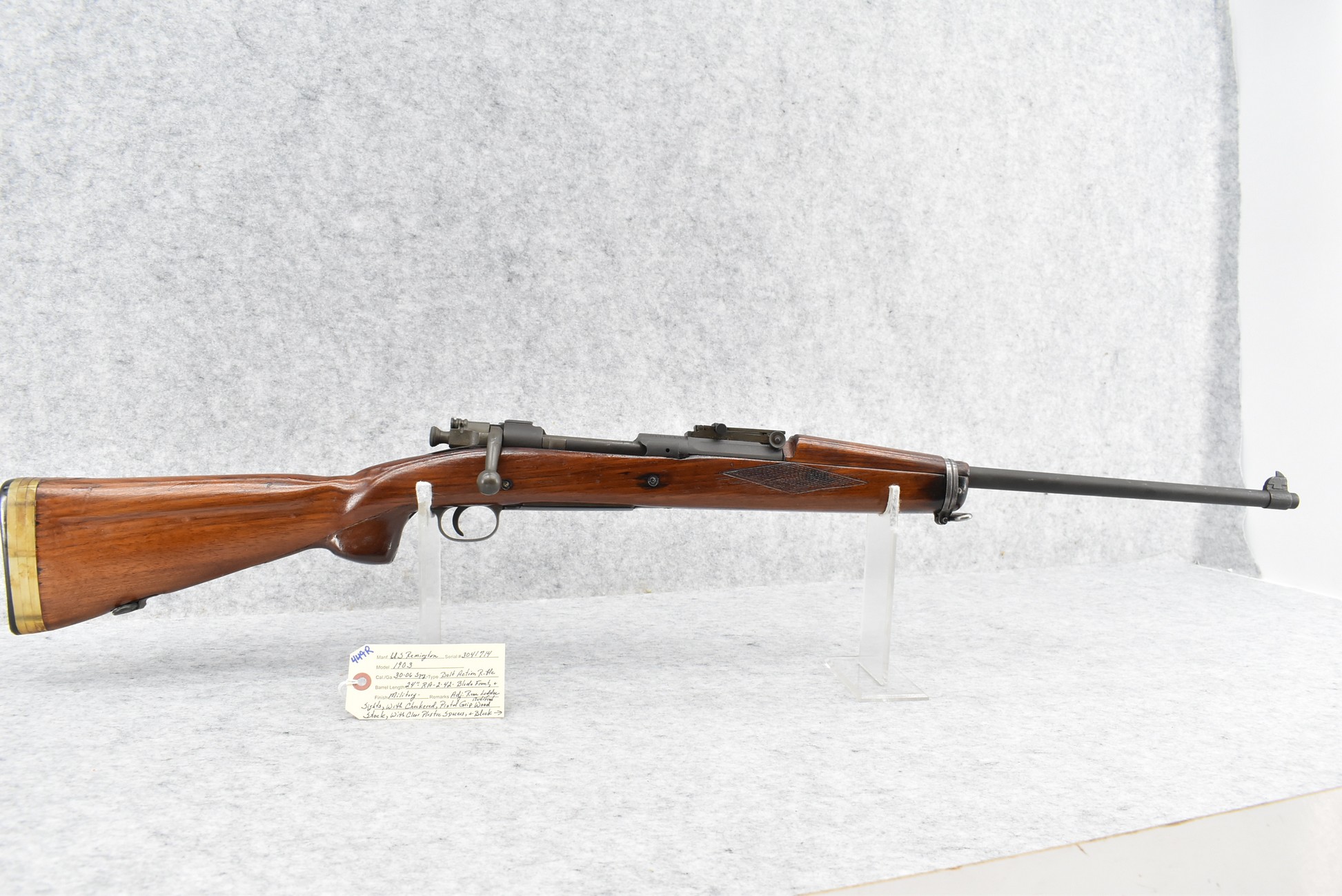 449R. U.S. Remington – Mod. 1903 – 30-06 Sprg. Cal. Bolt Action Rifle – w/24” RA 2-42 Dated Barrel w/Blade Front & Adj. Rear Ladder Sights – Military Finish – w/Checkered Pistol Grip Modified Wood Stock w/Plastic Butt Plate