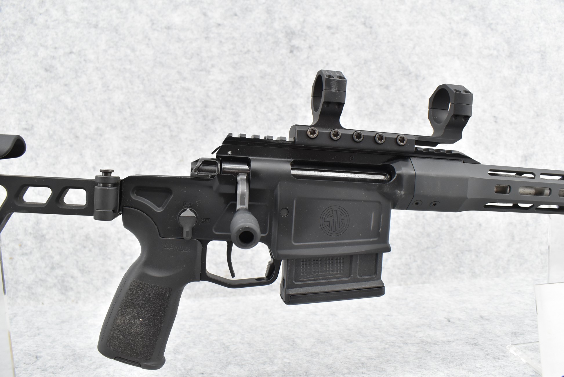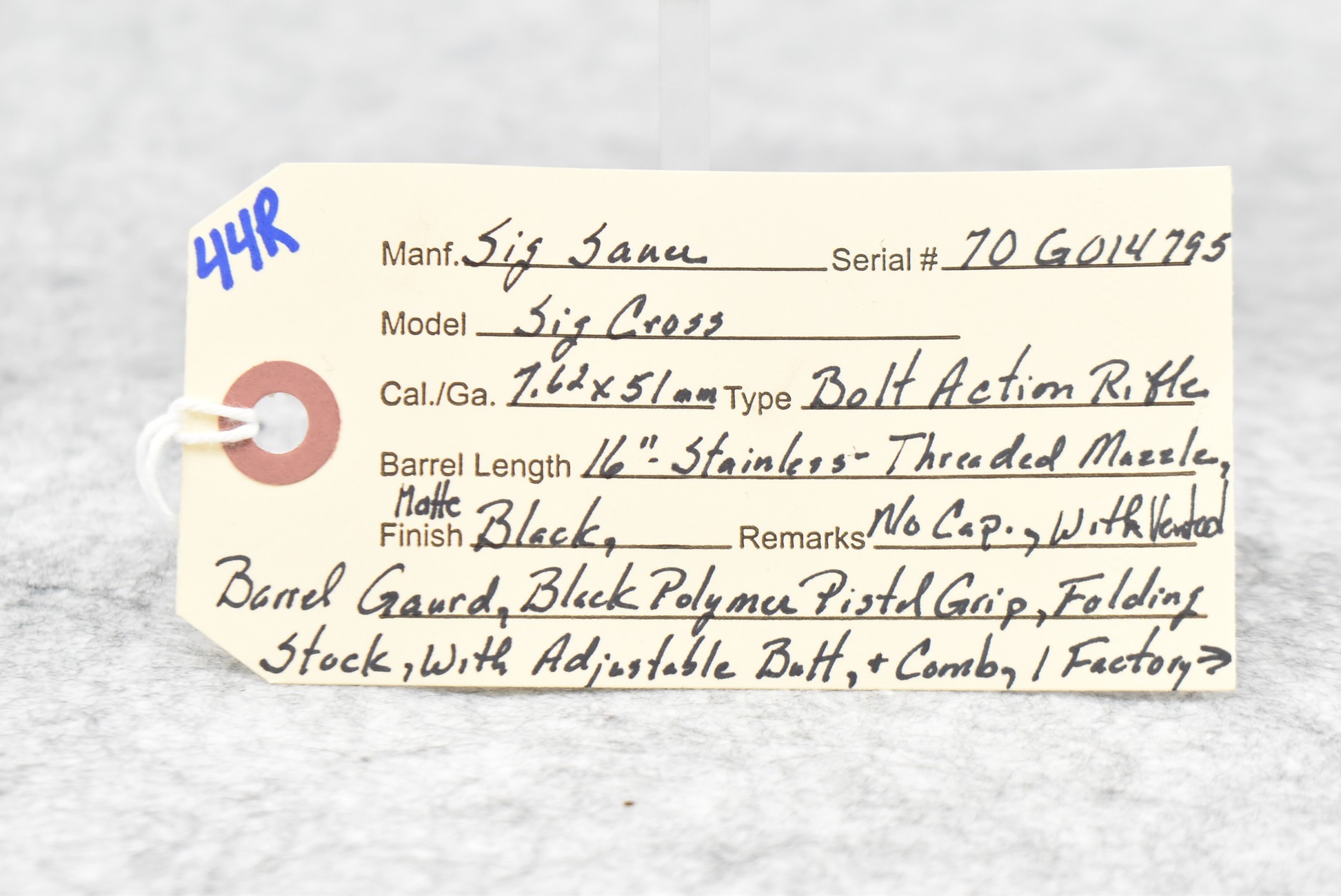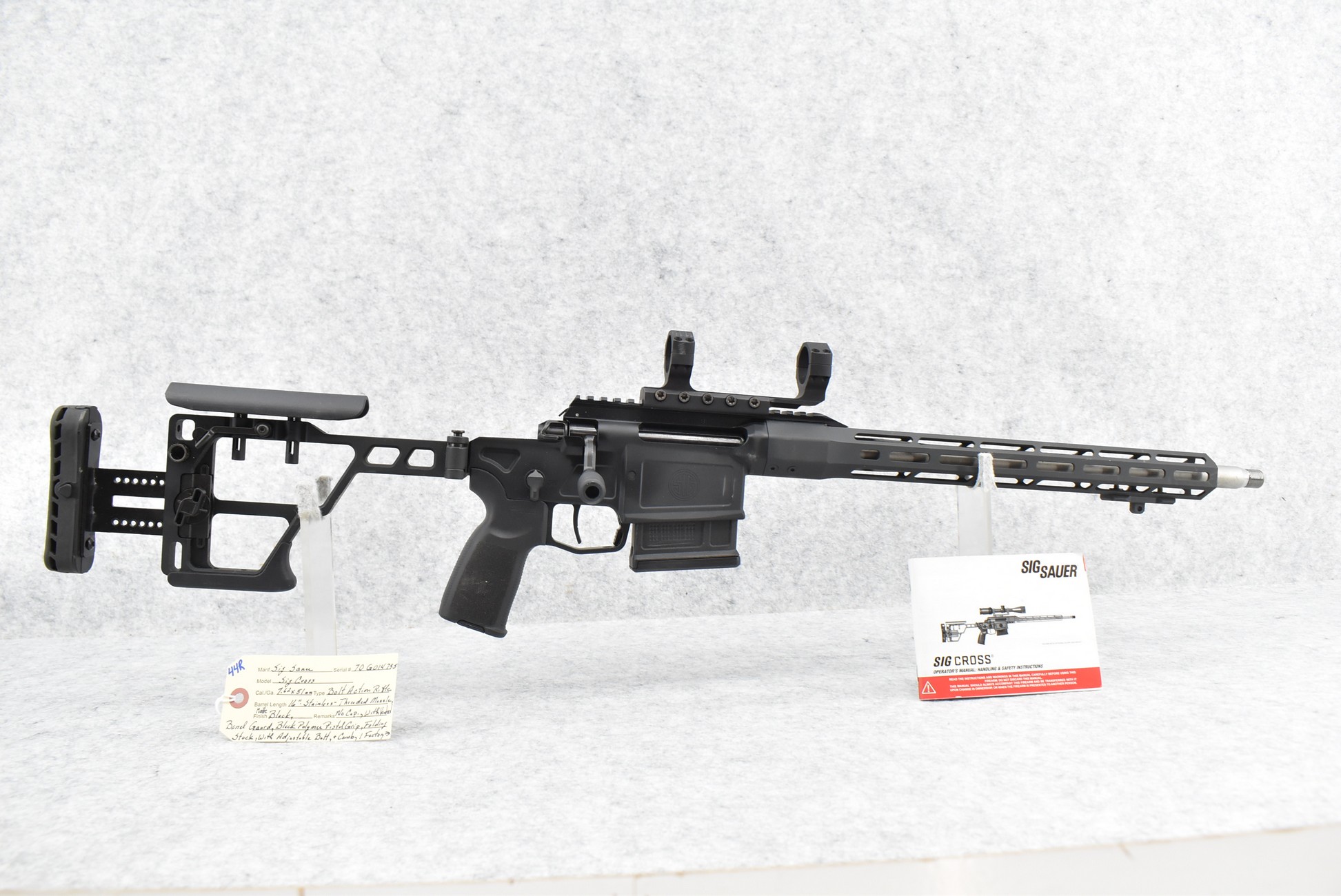 44R. Sig Sauer – Mod. Sig Cross – 7.62x51mm Cal. Bolt Action Rifle – w/16” Stainless Barrel w/Threaded Muzzle, No Cap, and Vented Barrel Guard – Matte Black Finish – w/Black Polymer Pistol Grip Folding Stock w/Adjustable Butt and Comb – w/1 Factory Detachable Magazine – w/Leupold Tactical 30mm Rings and Picatinny Mount – w/Factory Manual
