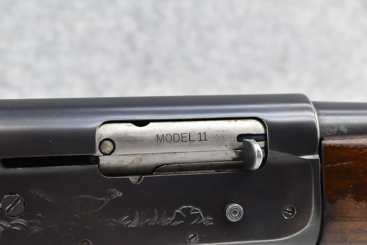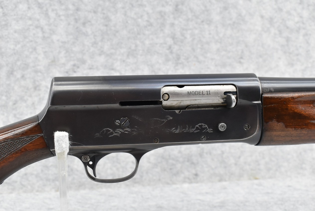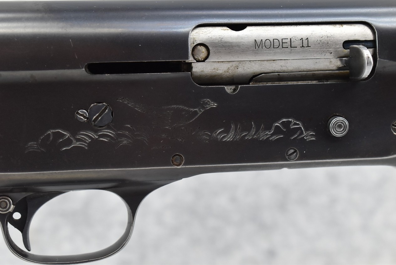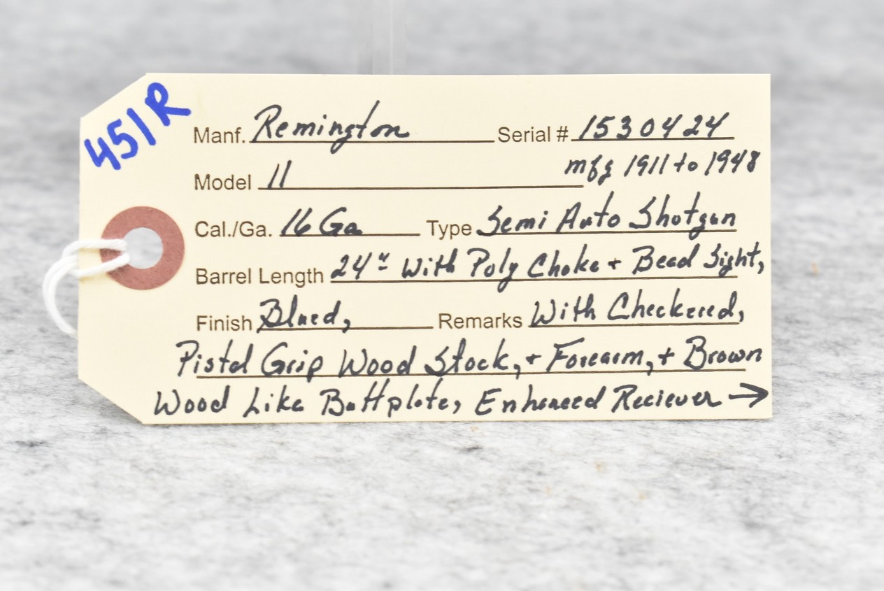 451R. Remington – Mod. 11 – 16ga. Semi-Auto Shotgun – w/24” Barrel w/Bead Sight & Poly Choke – Blued Finish – w/Enhanced Receiver w/Pheasant & Ducks – w/Checkered Pistol Grip Wood Stocks w/Factory Butt Plate