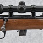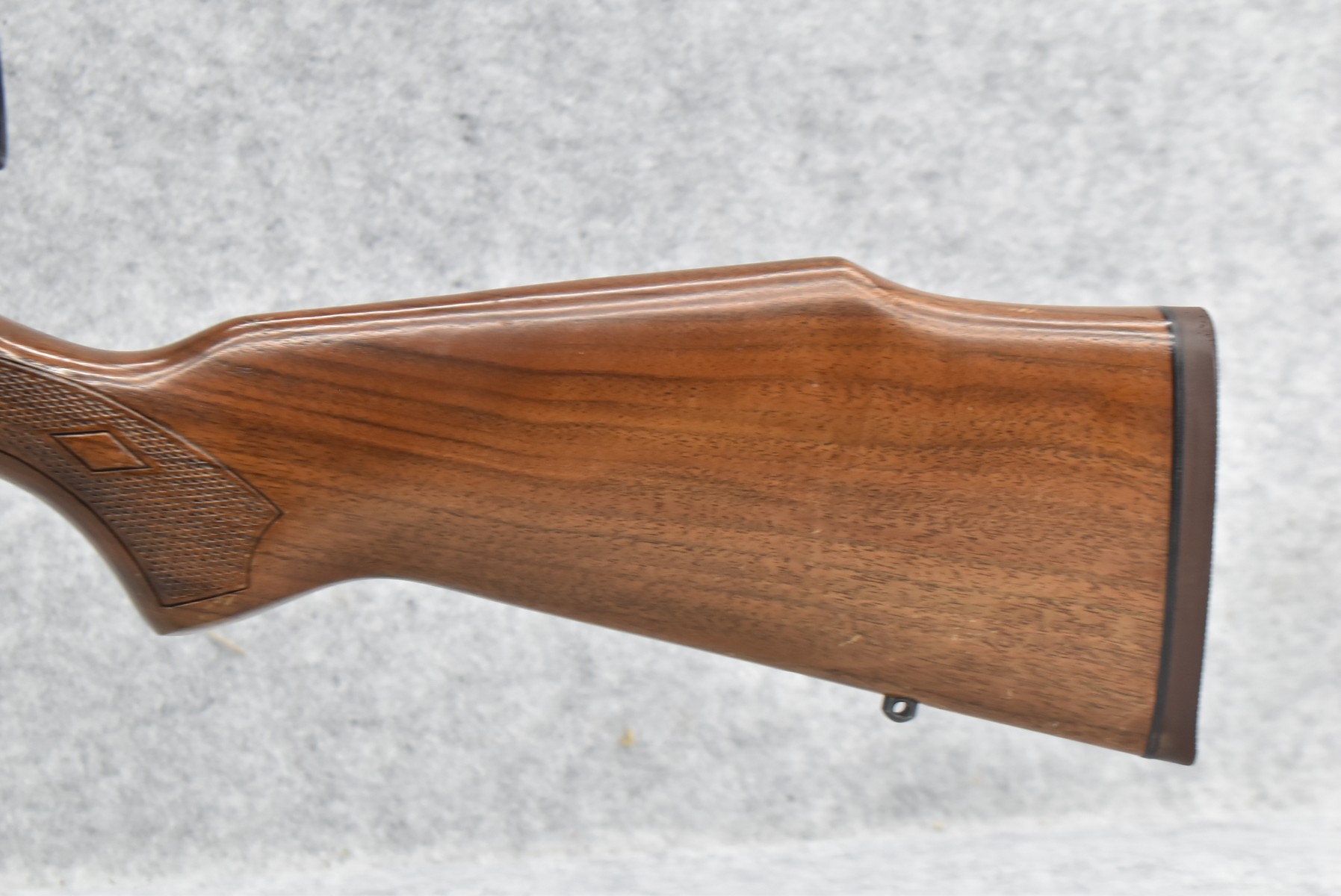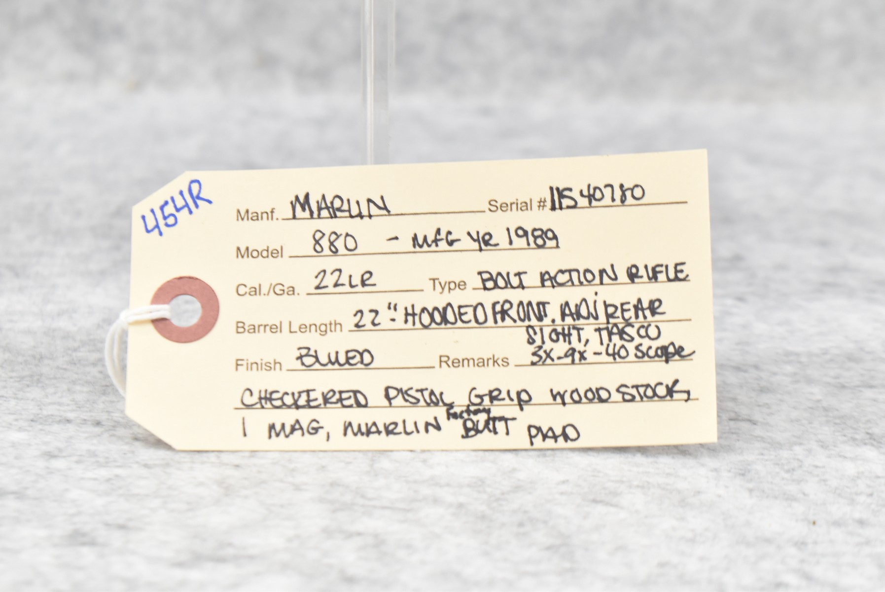 454R. Marlin – Mod. 880 – 22LR Cal. Bolt Action Rifle – w/22” Barrel w/Hooded Front & Adj. Rear Sights – Blued Finish – w/Checkered Pistol Grip Wood Stock w/Factory Butt Pad – w/Mag – w/Tasco 3x-9x-40 Scope – Mfg. 1989