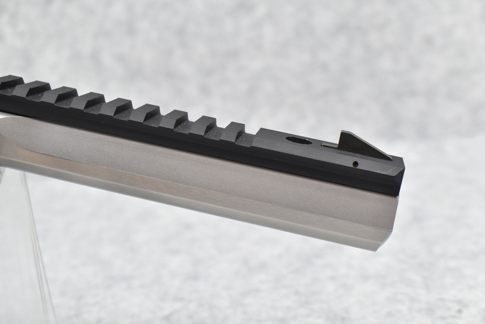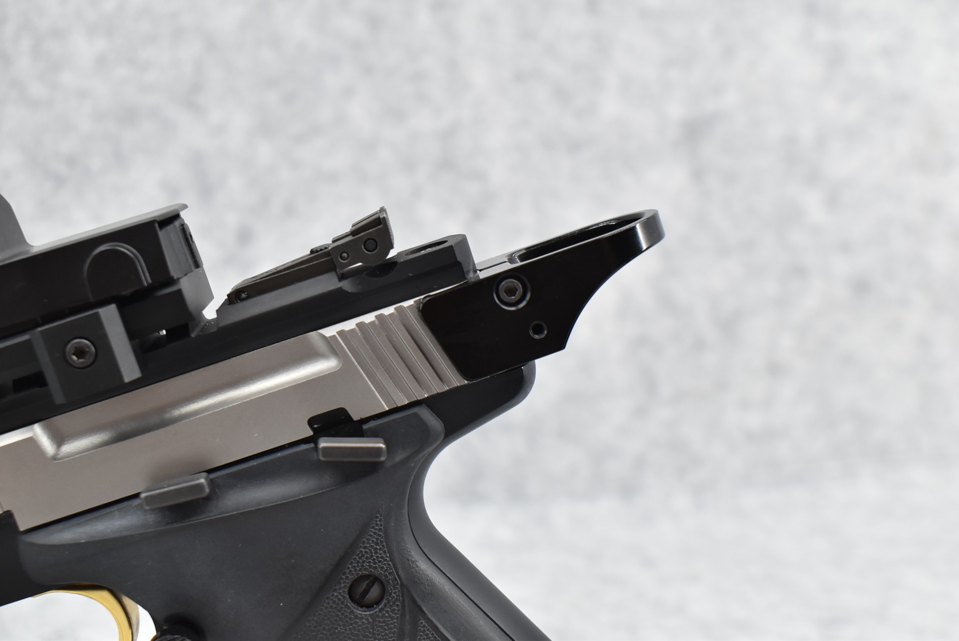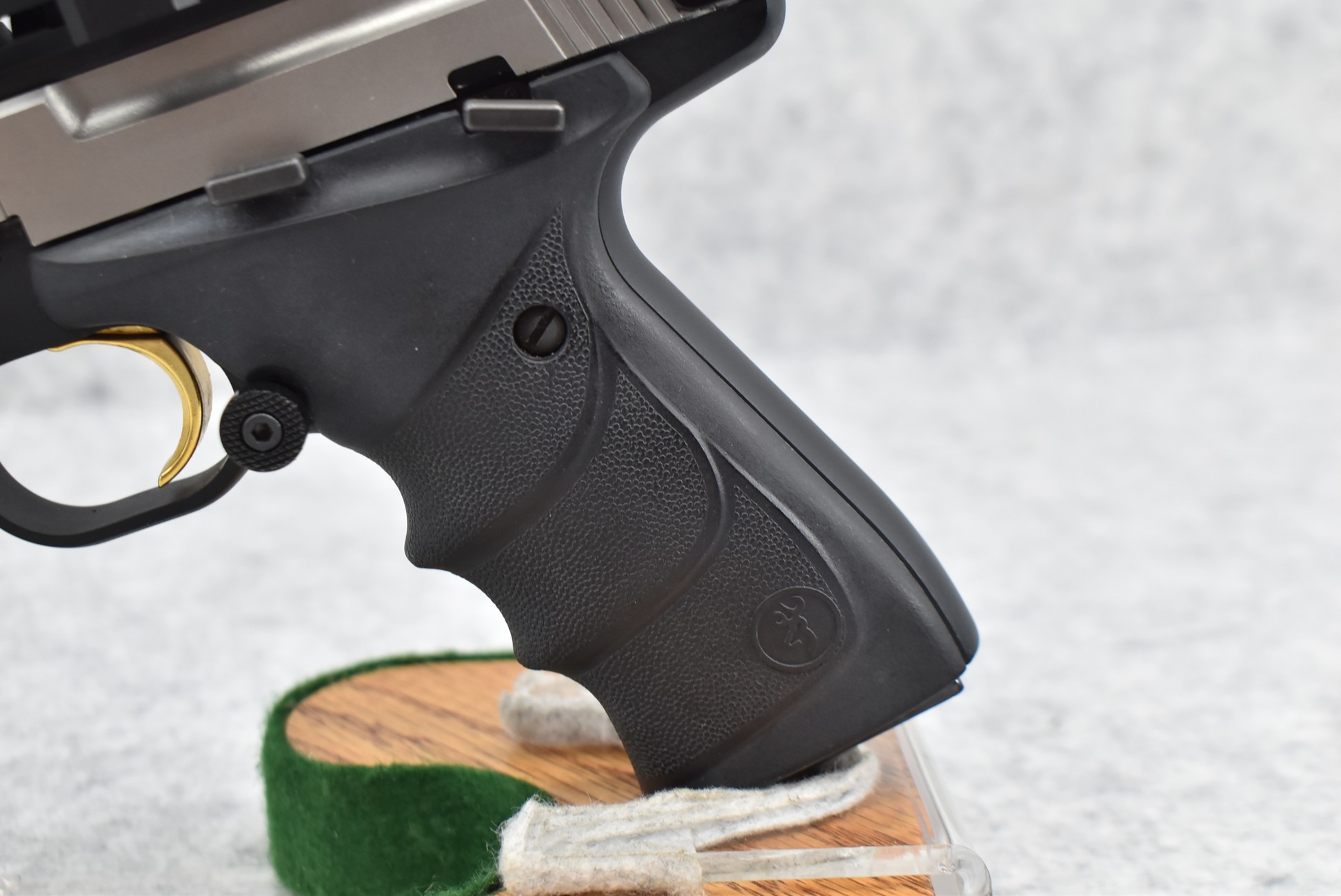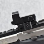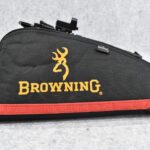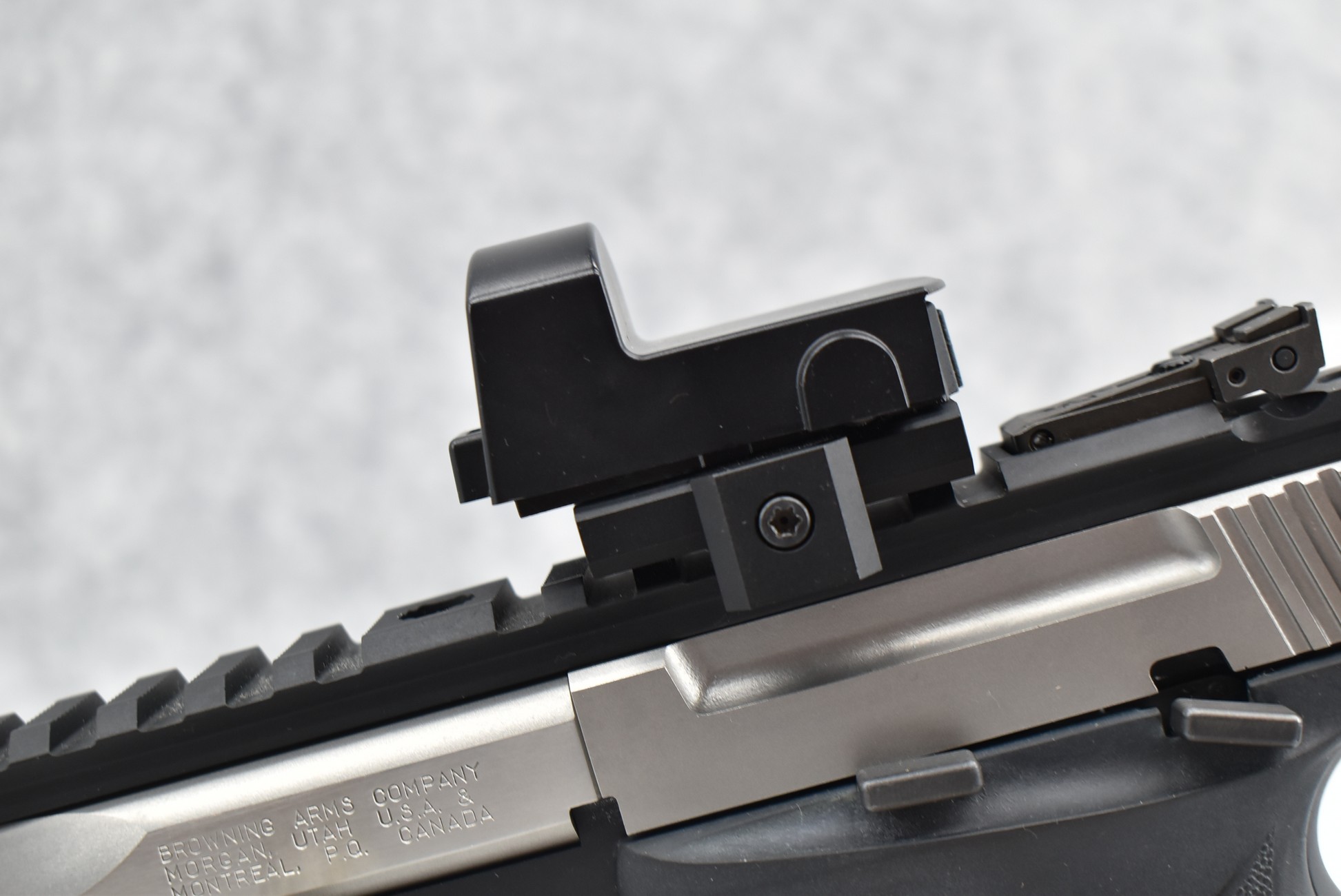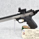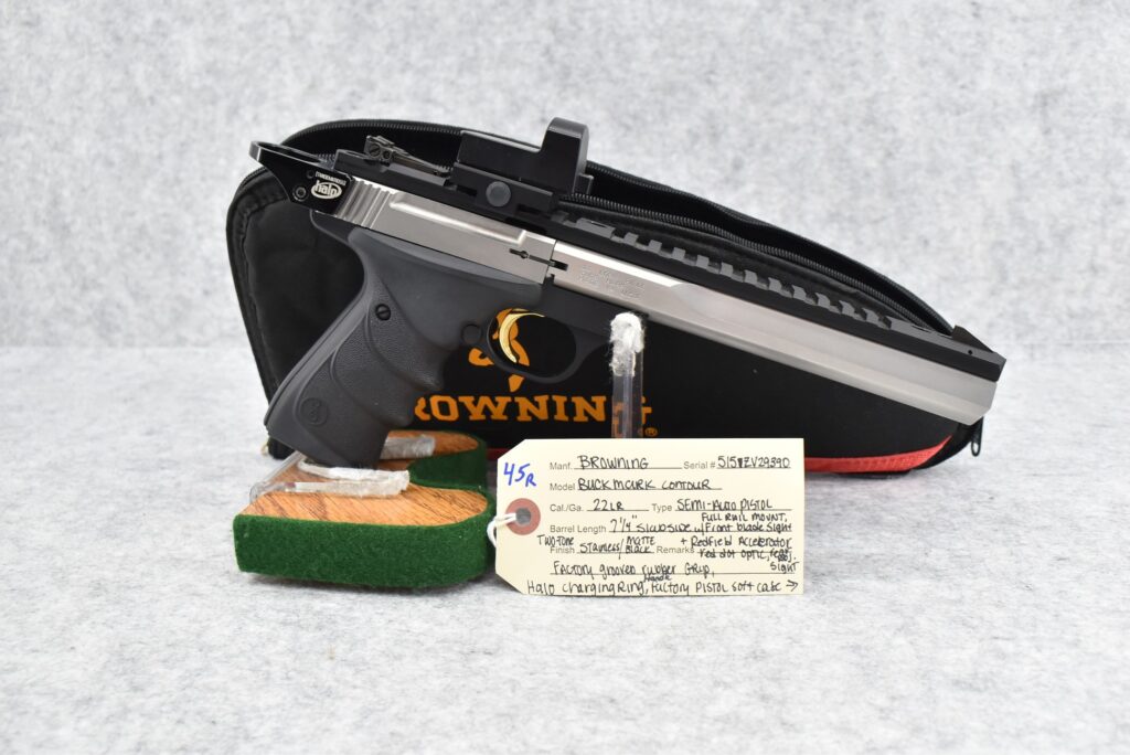 45R. Browning – Mod. Buck Mark Contour – 22LR Cal. Semi-Auto Pistol – w/7 ¼” Slabside Barrel w/Front Blade Sight – Stainless/Matte Black Two-Tone Finish – w/Factory Grooved Rubber Grip – w/Halo Charging Ring Handle – w/Factory Magazine – w/Full TopRail Mount – w/Redfield Accelerator Red Dot Optic Rear Adj. Sight – Appears Unfired w/Factory Pistol Soft Case
