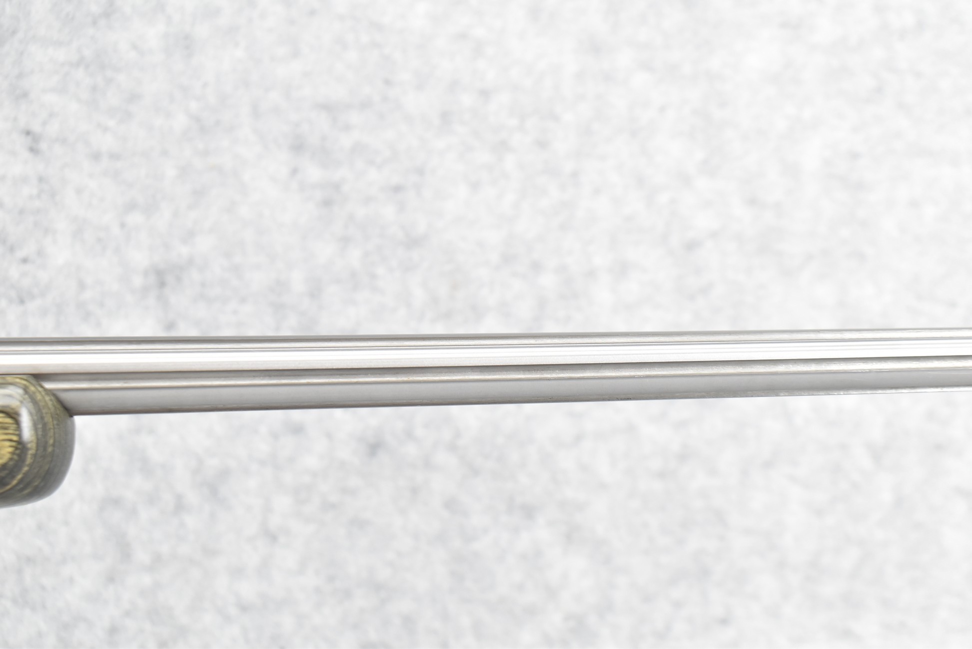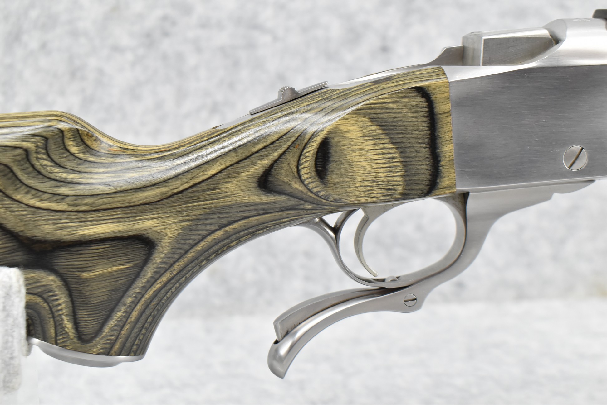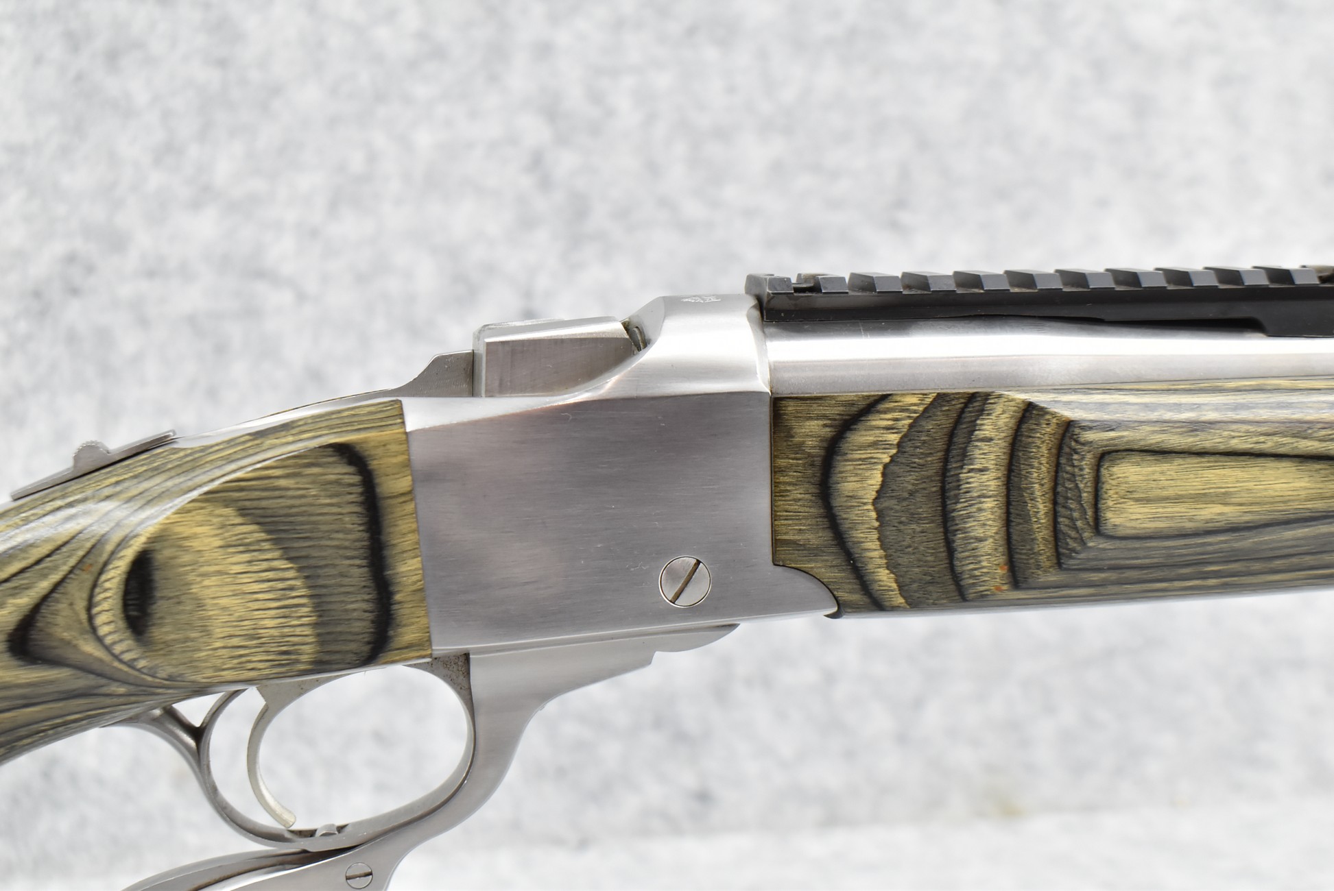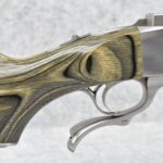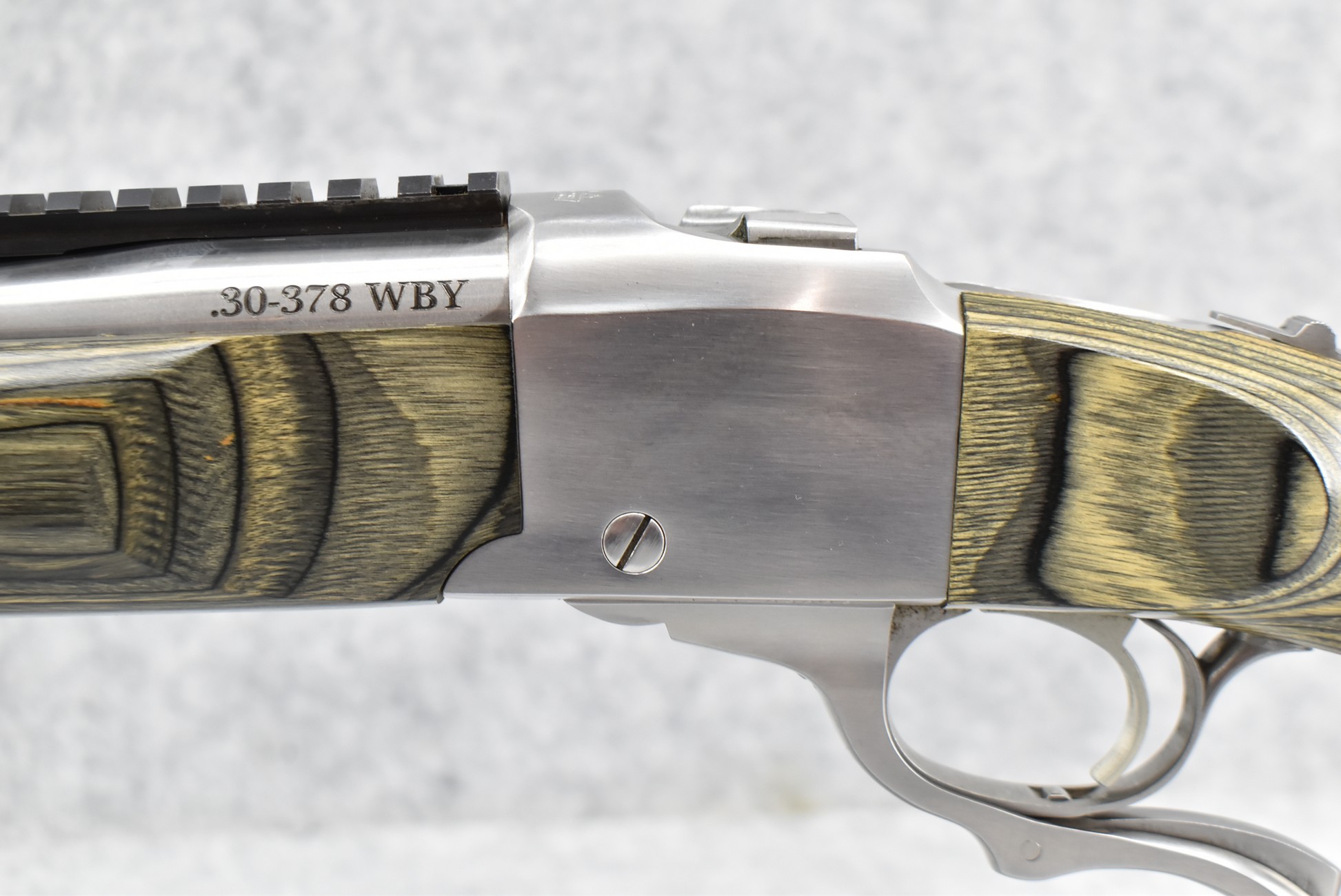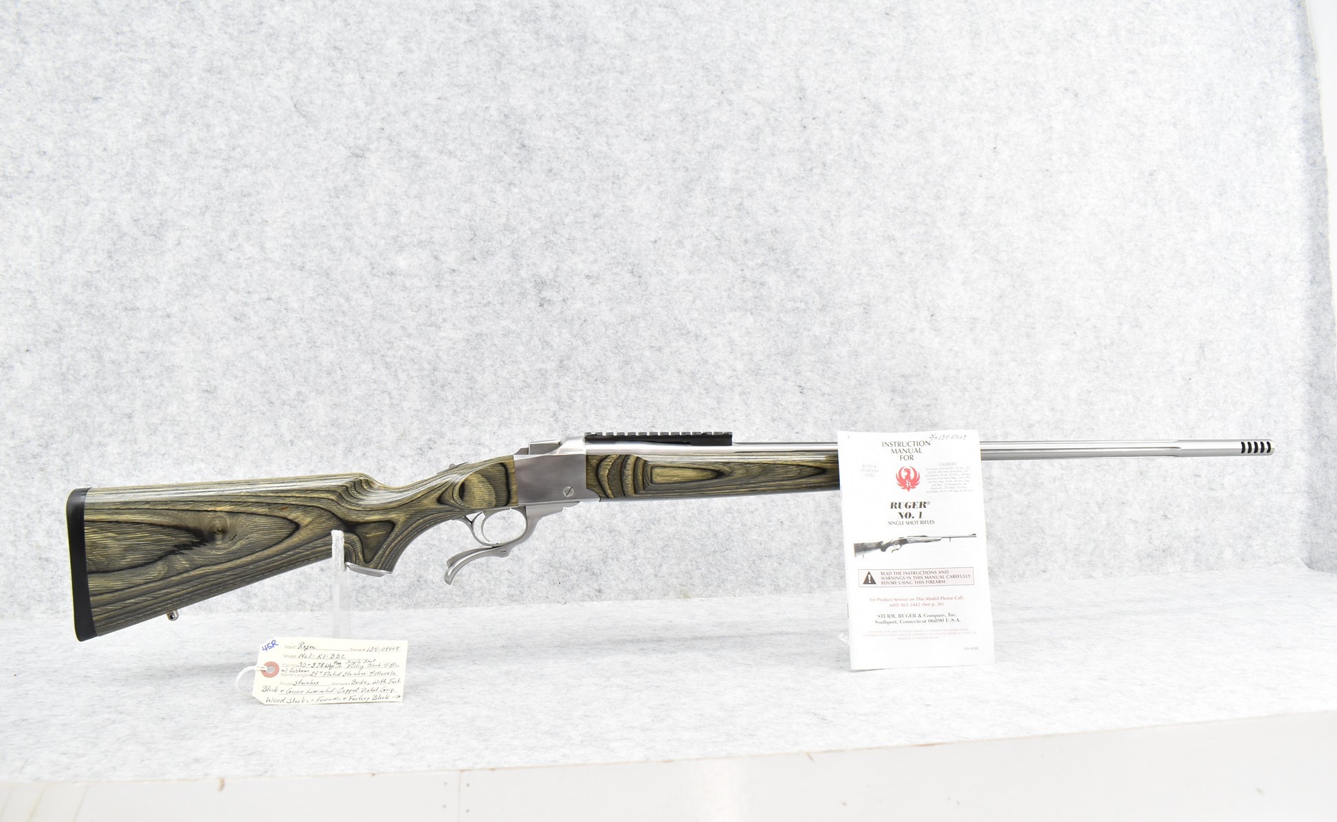 45R. Ruger – Nod. No. 1 – 30-378 Wby. Mag. Cal. Falling Block Single Shot Rifle – w/Custom 29” Fluted Stainless Barrel w/Muzzle Brake – Stainless Finish – w/Factory Black & Green Laminated Capped Pistol Grip Wood Stocks w/Factory Butt Pad – w/Manual