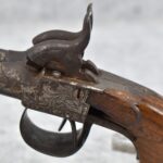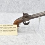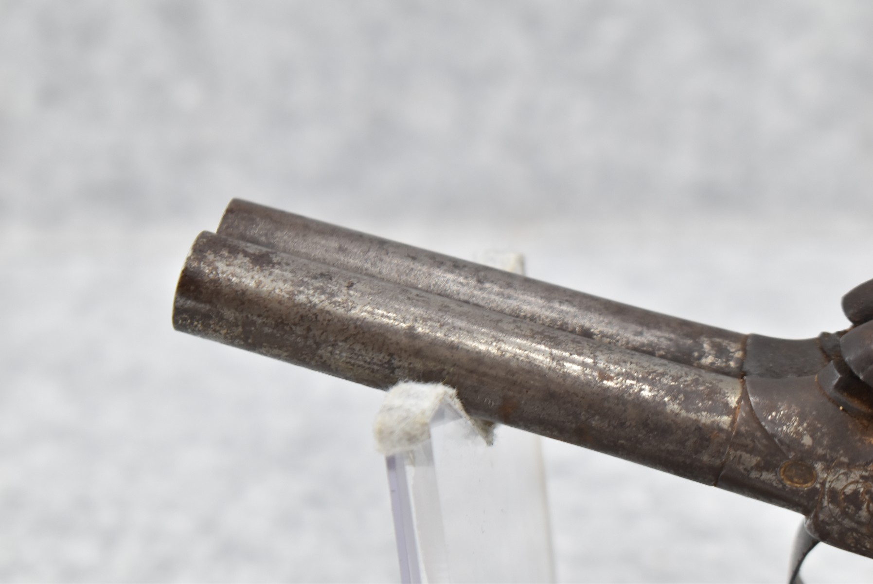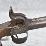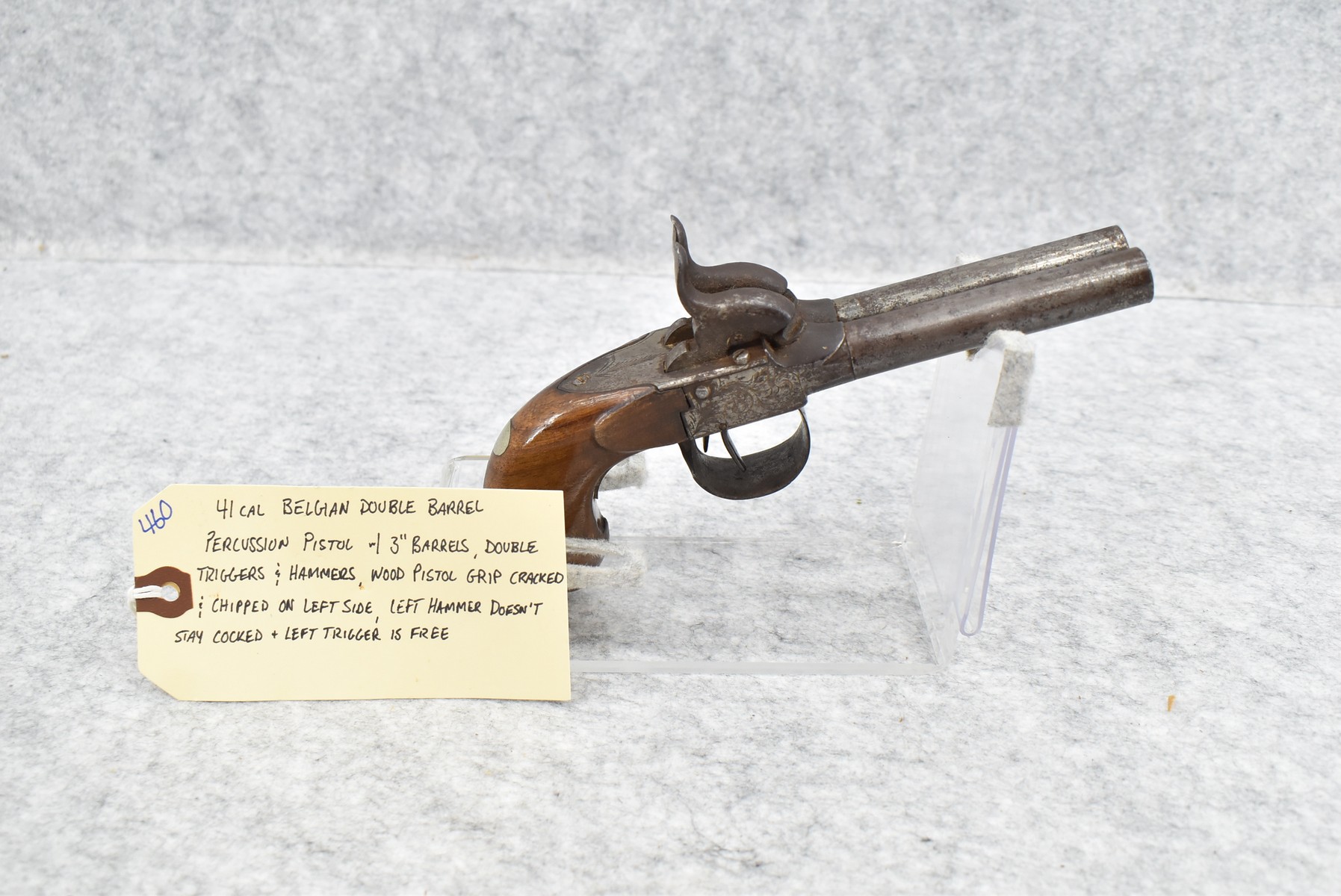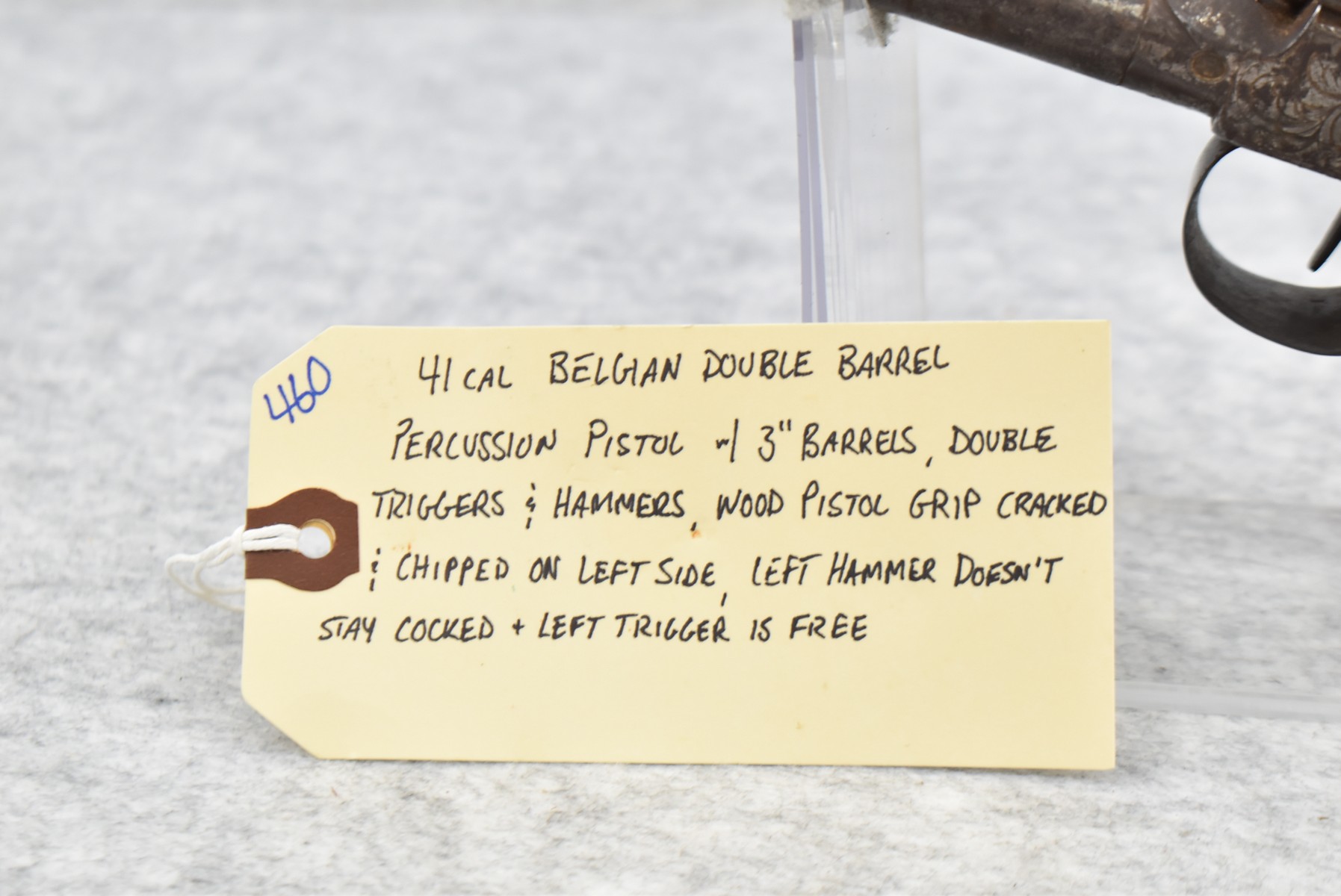 460. 41 Cal. Belgian Double Barrel Percussion Pistol – w/3” Barrels – w/Wood Pistol Grip (Cracked & Chipped on Left Side) – w/Double Triggers & Hammers – Note: Left Hammer Doesn’t Stay Cocked & Left Trigger Is Free