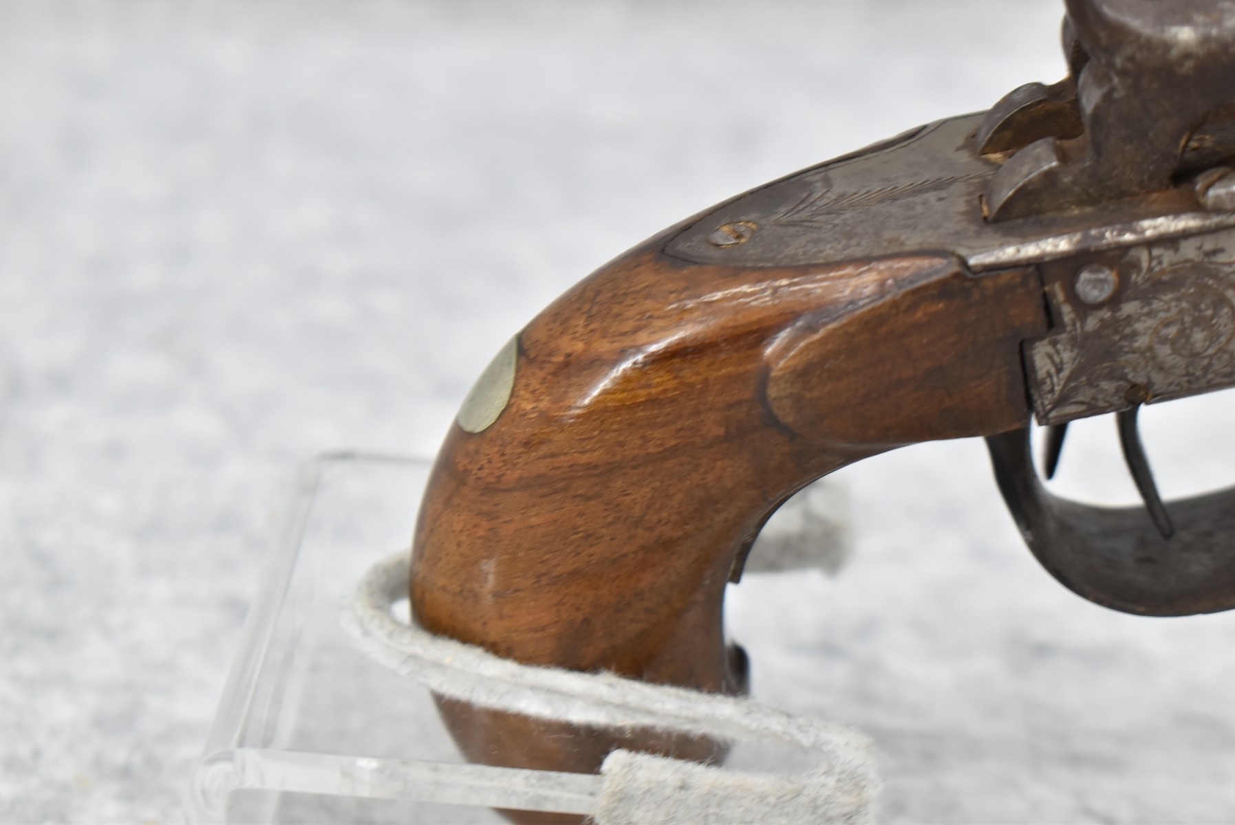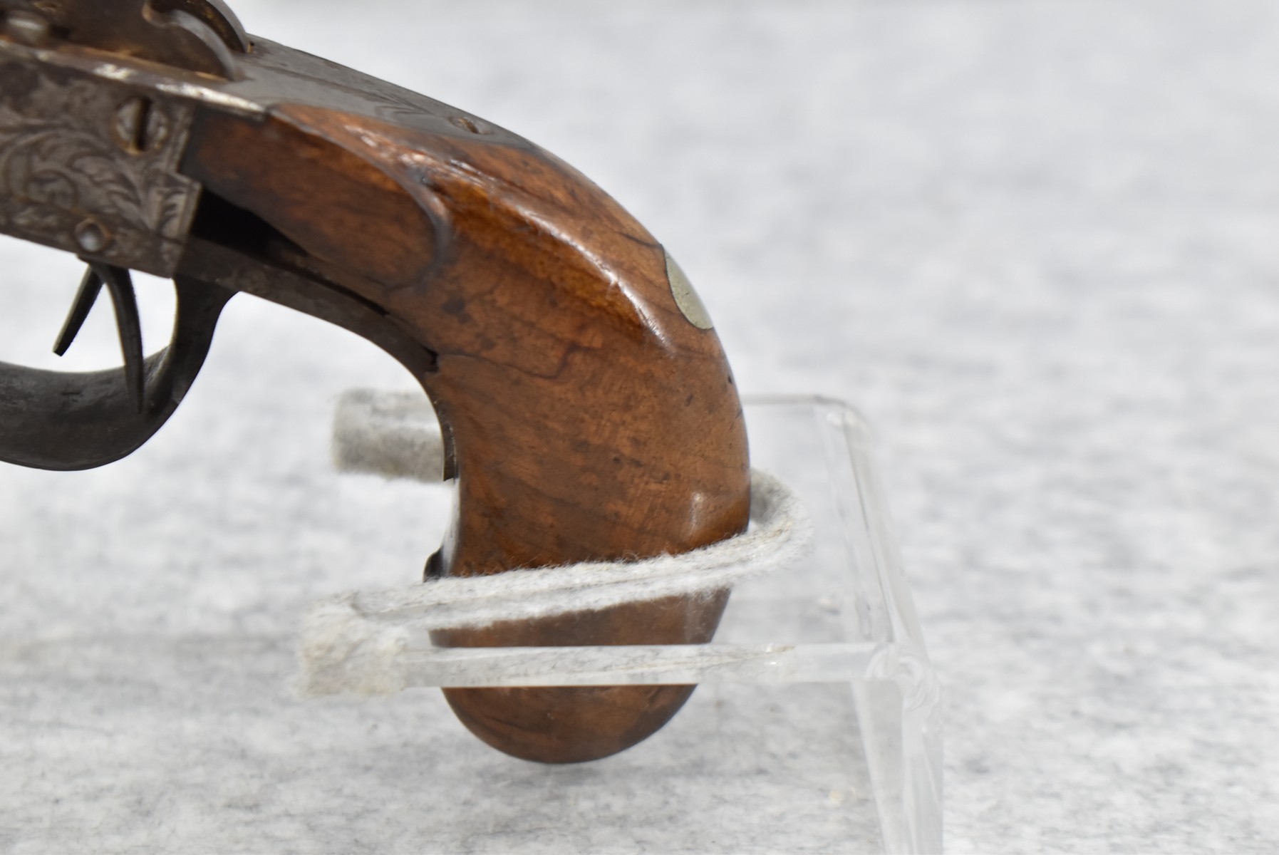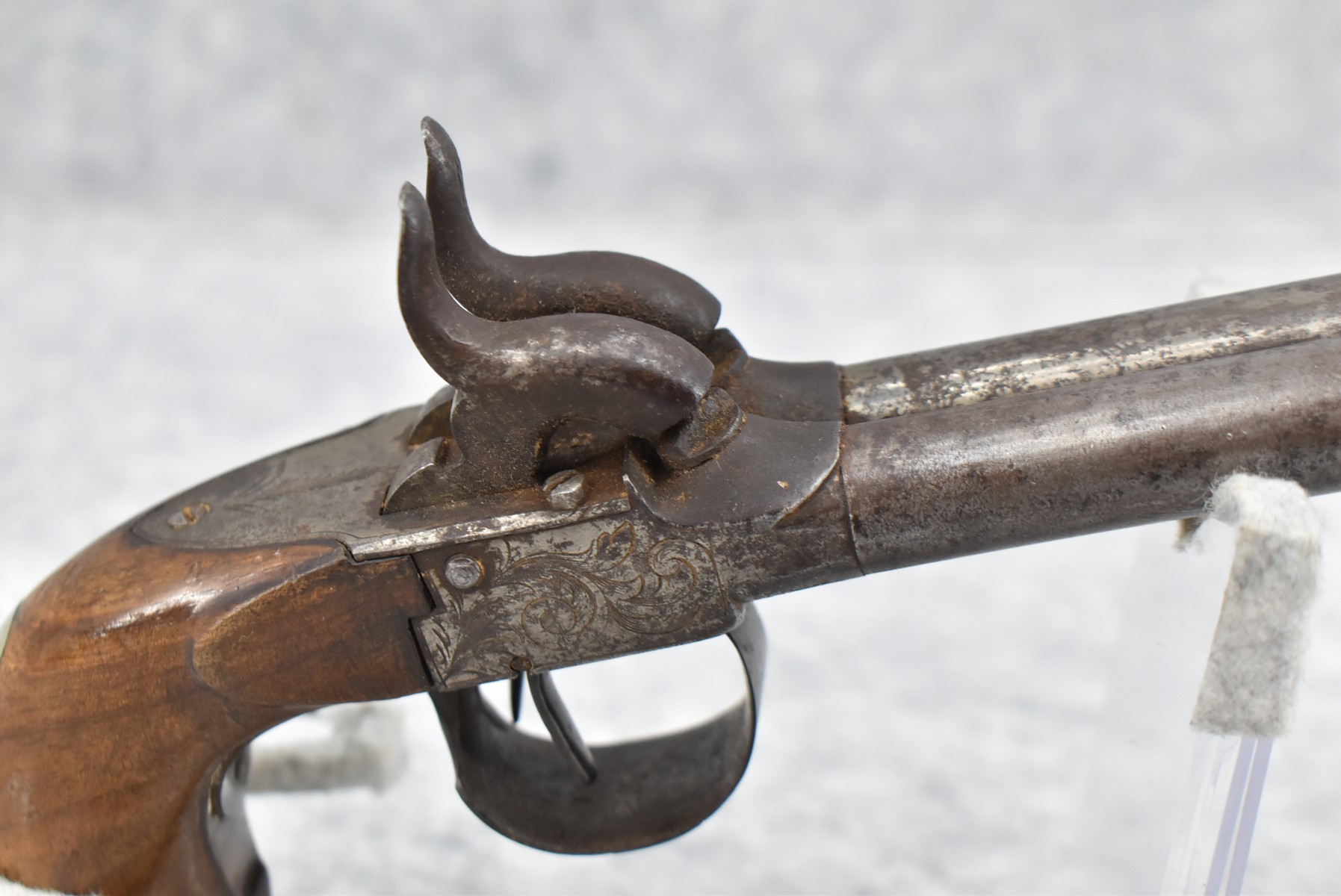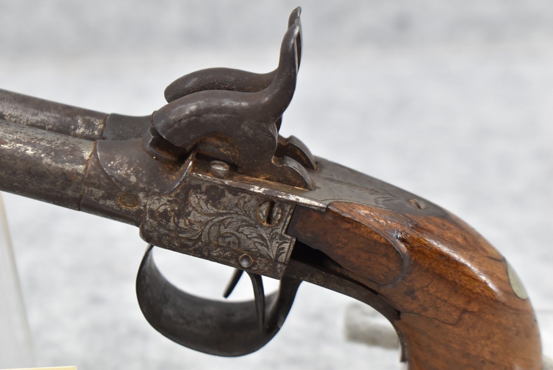 460. 41 Cal. Belgian Double Barrel Percussion Pistol – w/3” Barrels – w/Wood Pistol Grip (Cracked & Chipped on Left Side) – w/Double Triggers & Hammers – Note: Left Hammer Doesn’t Stay Cocked & Left Trigger Is Free