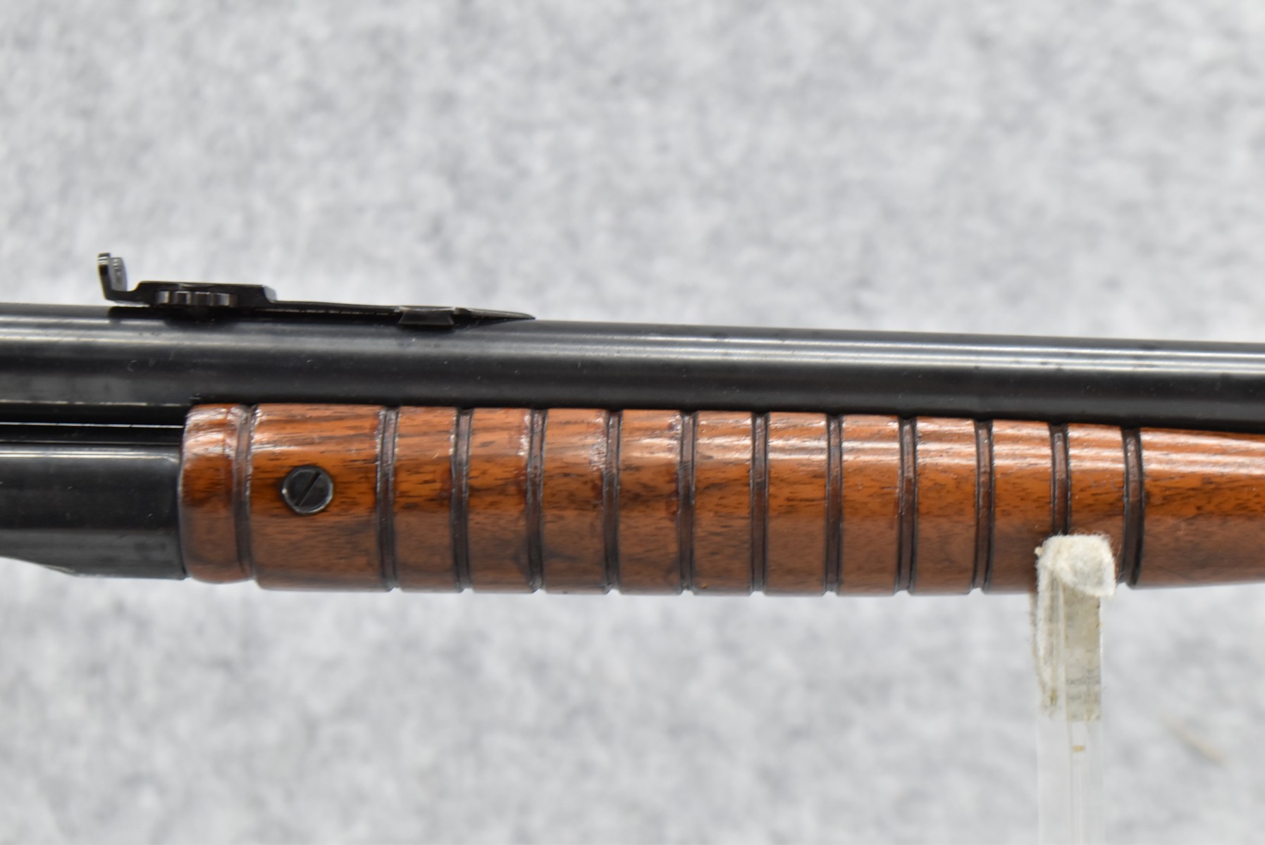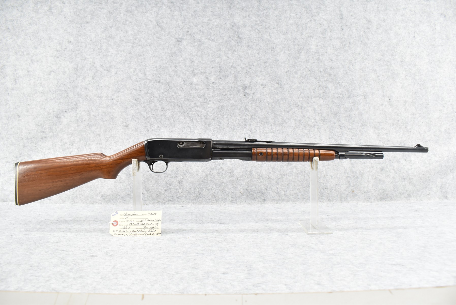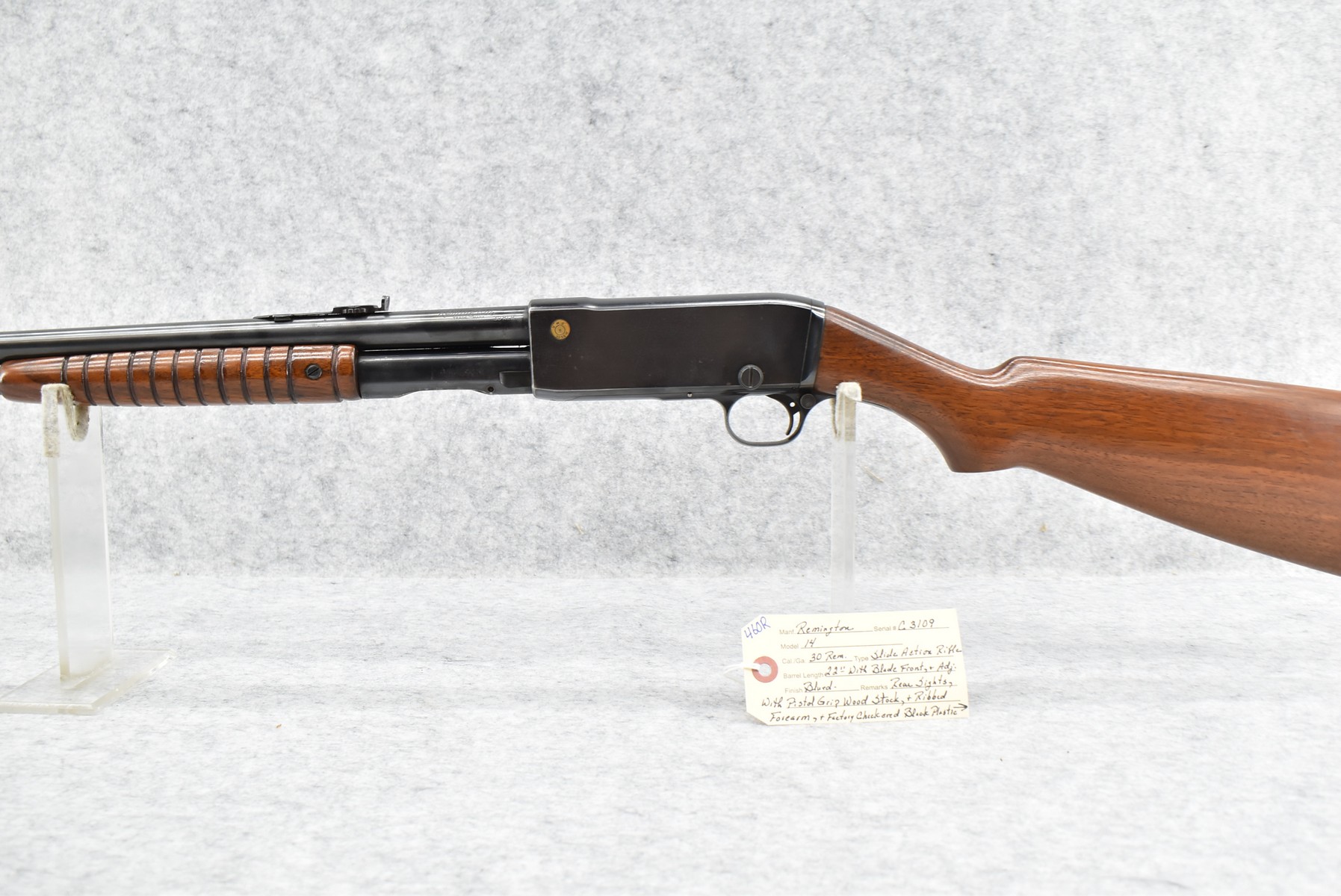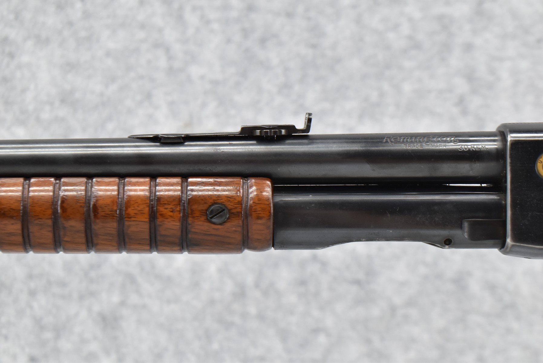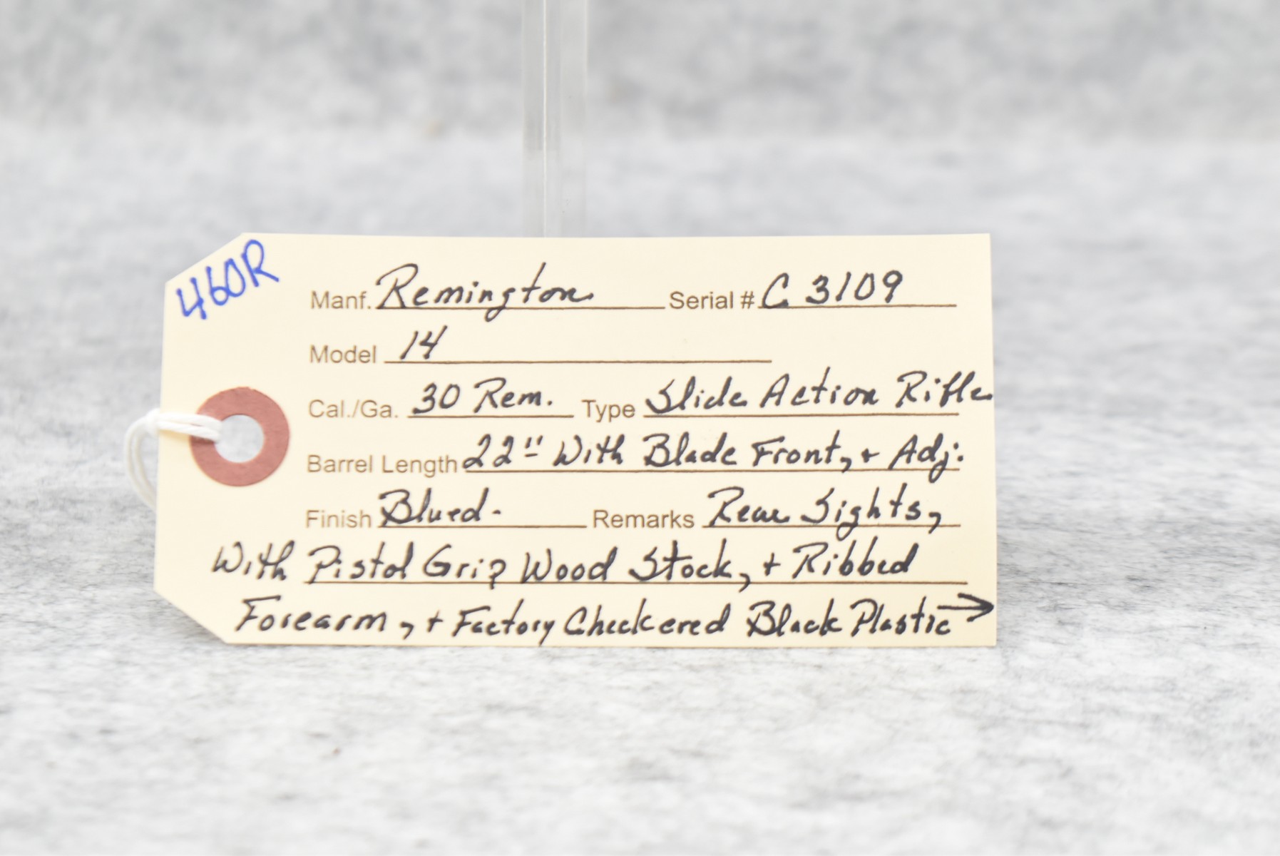 460R. Remington – Mod. 14 – 30 Rem. Cal. Pump Action Rifle – w/22” Barrel w/Blade Front & Adj. Rear Sights – Blued Finish – w/Pistol Grip Wood Stock & Ribbed Forearm w/Factory Checkered Butt Plate