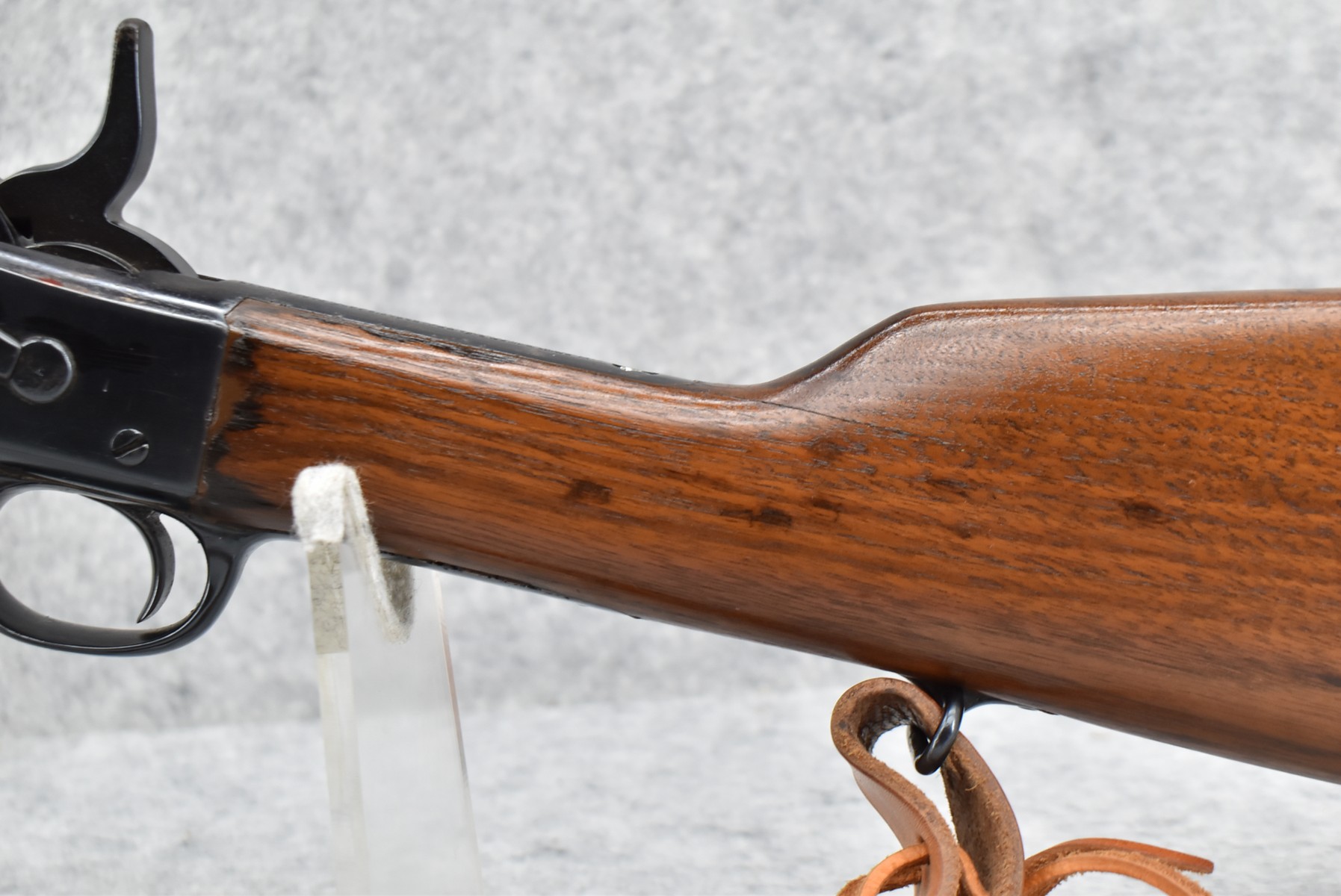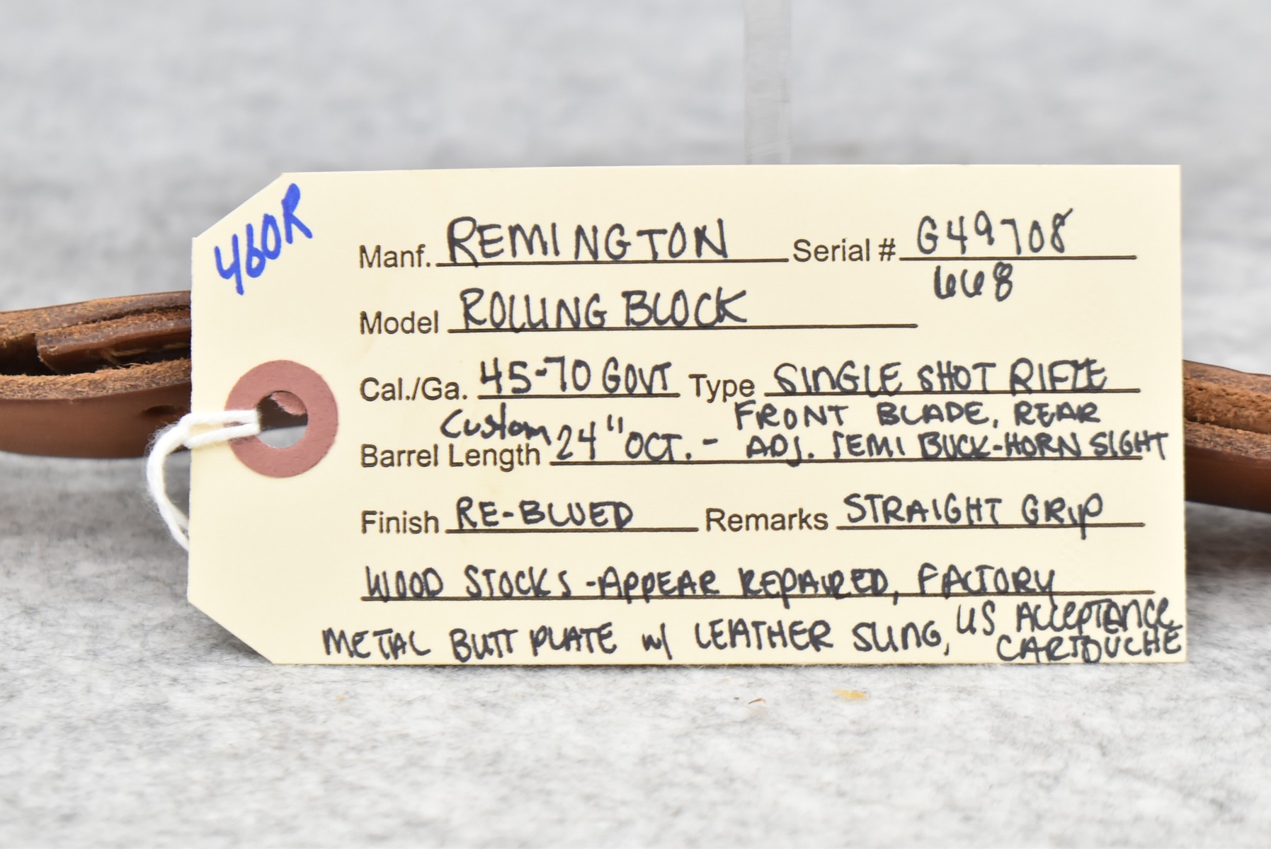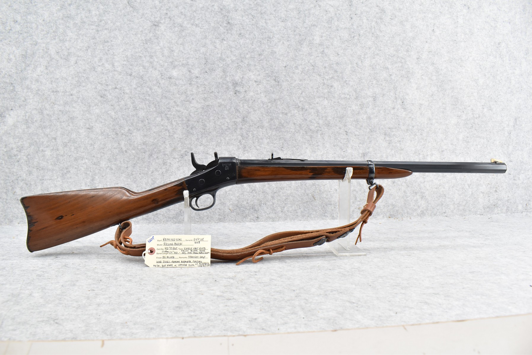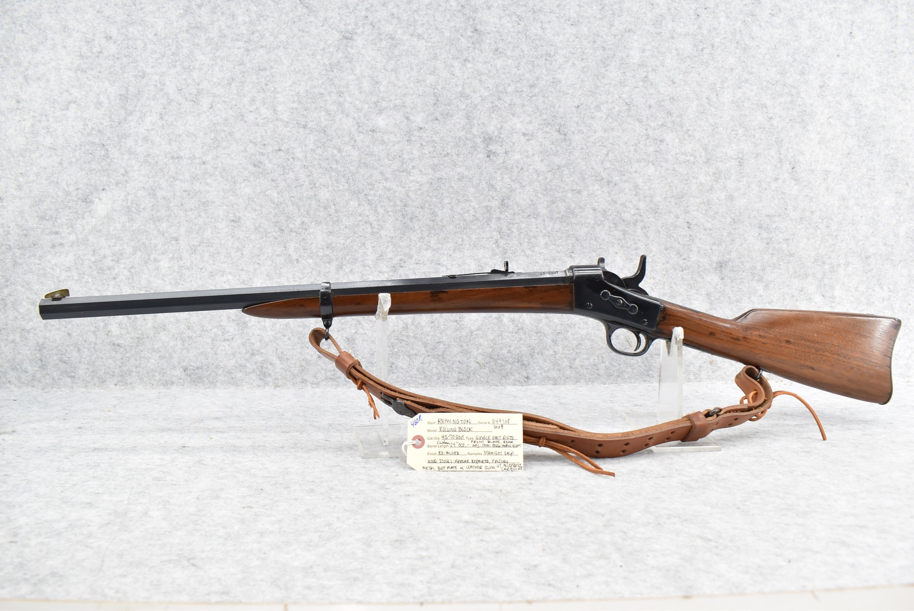 460R. Remington – Mod. Rolling Block – 45-70 Govt Cal. Single Shot Rifle – w/Custom 24” Octagon Barrel w/Front Blade & Rear Adj. Semi-Buckhorn Sights – Re-Blued Finish – w/Straight Grip Wood Stocks w/Factory Metal Butt Plate – w/Leather Sling – w/US Acceptance Cartouches – Note: Stock Appears Repaired