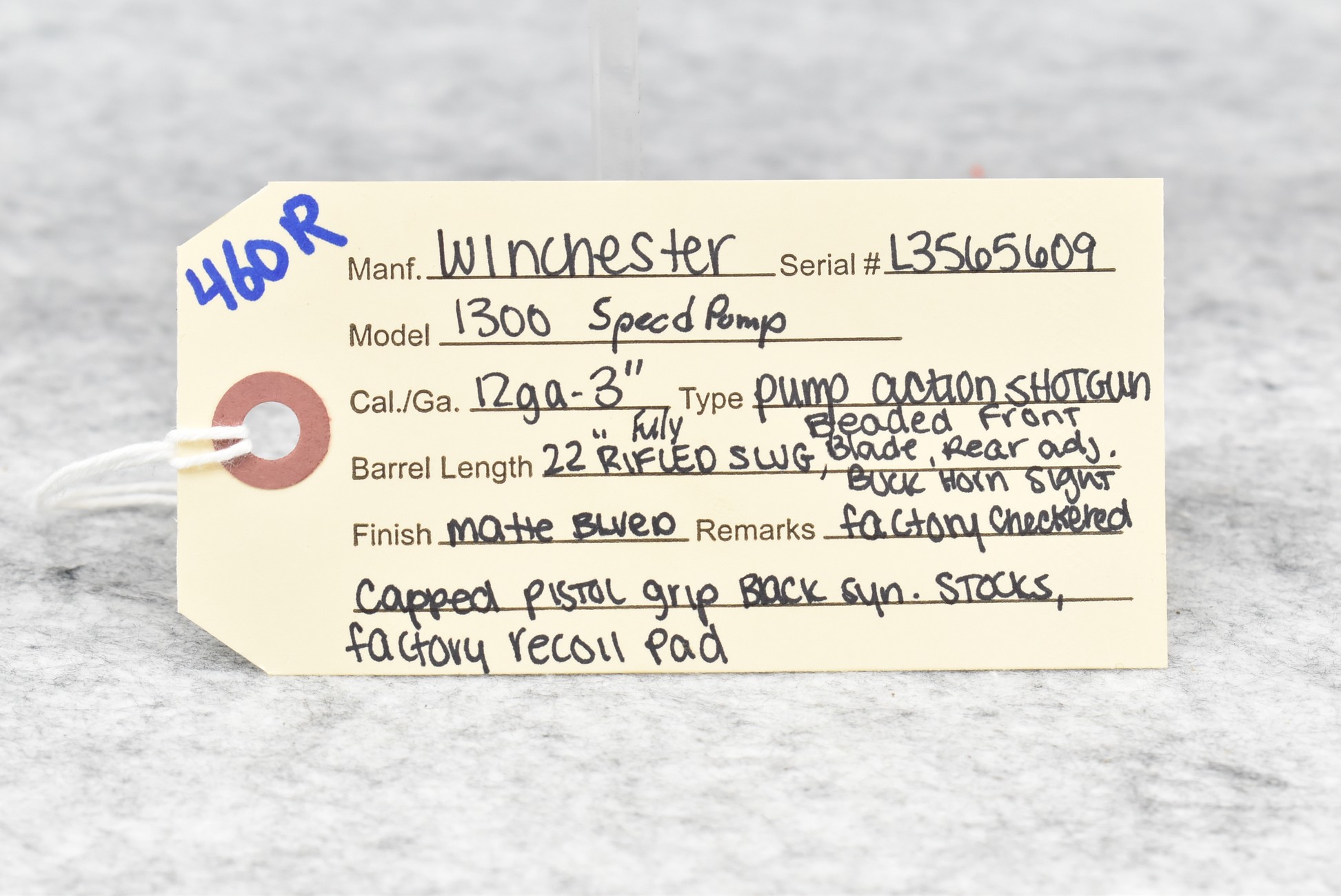 460R. Winchester – Mod. 1300 Speed Pump – 12ga. 3” Pump Action Shotgun – w/22” Fully Rifled Slug Barrel w/Beaded Front & Blade Rear Adj. Buckhorn Sights – Matte Blued Finish – w/Factory Checkered Capped Pistol Grip Black Synthetic Stocks w/Factory Recoil Pad