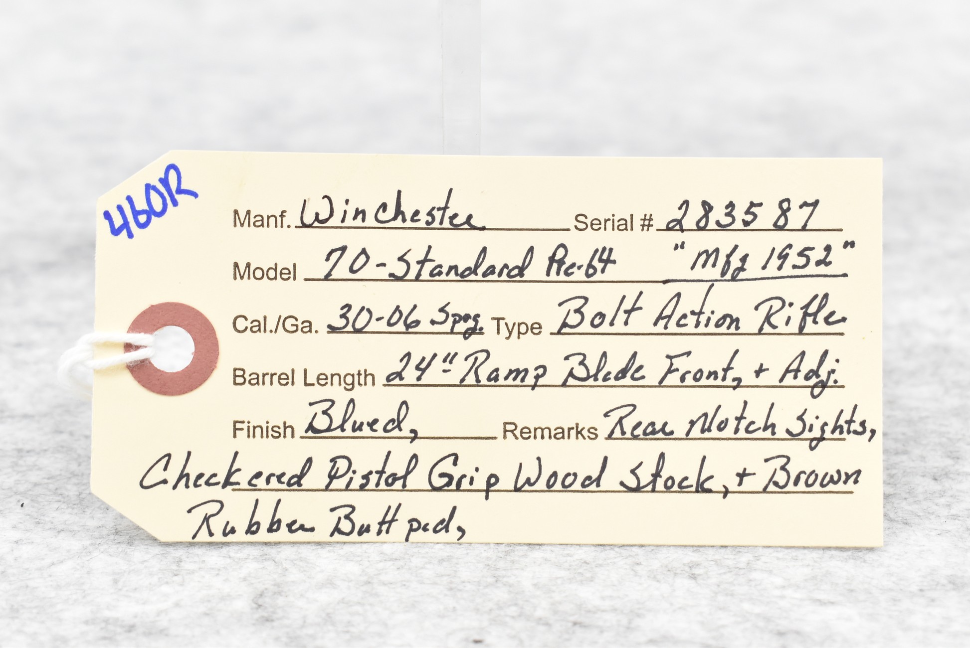 460R. Winchester – Mod. 70 Standard Pre-64 – 30-06 Cal. Bolt Action Rifle – w/24” Barrel w/Ramp Blade Front and Adjustable Rear Notch Sights – Blued Finish – w/Checkered Pistol Grip Wood Stock w/Butt Pad – Manufactured 1952