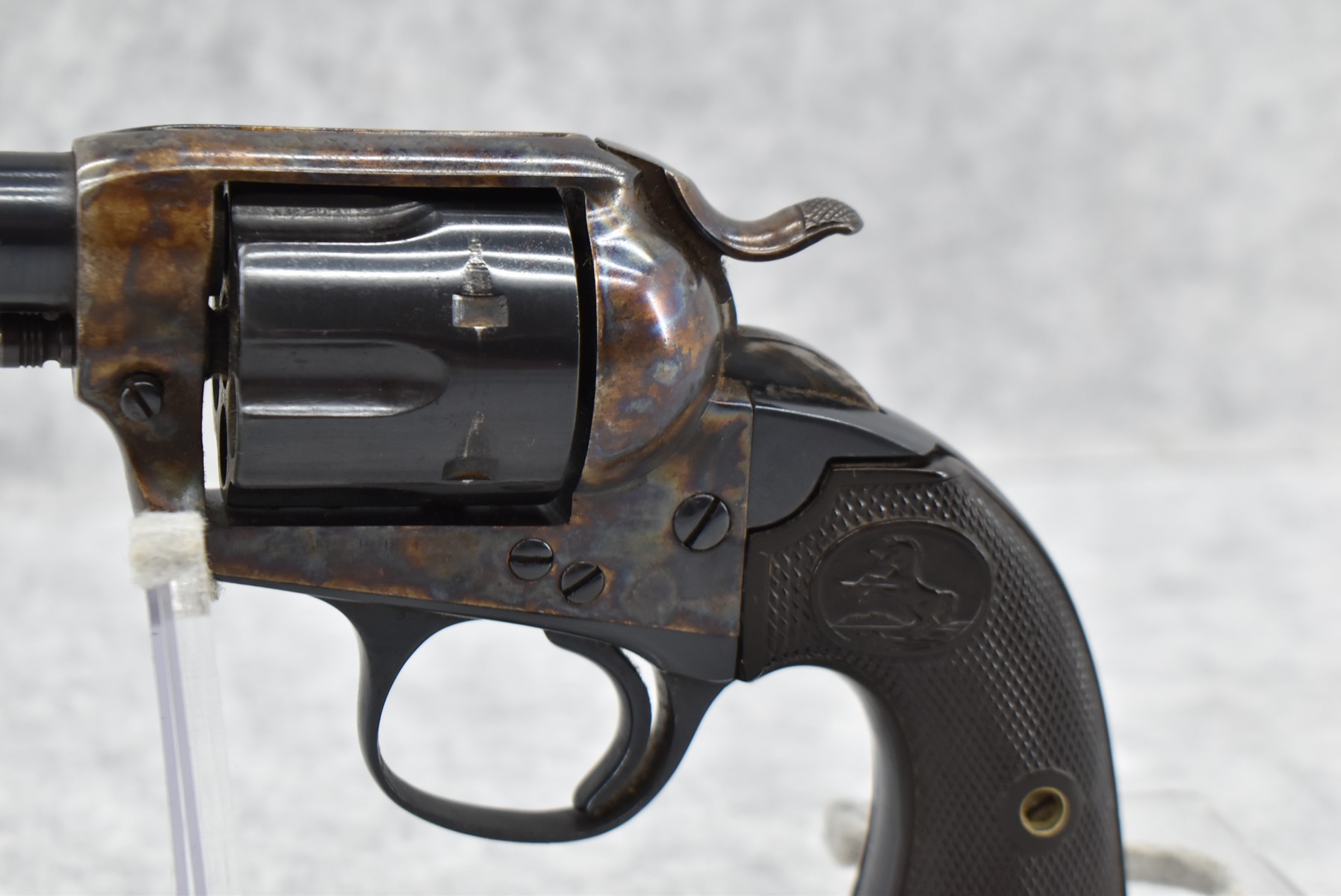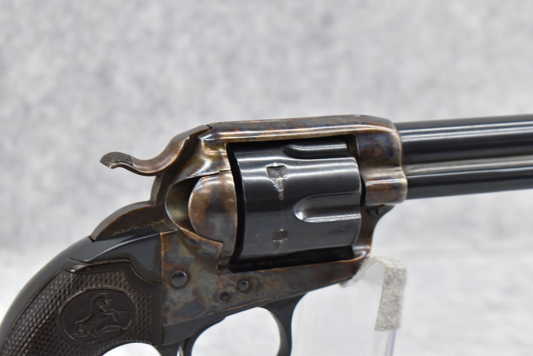 461R.     Colt – Mod. Bisley Single Action Army – 38 WCF (38-40) Cal. Single Action Revolver – w/5 ½” Barrel w/Blade Front & Groove Rear Sights – Re-Blued/Re-Case Hardened Finish – w/Factory Checkered Rampant Colt Grips – Mfg. 1907 – Appears All Matching Numbered, Gun Shows to be an Older Restoration