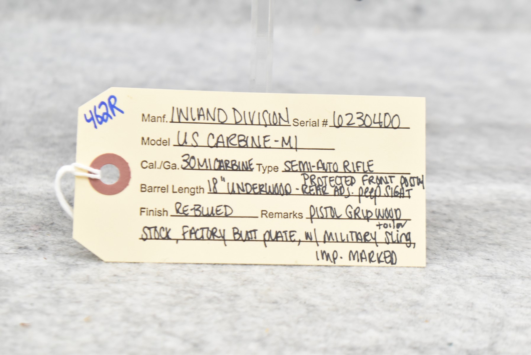 462R. Inland Division – Mod. M1 Carbine – 30 M1 Carbine Cal. Semi-Auto Rifle – w/18” Underwood Barrel w/Protected Front Post & Rear Adj. Peep Sights – Re-Blued Finish – w/Pistol Grip Wood Stock w/Factory Butt Plate – w/Military Sling & Oiler – Import Marked