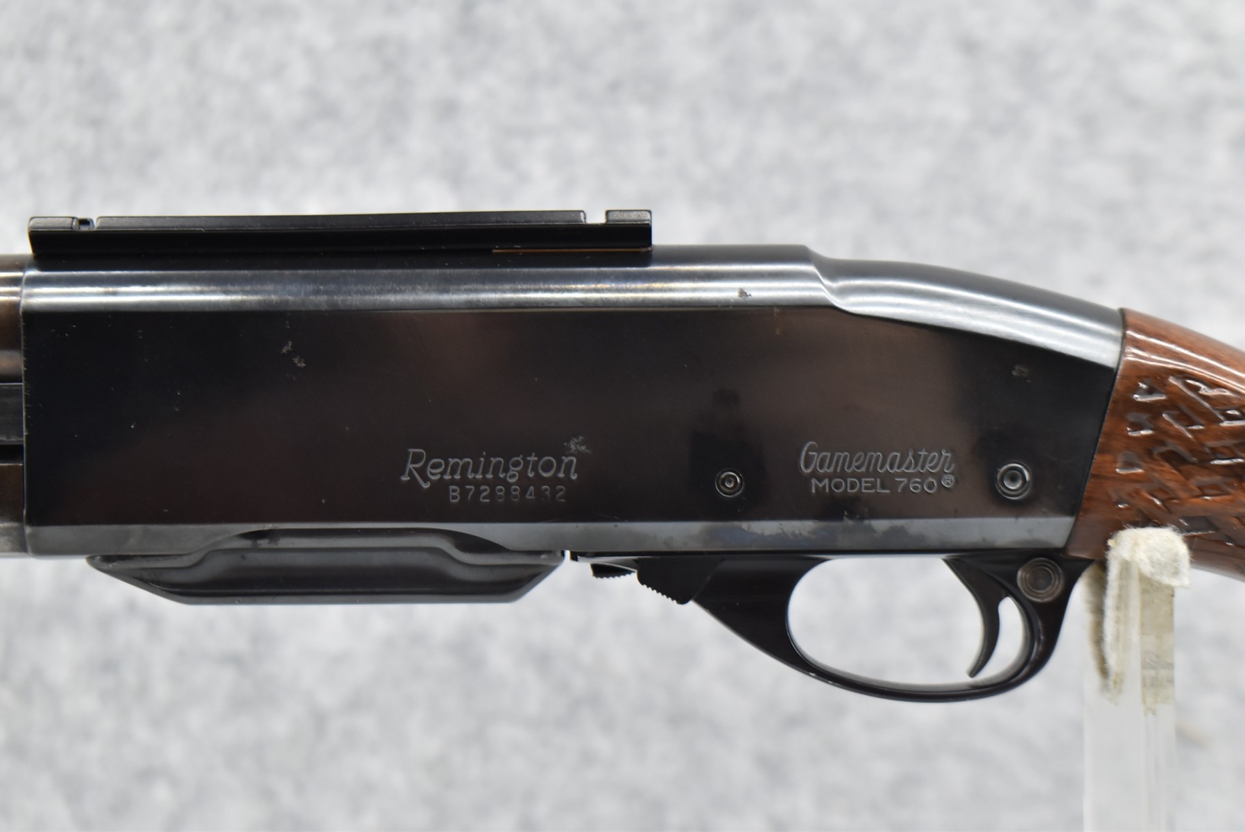 463R. Remington – Mod. 760 Gamemaster – 308 Win. Cal. Pump Action Rifle – w/22” Barrel w/Ramp Blade Front & Adj. Rear Sights – Blued Finish – w/Basketweave Checkered Capped Pistol Grip Deluxe Wood Stocks w/Raised Cheek Piece w/Factory Butt Plate – w/Factory Detachable Magazine – w/Scope Mounting Rail