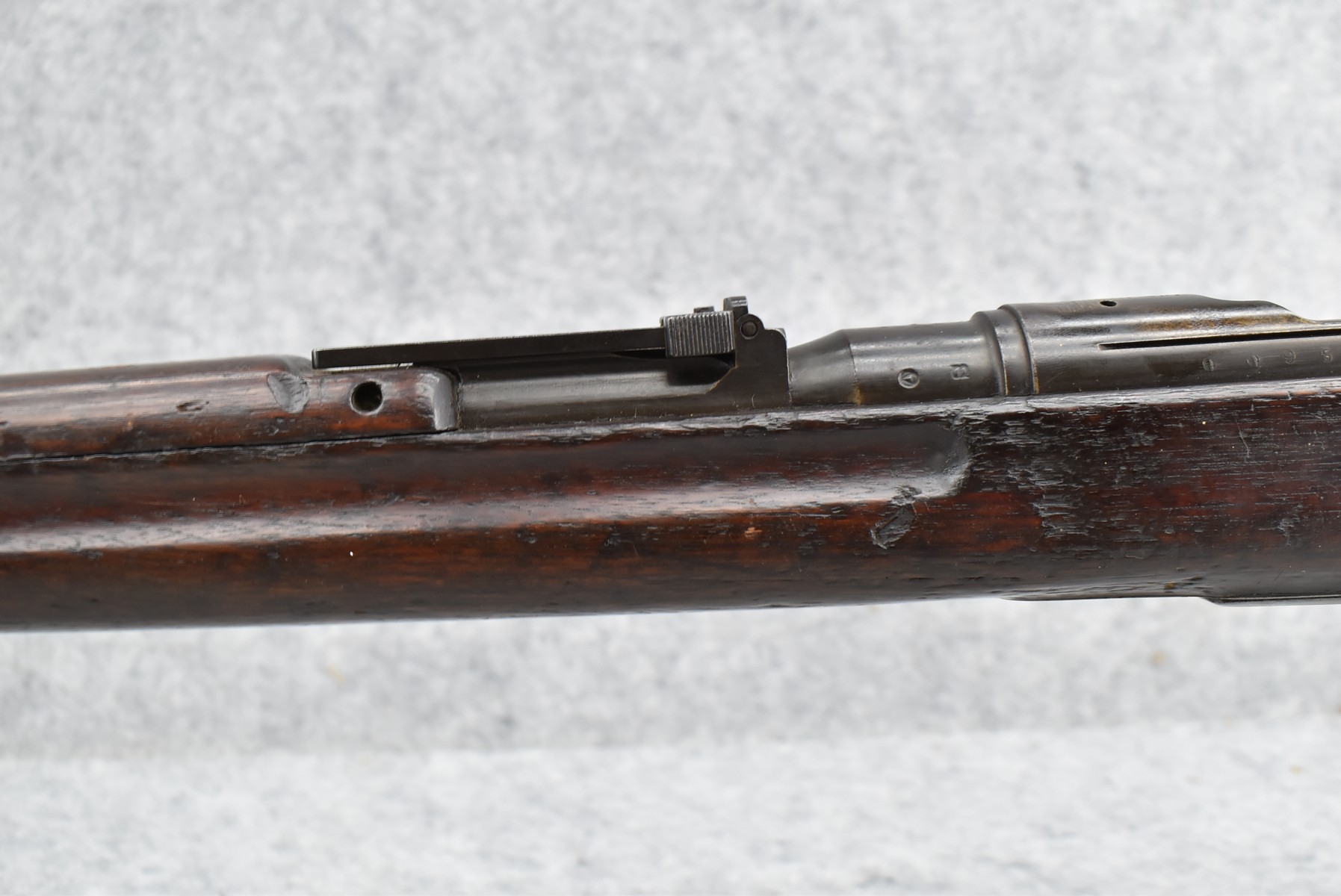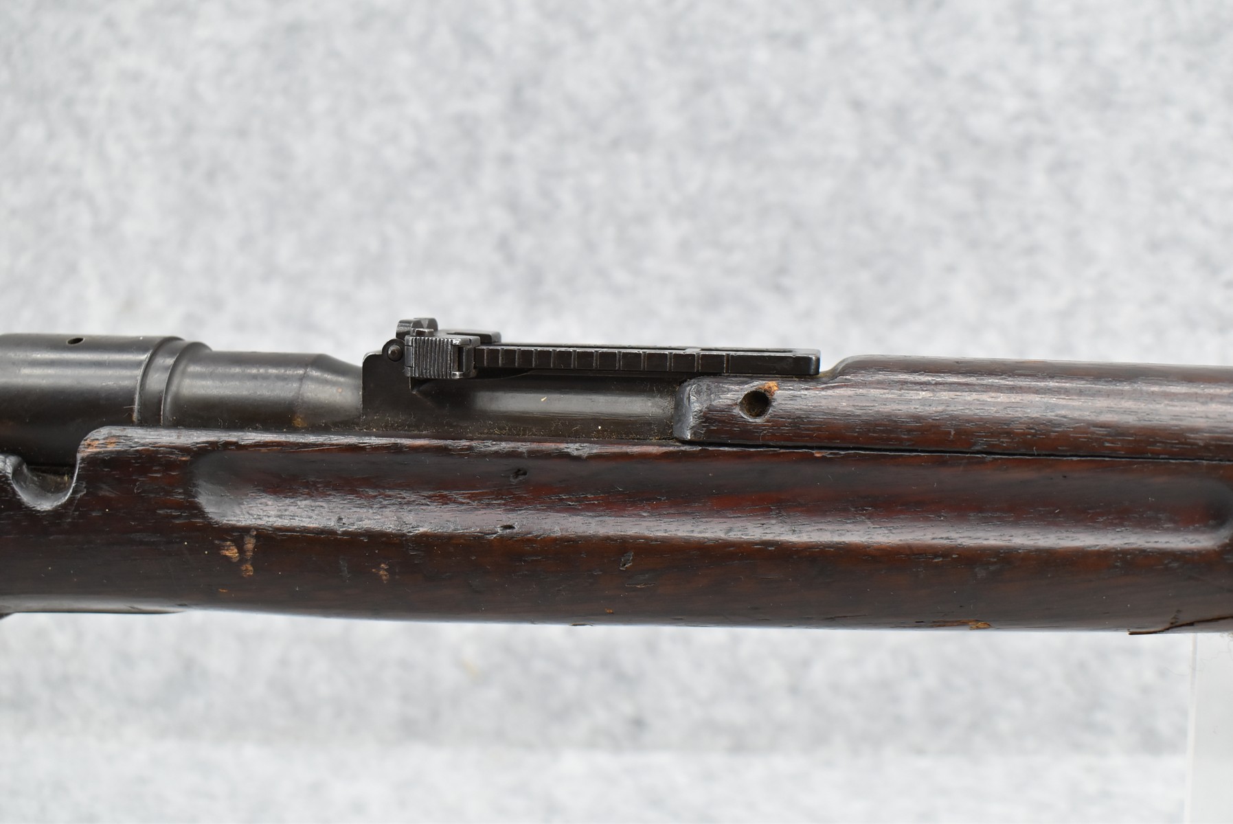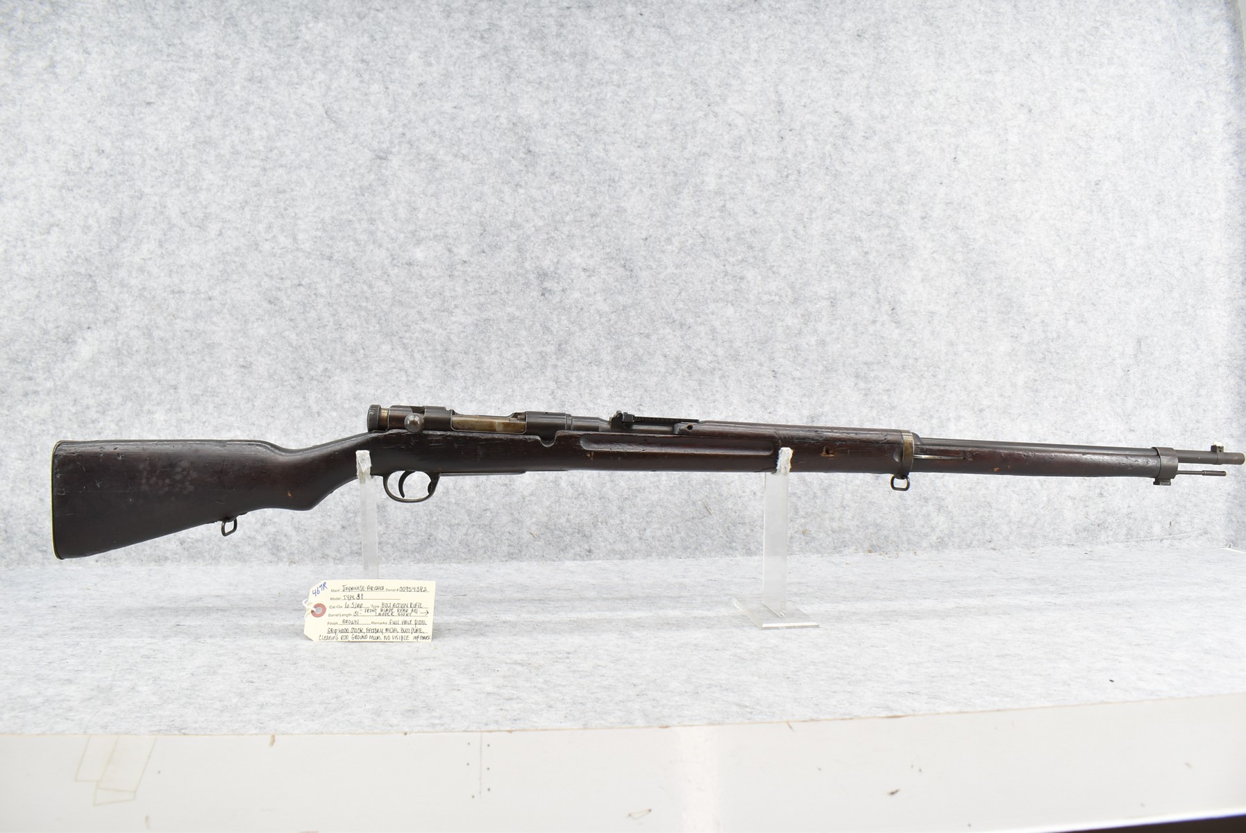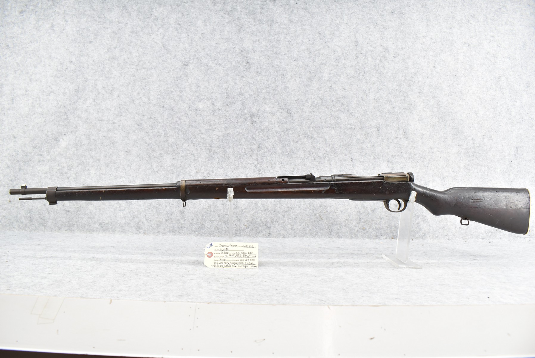 467R. Arisaka – Type 38 – 6.5 Jap Cal. Bolt Action Rifle – w/31” Barrel w/Front Blade & Rear Adj. Ladder Sights – Brown Finish – w/Full Half Pistol Grip Wood Stock w/Factory Metal Butt Plate – w/Cleaning Rod – Ground Mum – No Visible Import Mark – Note: Battle Damage on Right Side of Forearm