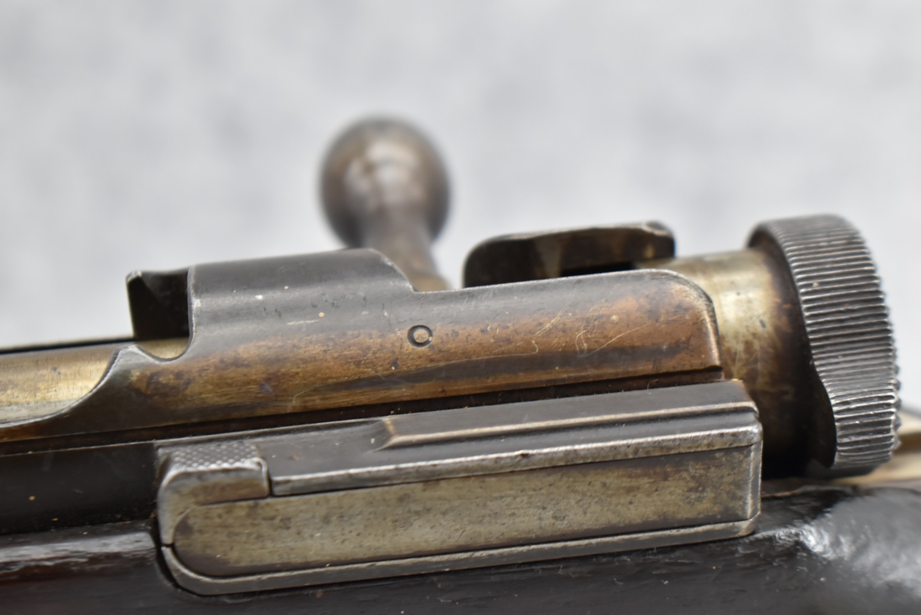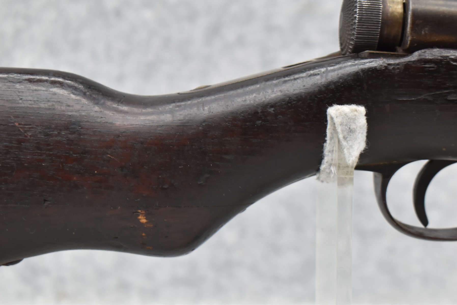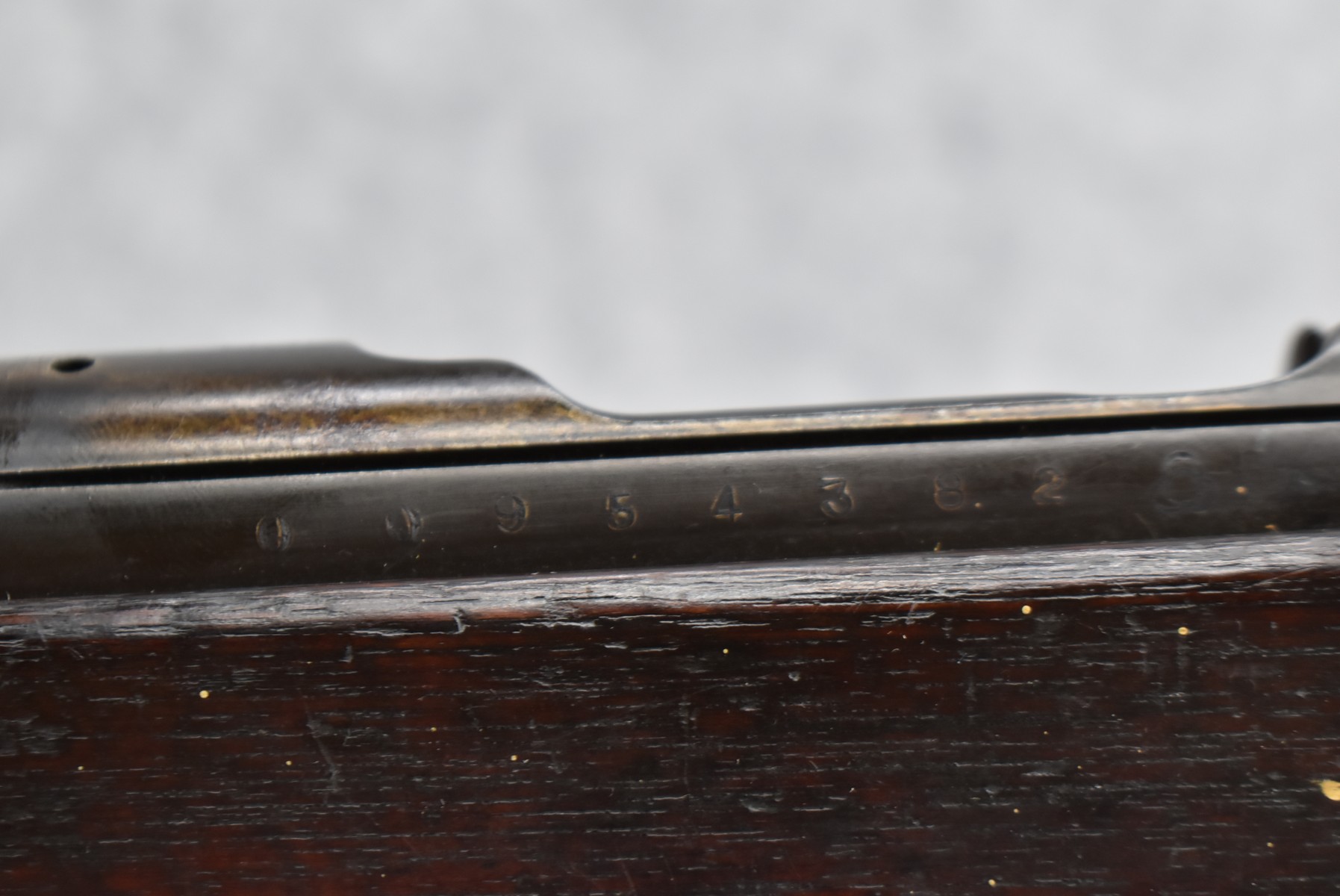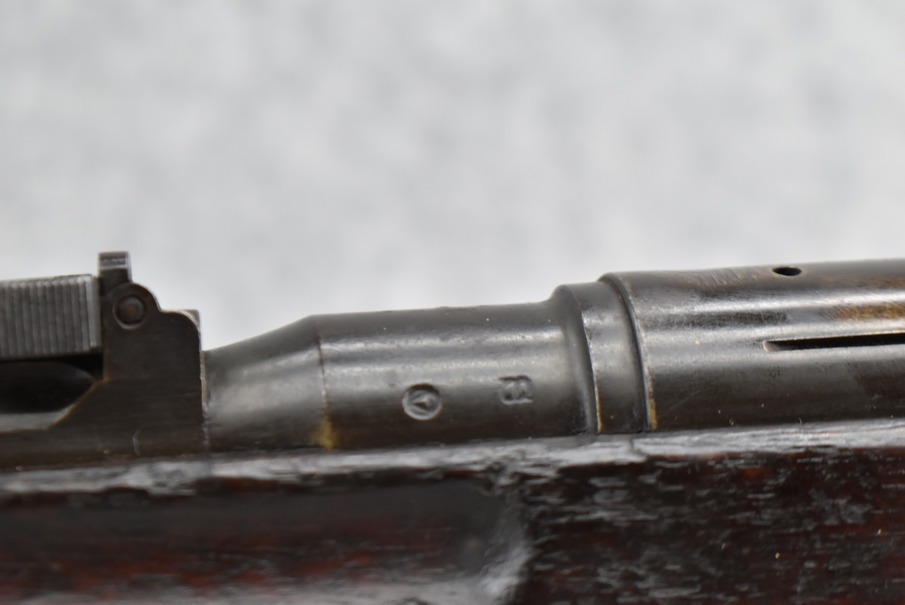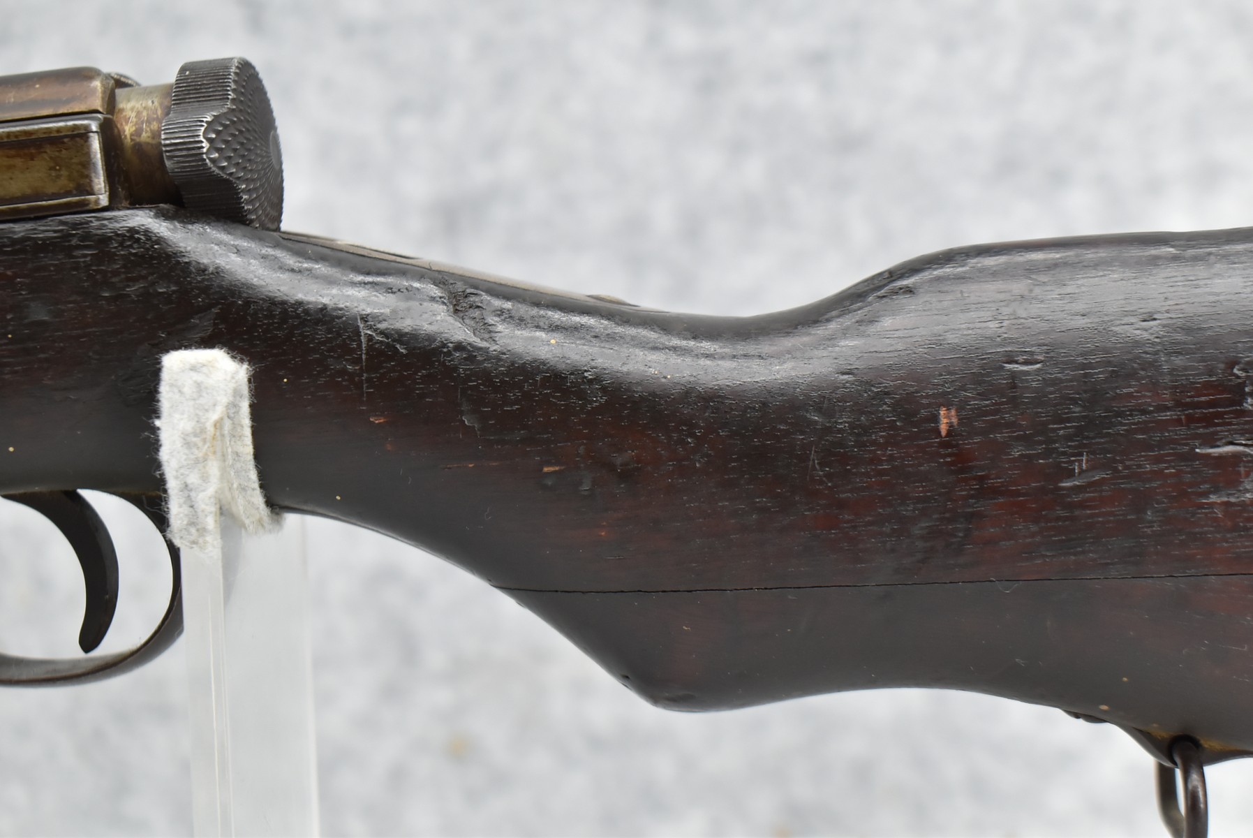 467R. Arisaka – Type 38 – 6.5 Jap Cal. Bolt Action Rifle – w/31” Barrel w/Front Blade & Rear Adj. Ladder Sights – Brown Finish – w/Full Half Pistol Grip Wood Stock w/Factory Metal Butt Plate – w/Cleaning Rod – Ground Mum – No Visible Import Mark – Note: Battle Damage on Right Side of Forearm