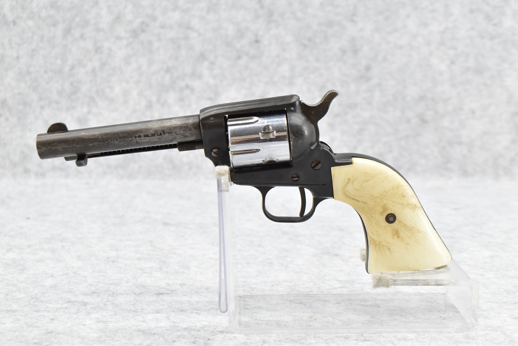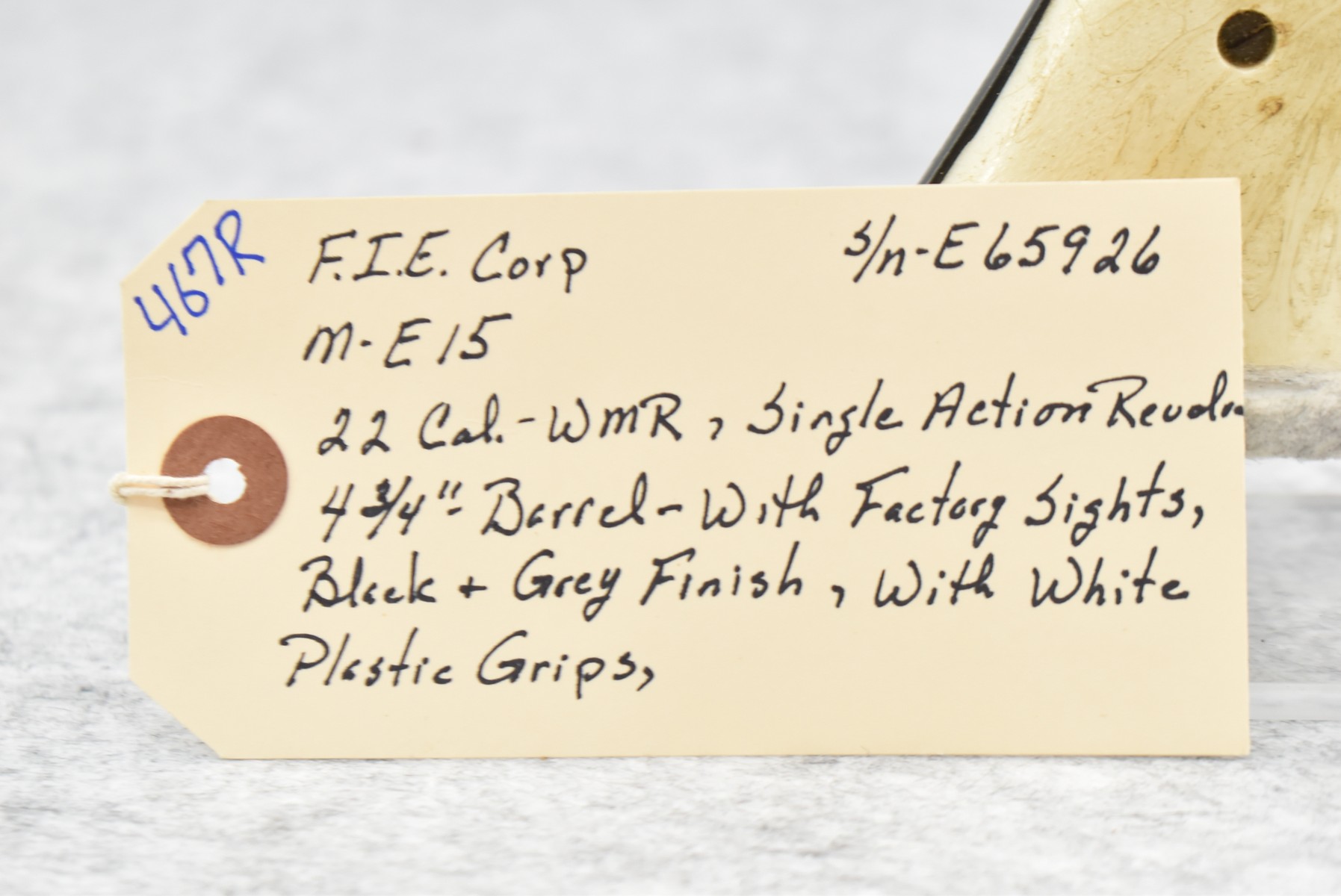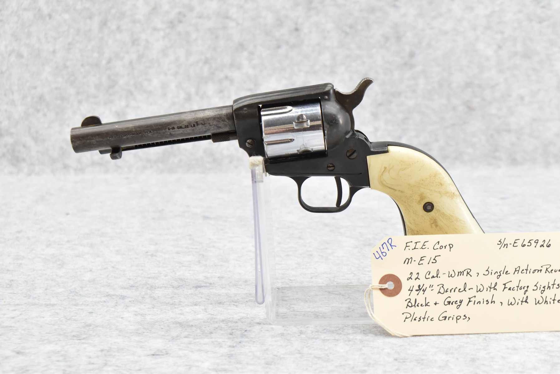 467R. FIE Corp – Mod. E15 – 22 WMR Cal. Single Action Revolver – w/4 ¾” Barrel w/Factory Sights – Black & Gray Finish – w/White Plastic Grips