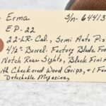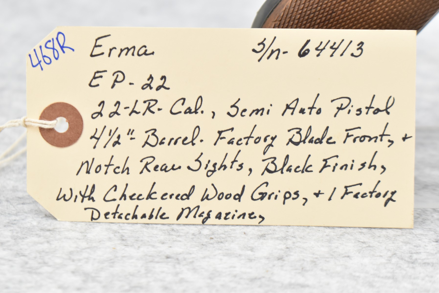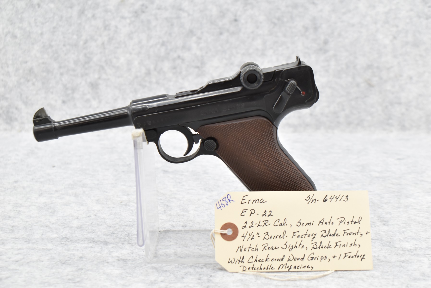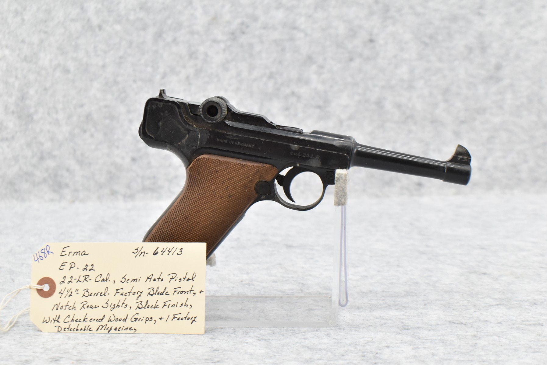 468R. Erma – Mod. EP-22 – 22LR Cal. Semi-Auto Pistol – w/4 ½” Barrel w/Factory Black Front & Notch Rear Sights – Black Finish – w/Checkered Wood Grips – w/Factory Detachable Magazine