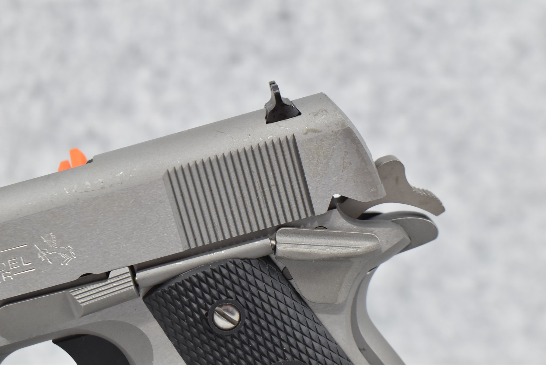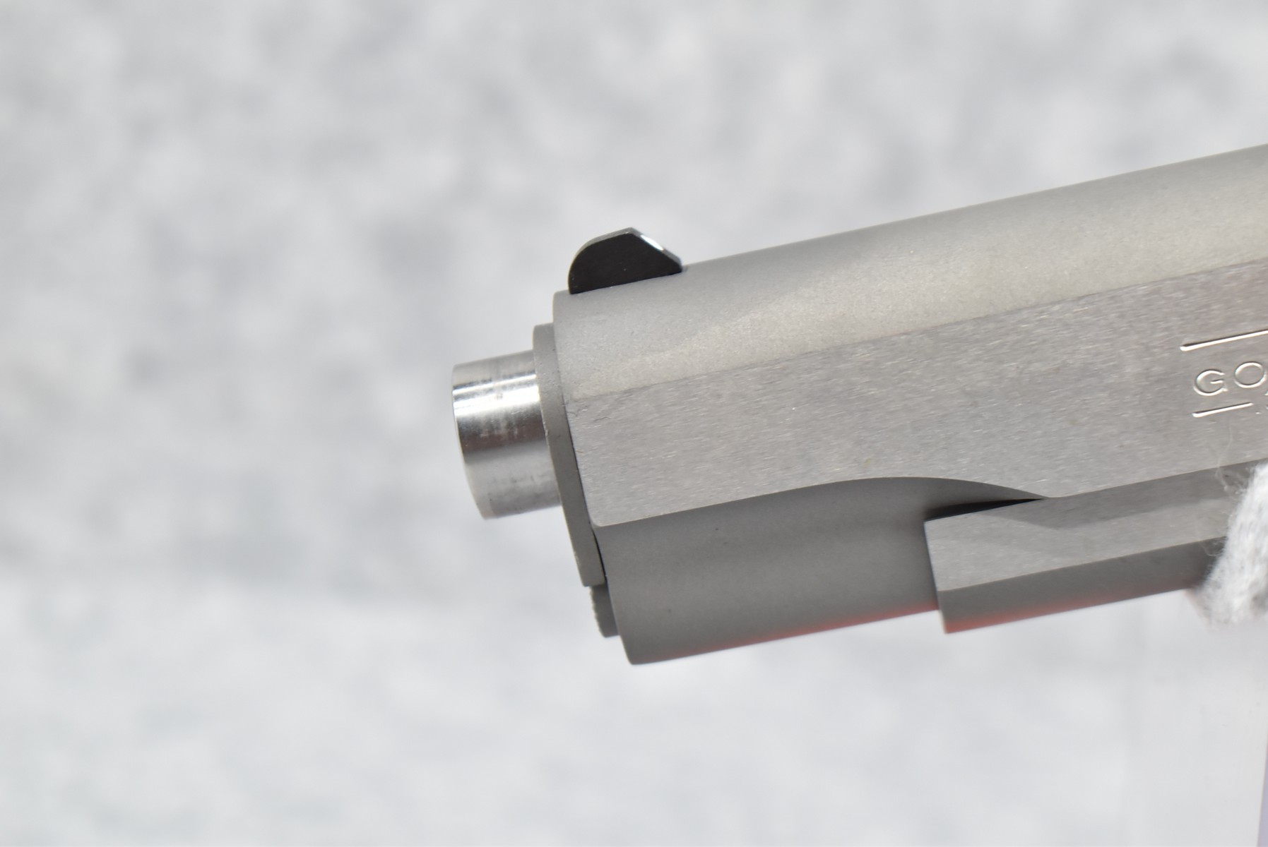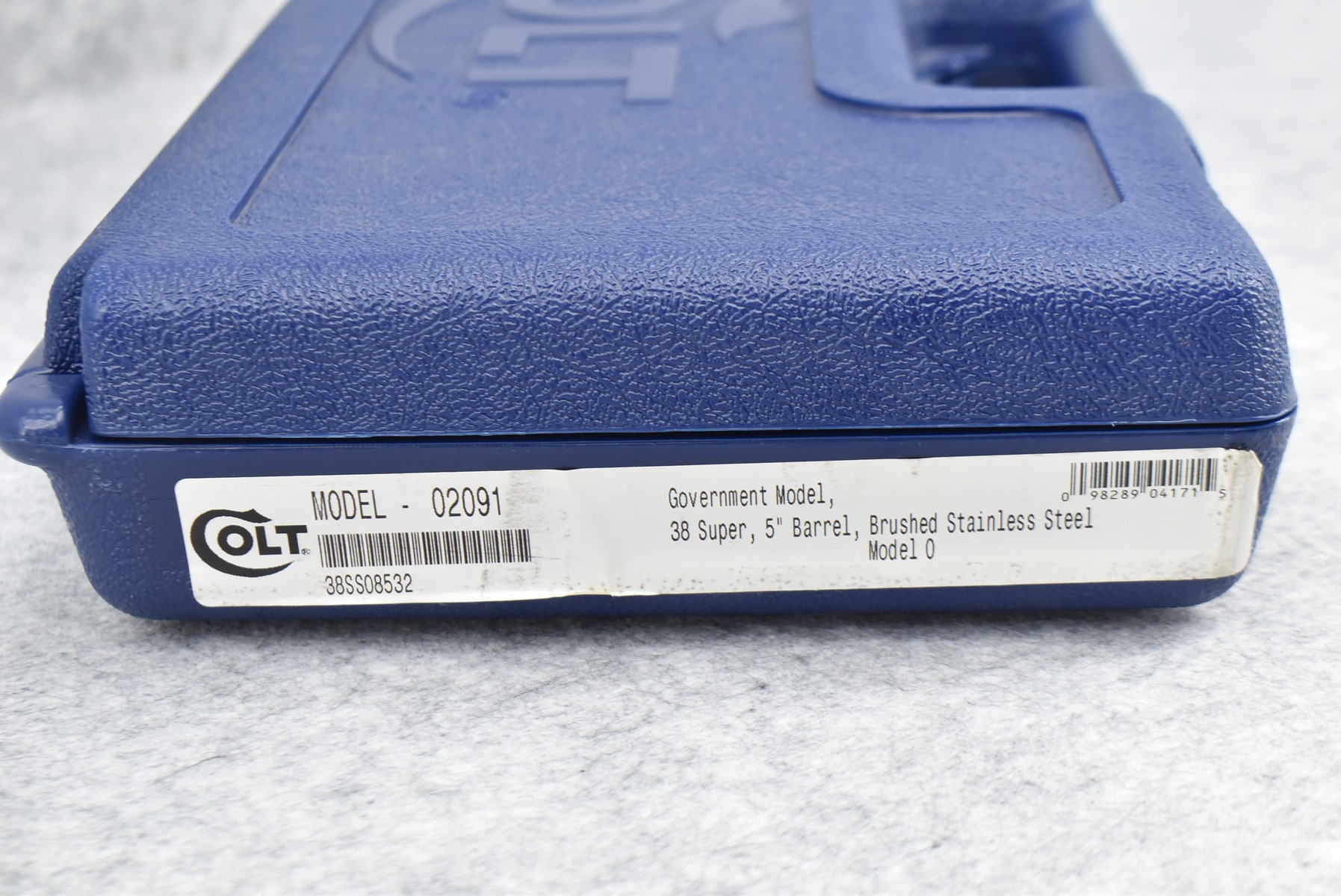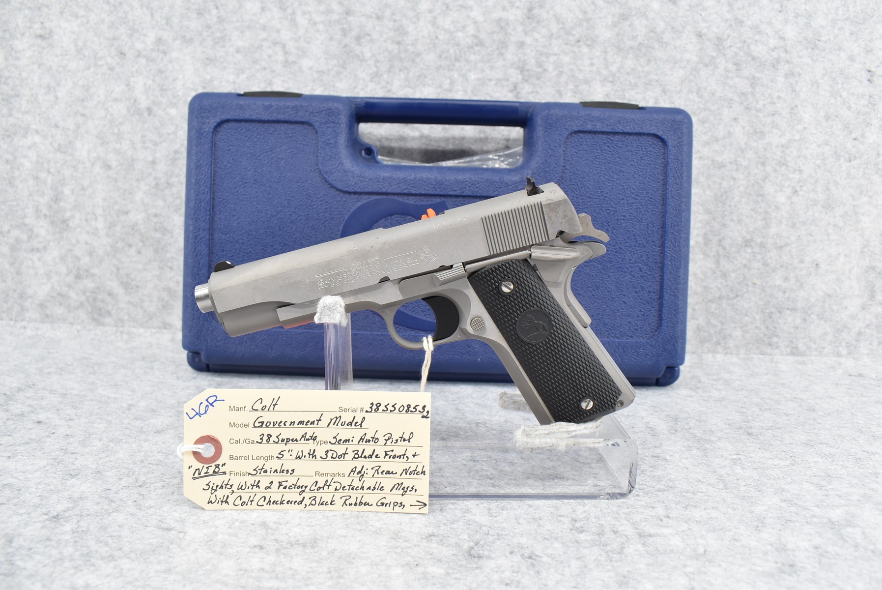 46R. Colt – Government Model – 38 Super Auto Cal. Semi-Auto Pistol – w/5” Barrel w/3-Dot Blade Front & Adj. Rear Notch Sights – Stainless Finish – w/Colt Checkered Black Rubber Grips – w/2 Factory Colt Detachable Mags – New w/Factory Hard Case, Manual & Accessories