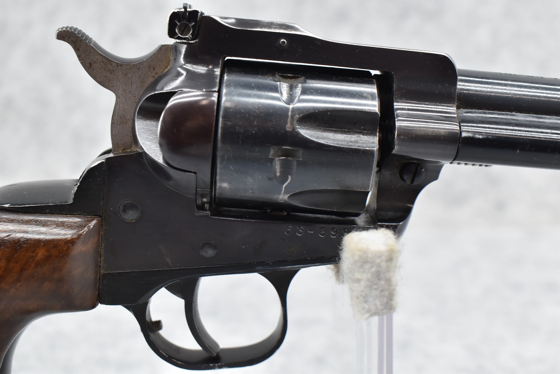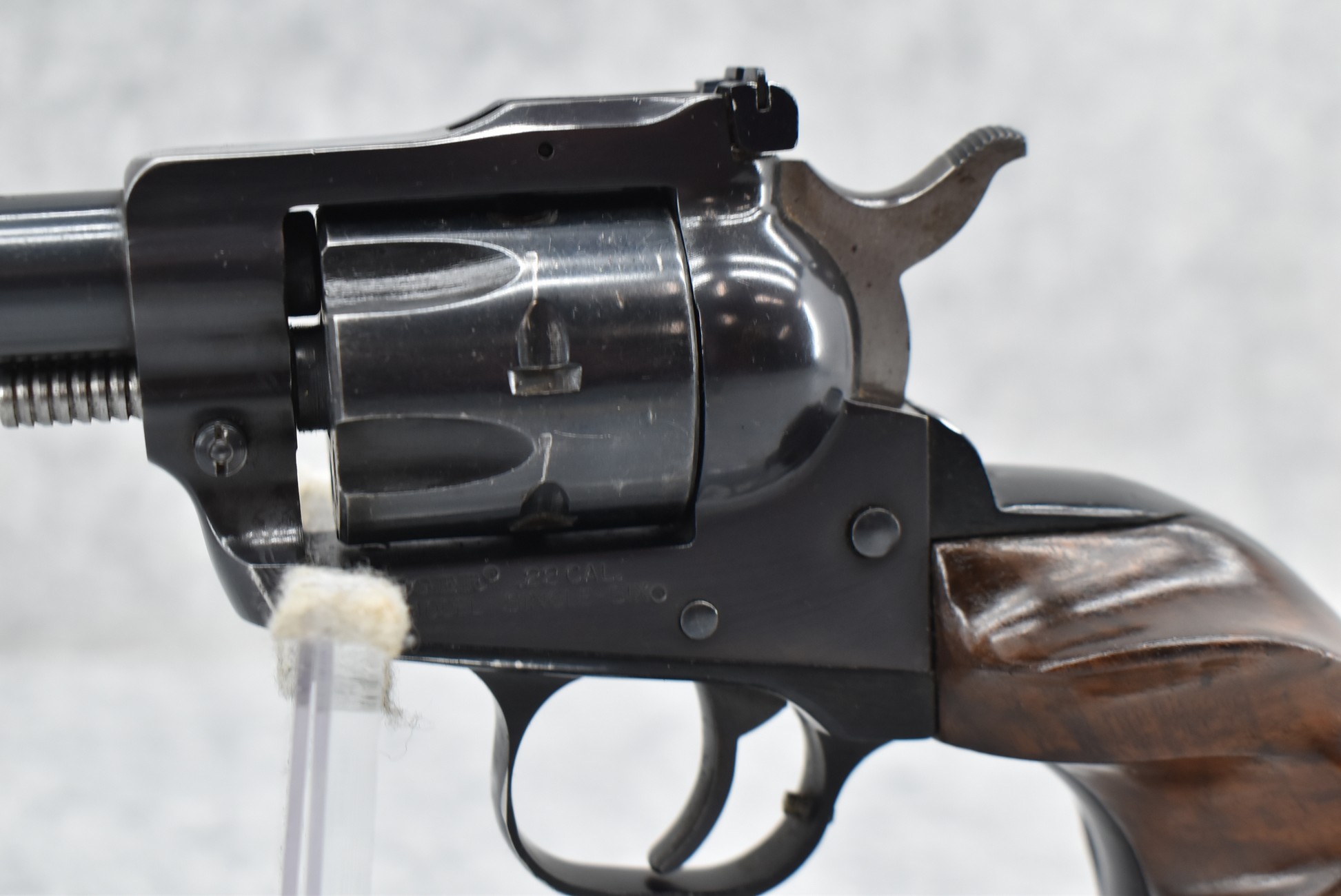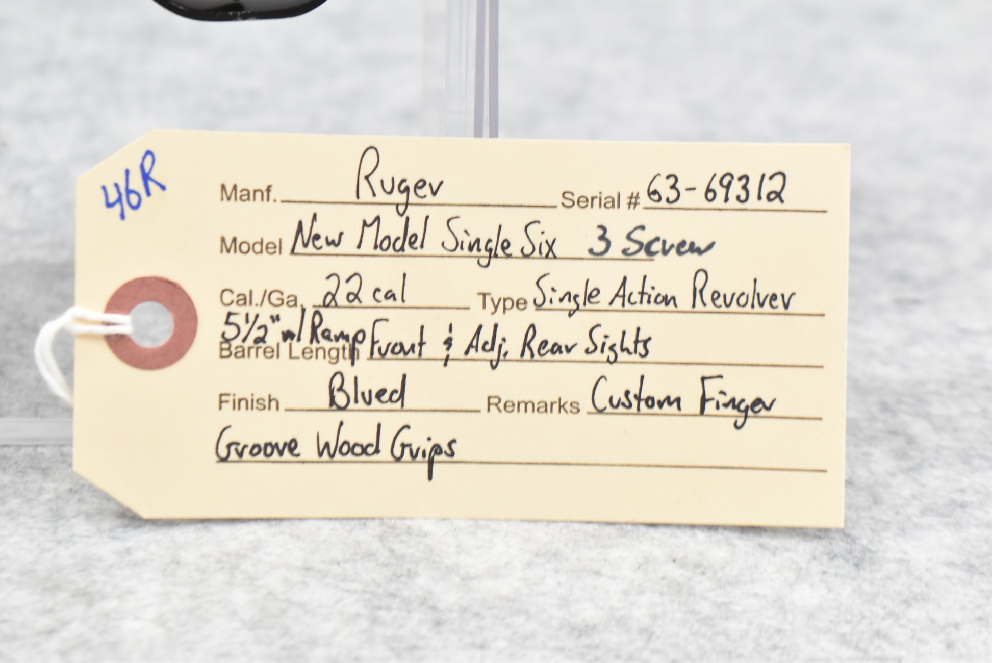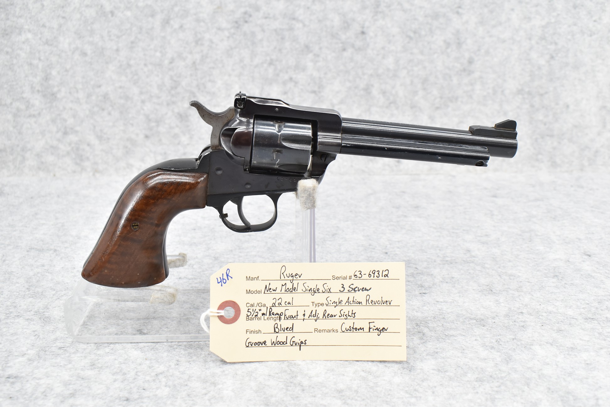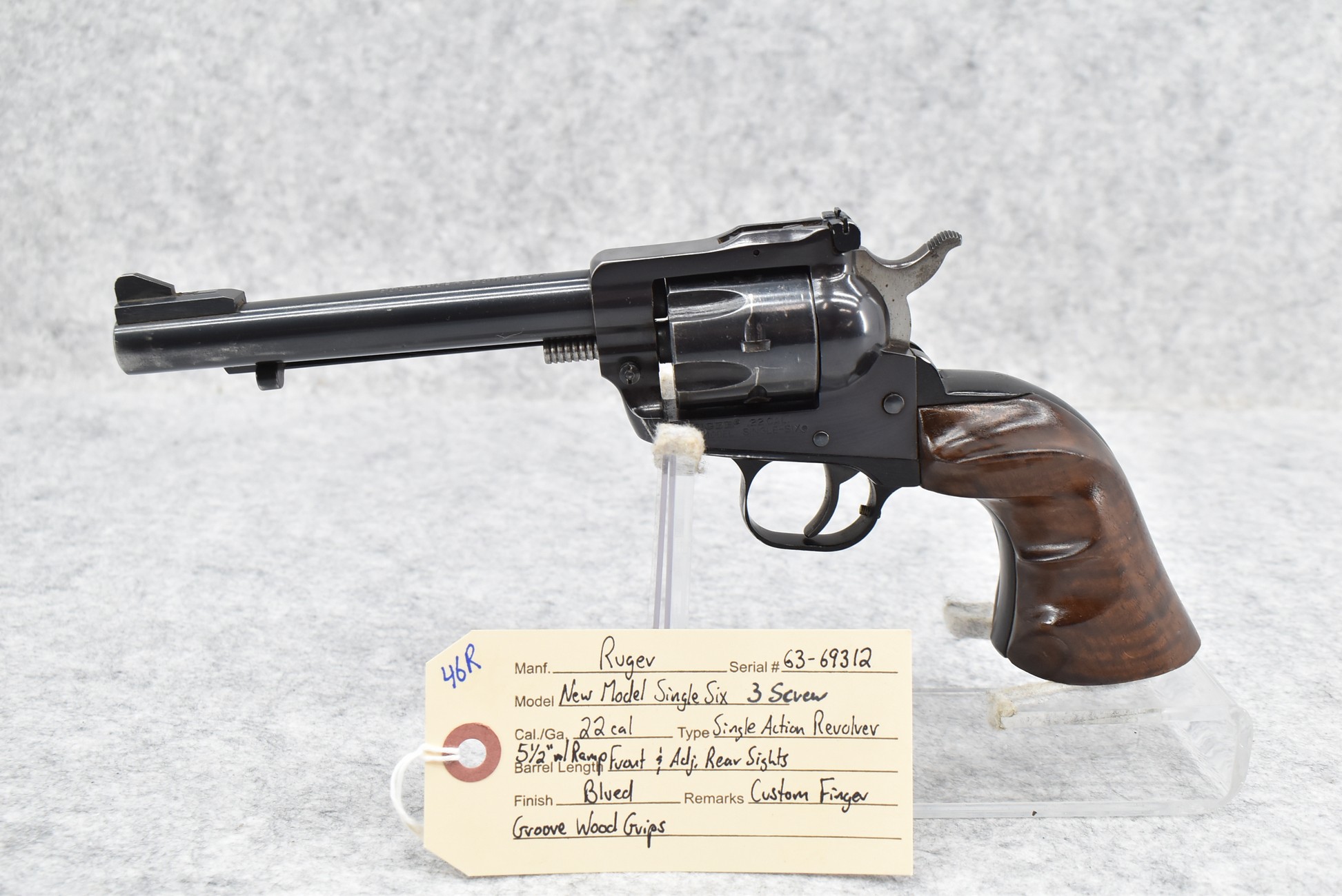 46R. Ruger – New Model Single Six (3 Screw) – 22 Cal. Single Action Revolver – w/5 ½” Barrel w/Ramp Front & Adj. Rear Sights – Blued Finish – w/Custom Finger Groove Wood Grips