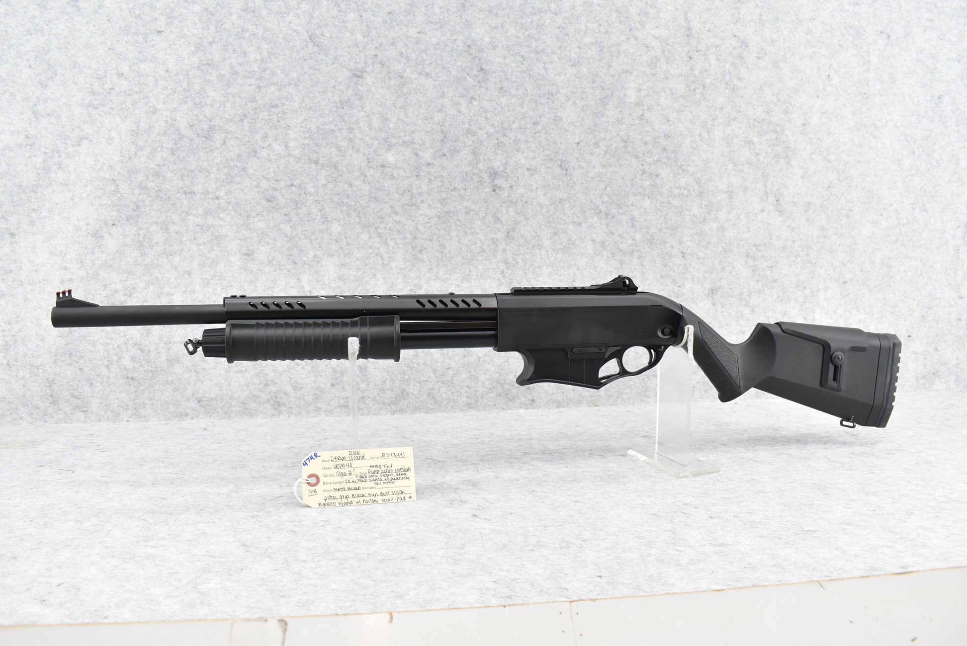474R. Rock Island – Mod. VRPA40 – 12ga. 3” Pump Action Shotgun – w/20” Barrel w/Fiber Optic Front & Rear Peep Sights – Matte Blued Finish – w/Pistol Grip Black Synthetic Butt Stocks w/Factory Recoil Pad – w/Picatinny Rail Mount – Unfired w/Factory Box, Manual & Two 5Rd Detachable Mags