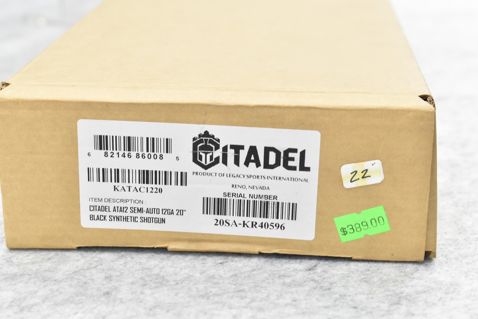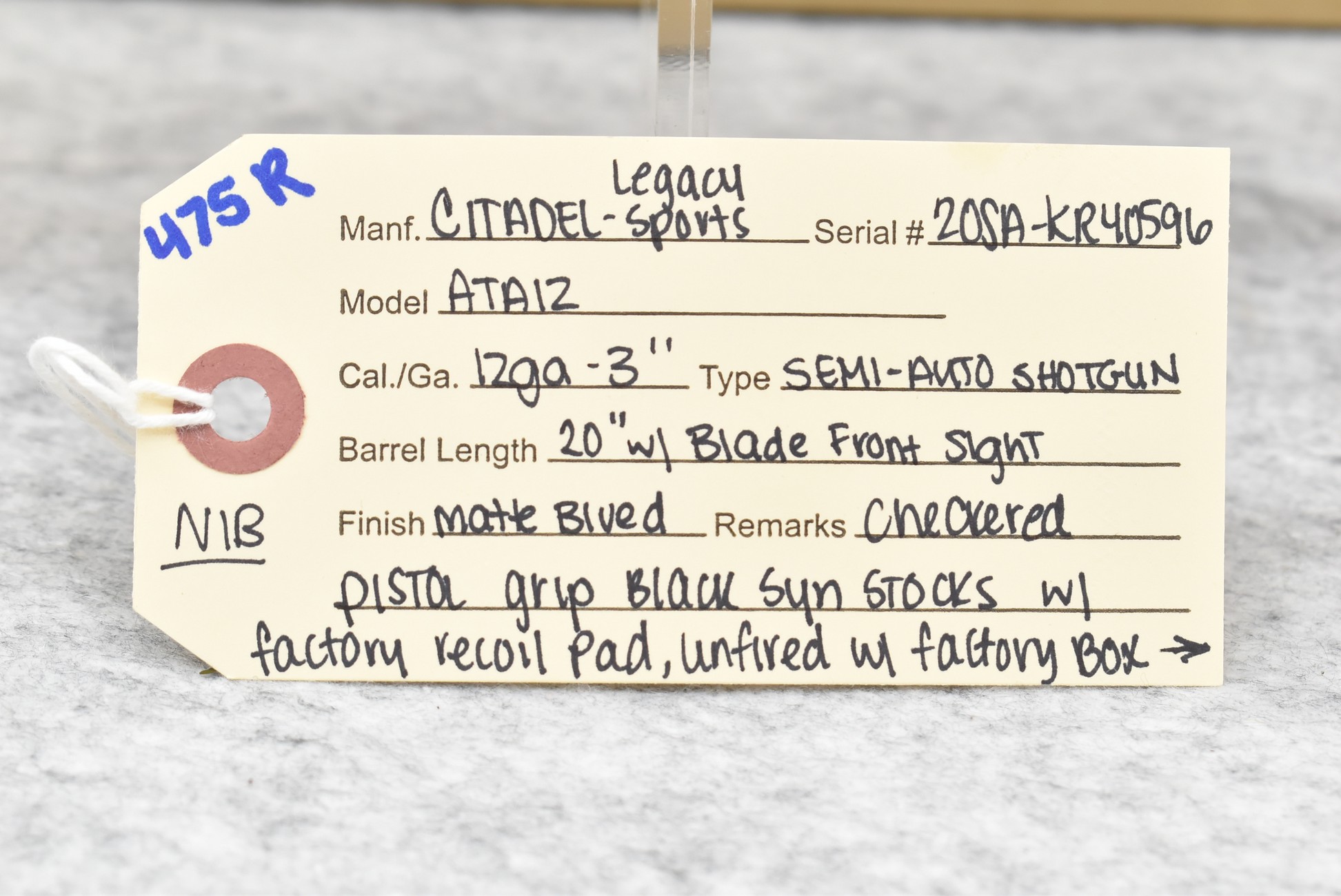 475R. Citadel-Legacy Sports – Mod. ATAIZ – 12ga. Semi-Auto Shotgun – w/20” Barrel w/Blade Front Sight – Matte Blued Finish – w/Checkered Pistol Grip Black Synthetic Stocks w/Factory Recoil Pad – Unfired w/Factory Box, Manual & Set of 3 Factory Chokes