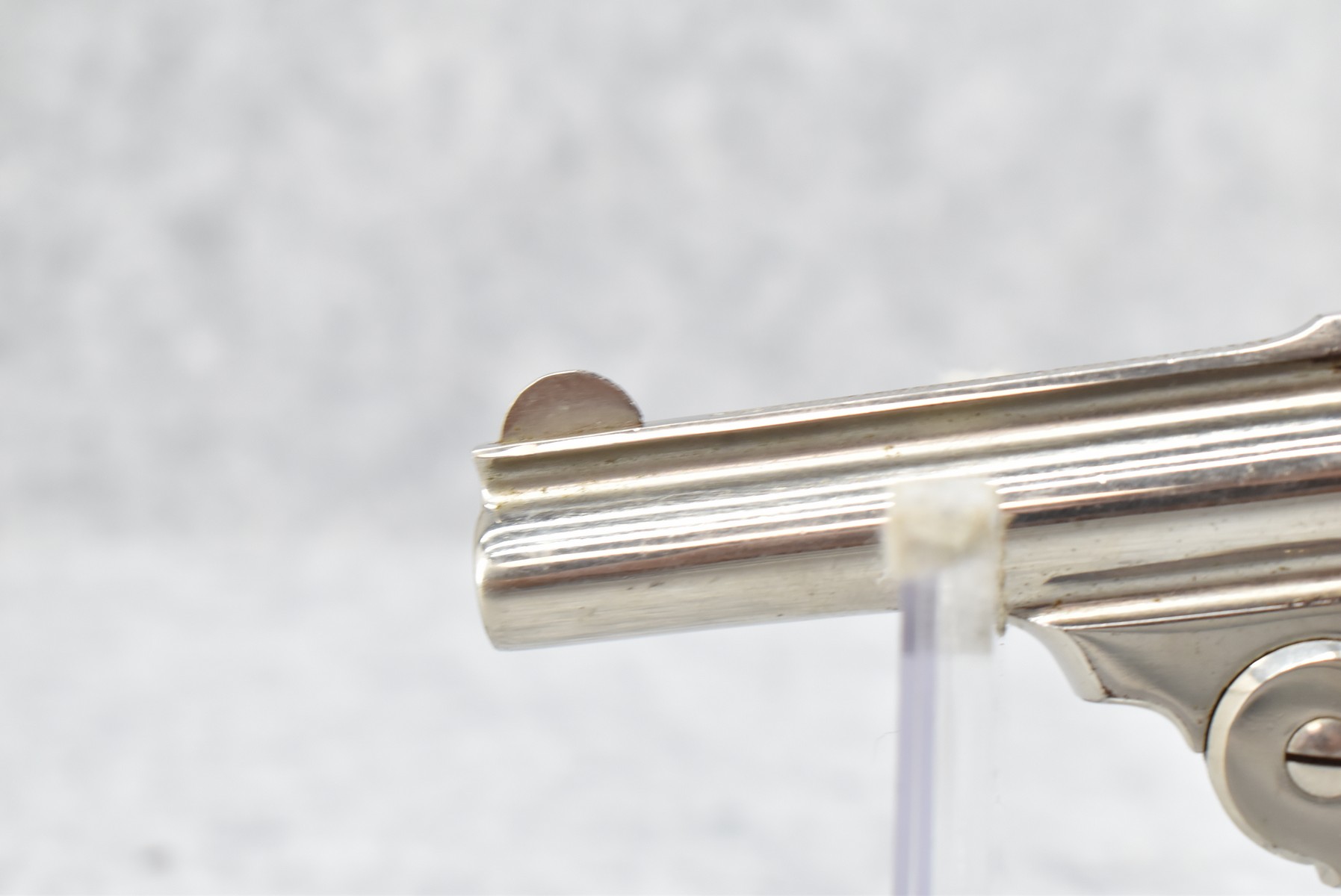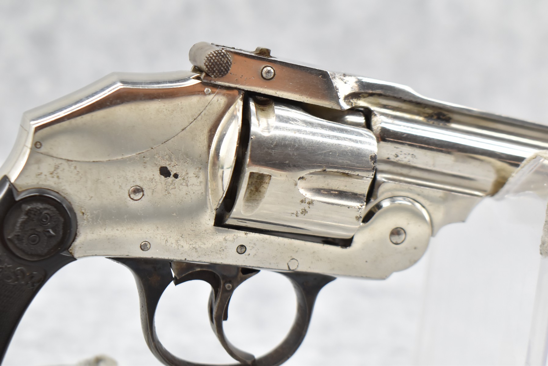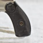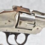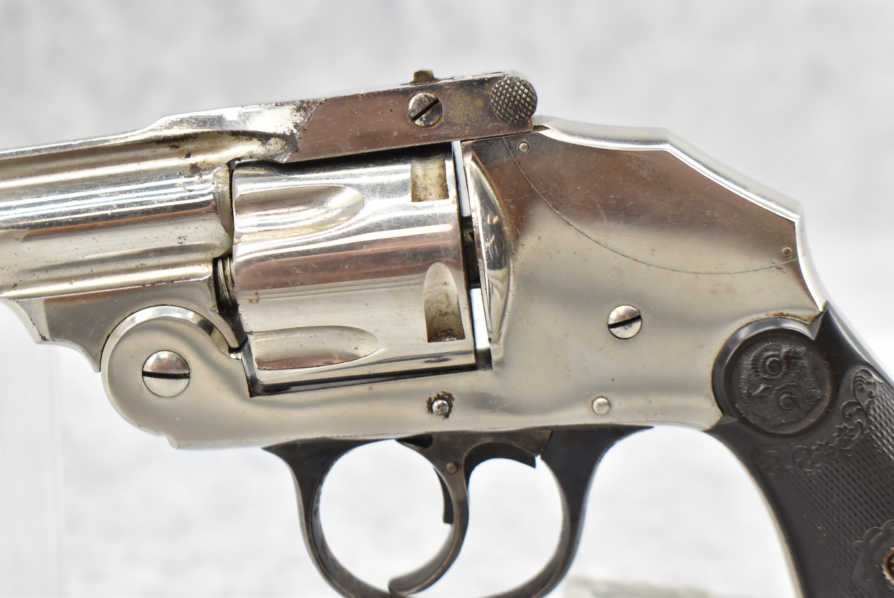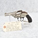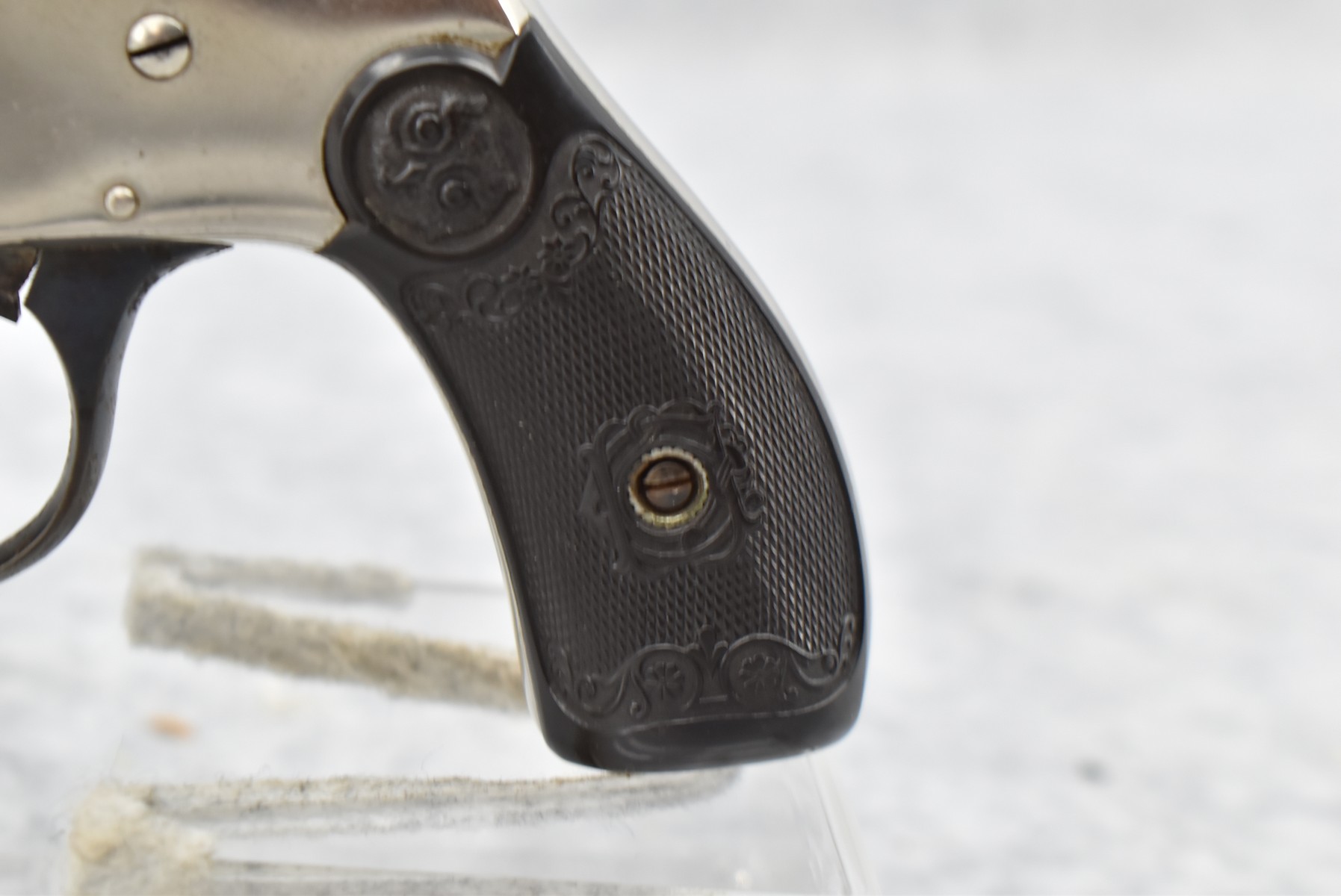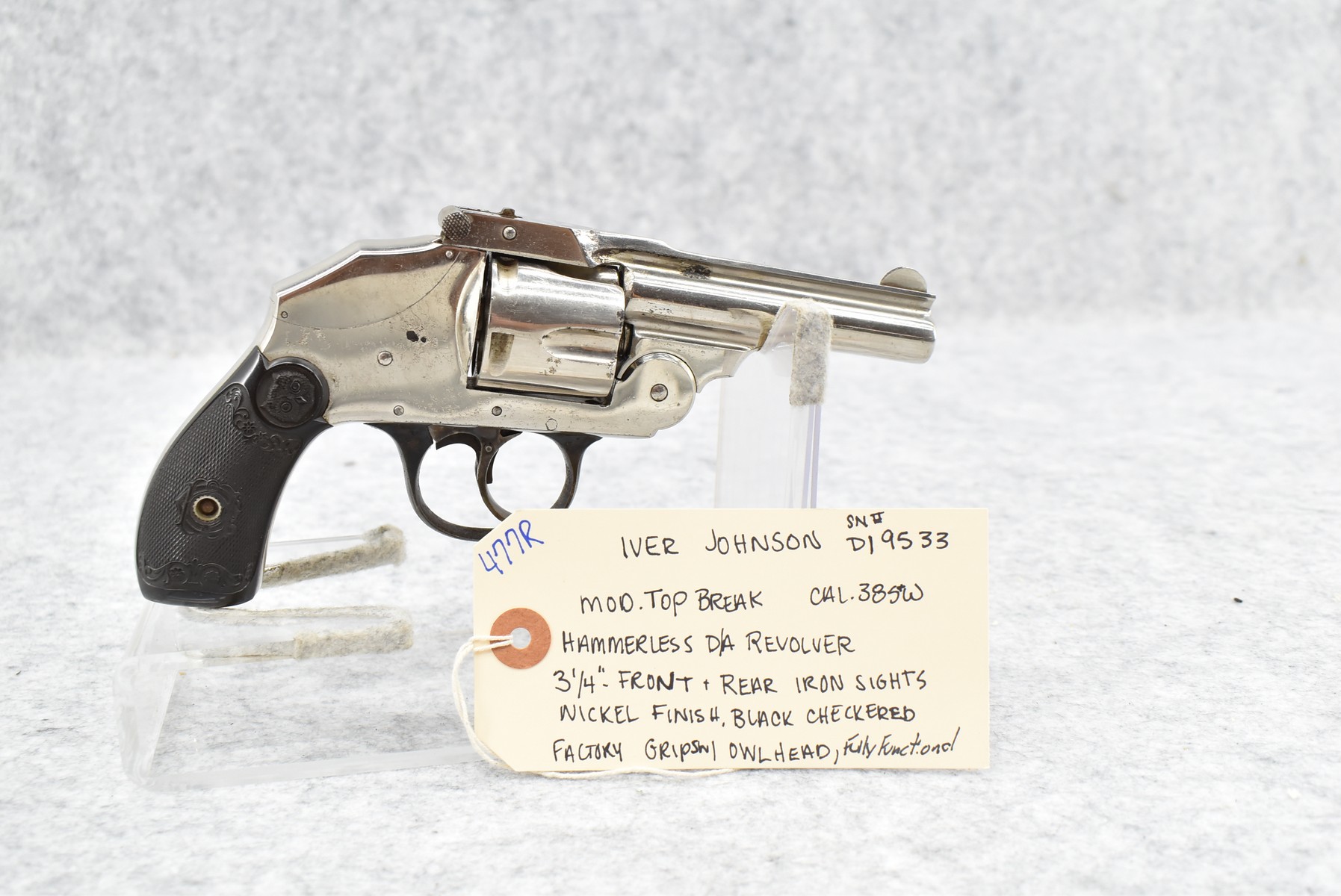 477R. Iver Johnson – Mod. Top Break – 38 S&W Cal. Hammerless Double Action Revolver – w/3 ¼” Barrel w/Front & Rear Iron Sights – Nickel Finish – w/Black Checkered Factory Grips w/Owl Head – Fully Functional