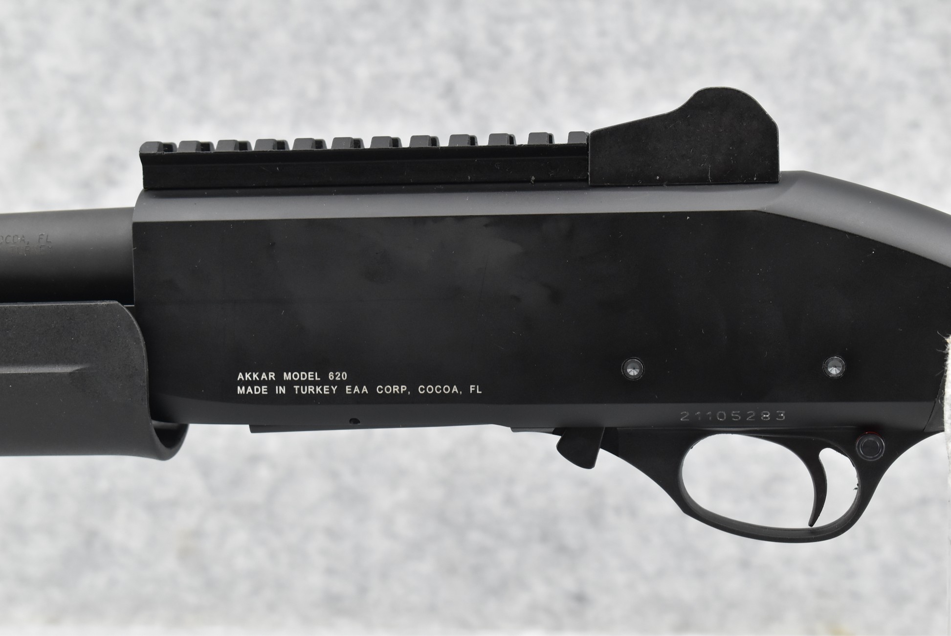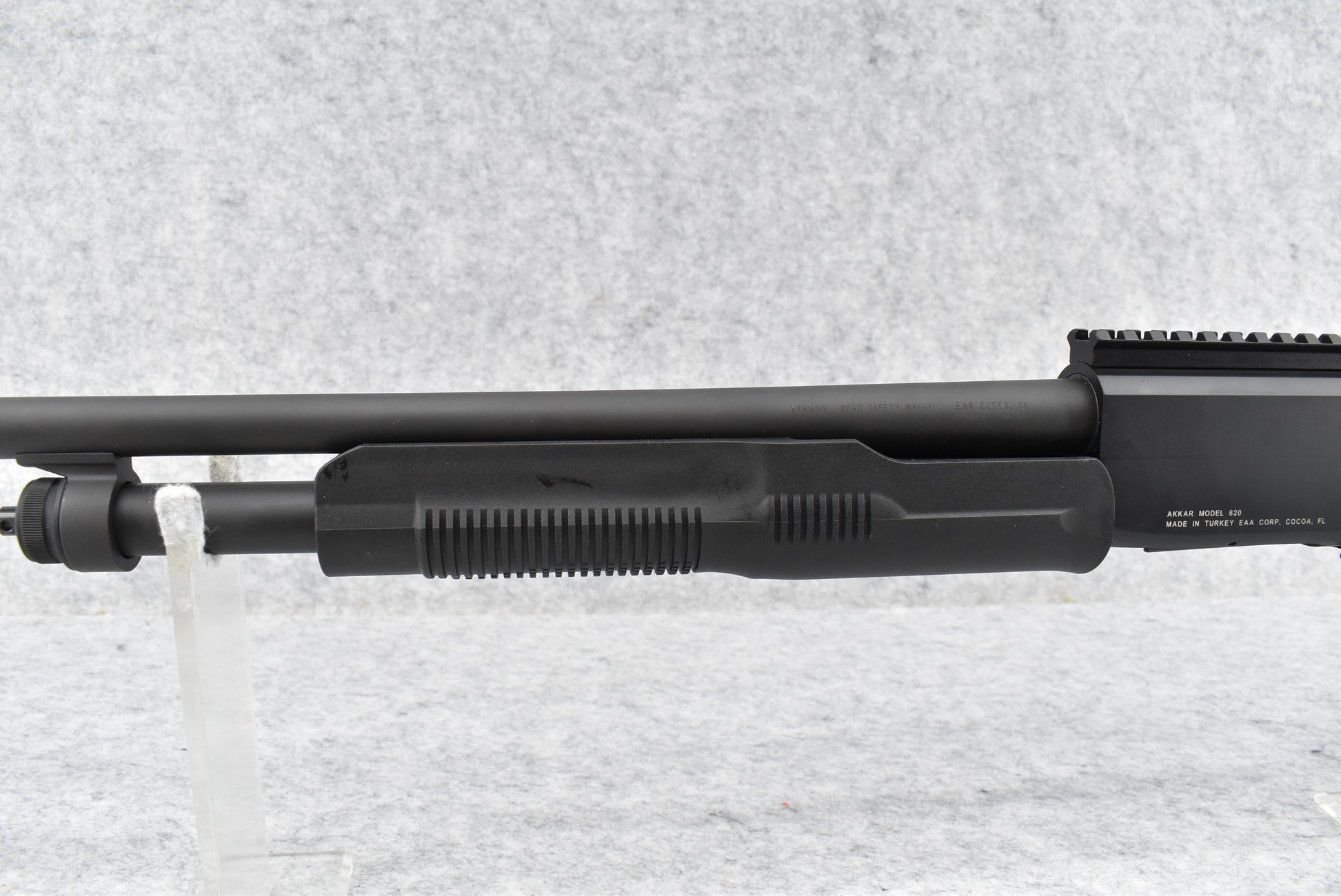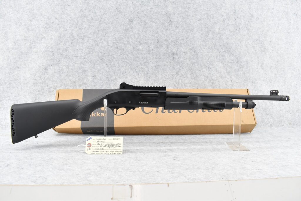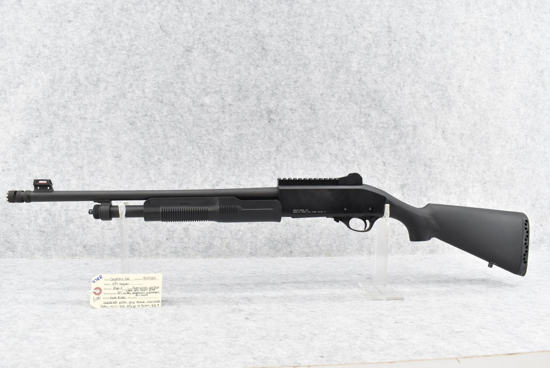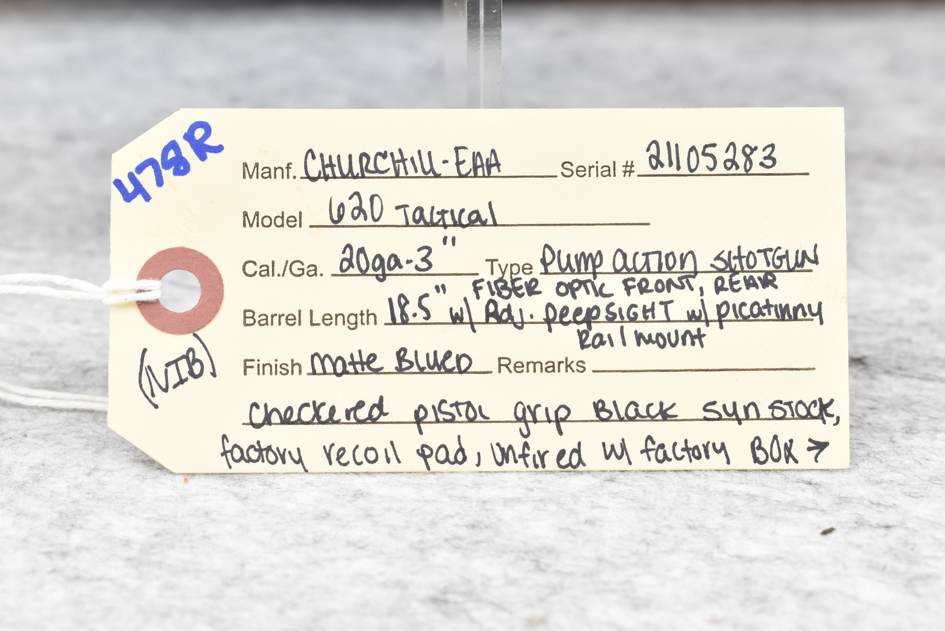 478R. Churchill-EAA – Mod. 620 Tactical – 20ga. 3” Pump Action Shotgun – w/18.5” Barrel w/Fiber Optic Front & Rear Adj. Peep Sights – Matte Blued Finish – w/Checkered Pistol Grip Black Synthetic Stock w/Factory Recoil Pad – w/Picatinny Rail Mount – Unfired w/Factory Box