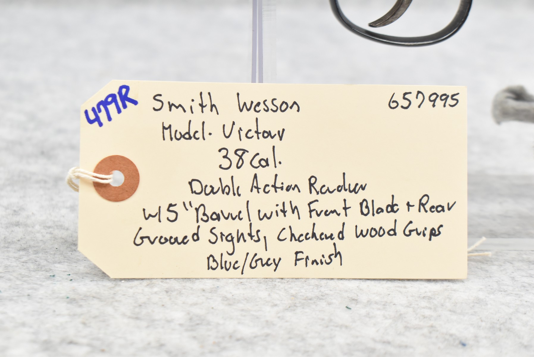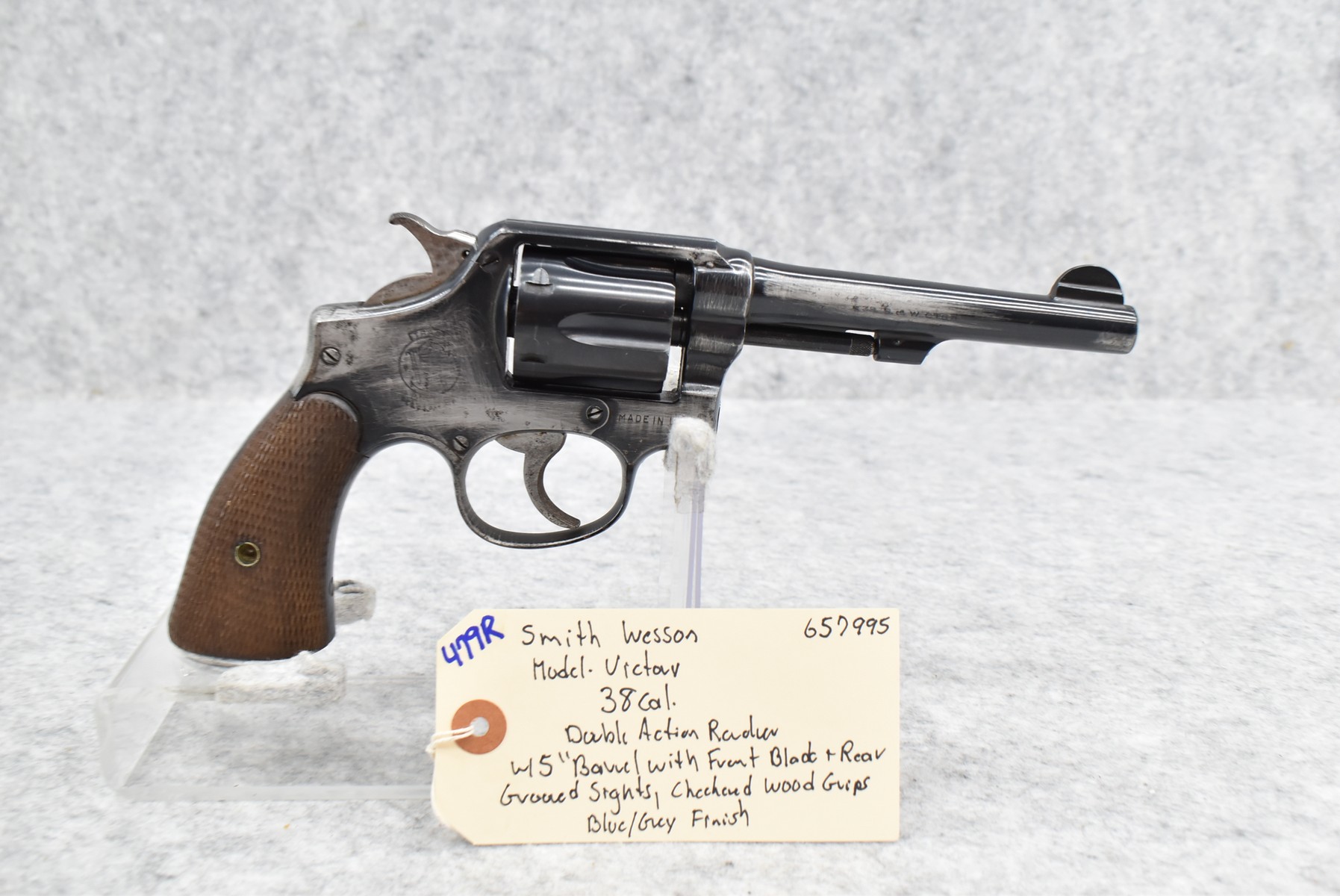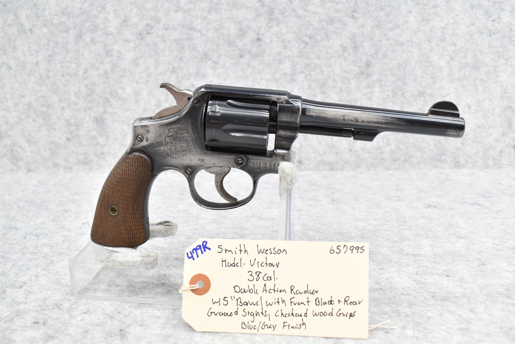 479R. Smith & Wesson – Mod. Victory – 38 Cal. Double Action Revolver – w/5” Barrel w/Front Blade & Rear Grooved Sights – Blued/Gray Finish – w/Checkered Wood Grips