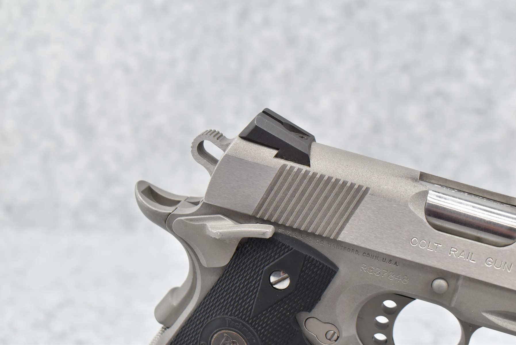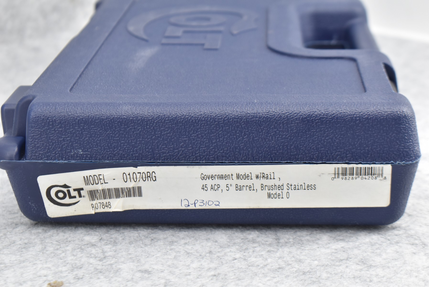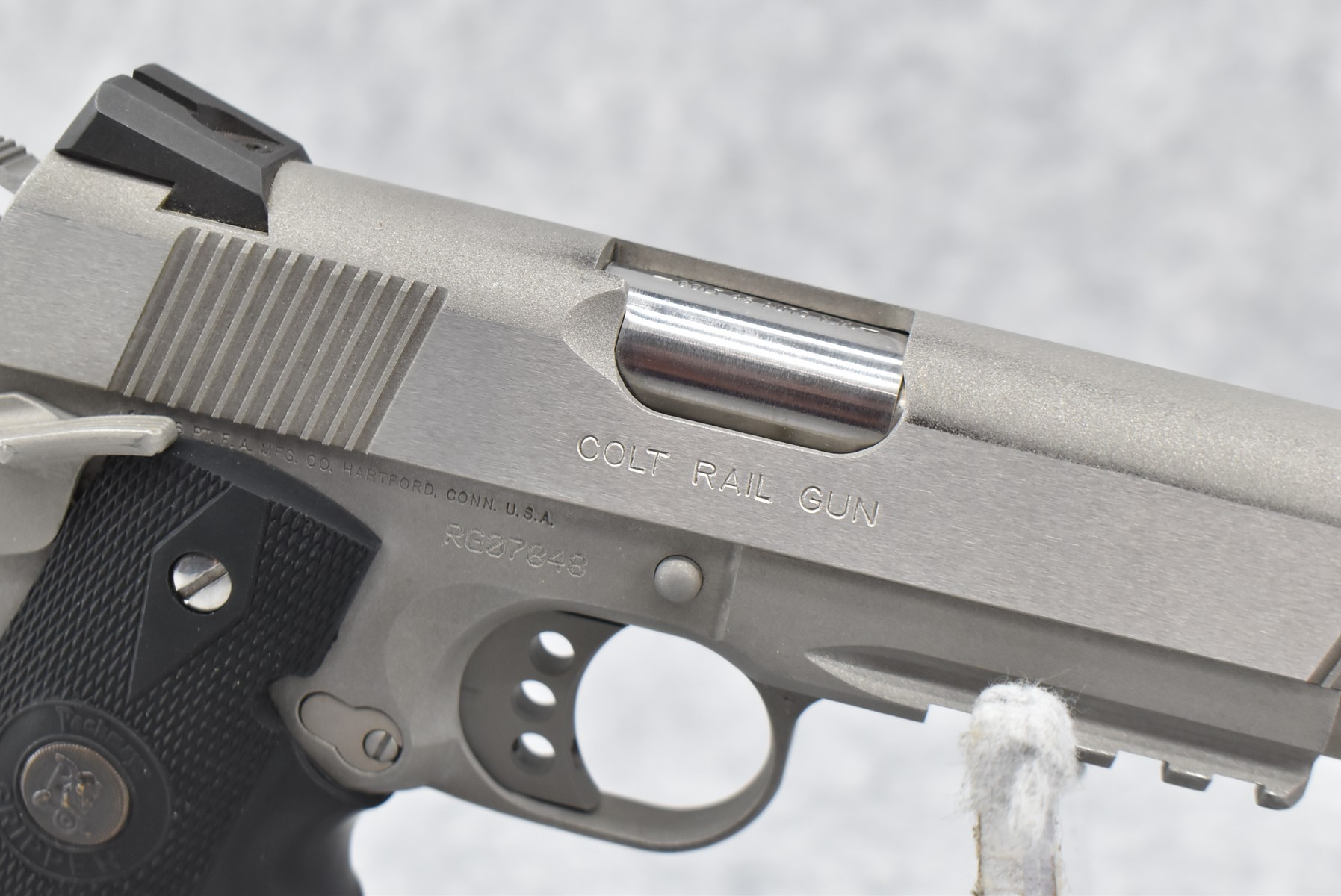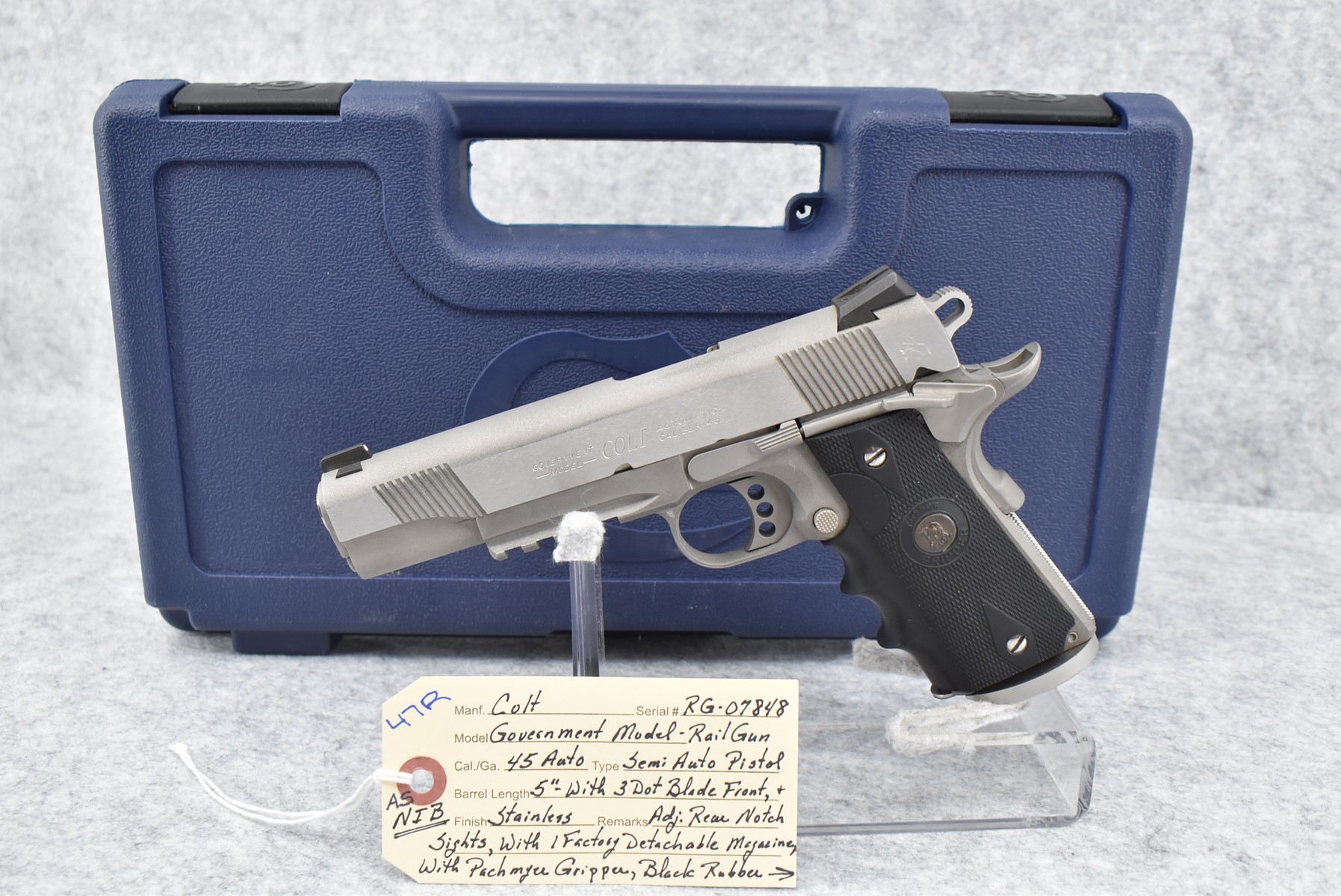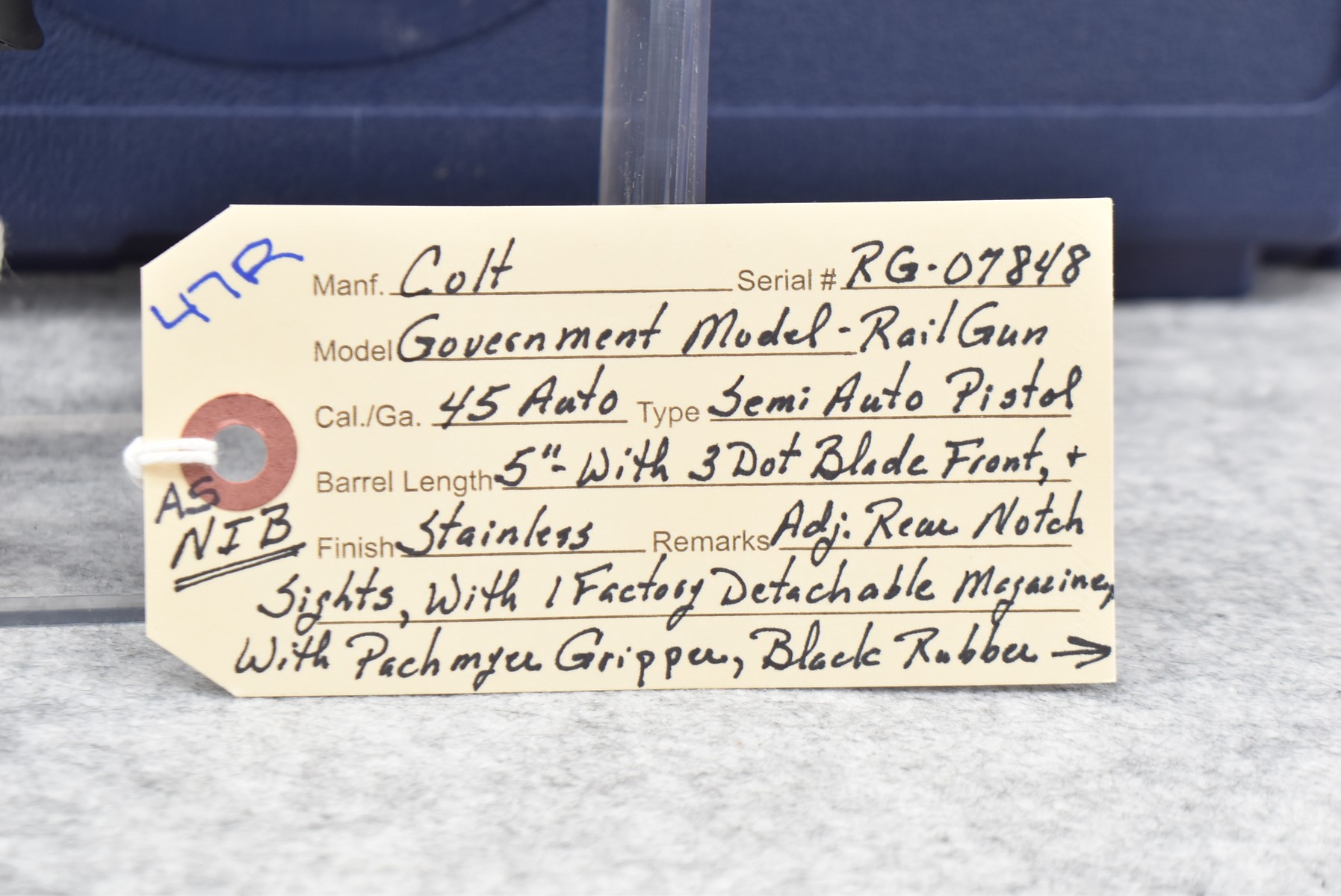 47R. Colt – Government Model-Rail Gun – 45 Auto Cal. Semi-Auto Pistol – w/5” Barrel w/3-Dot Blade Front & Adj. Rear Notch Sights – Stainless Finish – w/Factory Detachable Magazine – w/Pachmayr Gripper Rubber Grips & Colt Factory Diamond Checkered Wood Grips – As New w/Factory Hard Case & Manual
