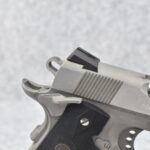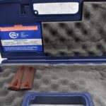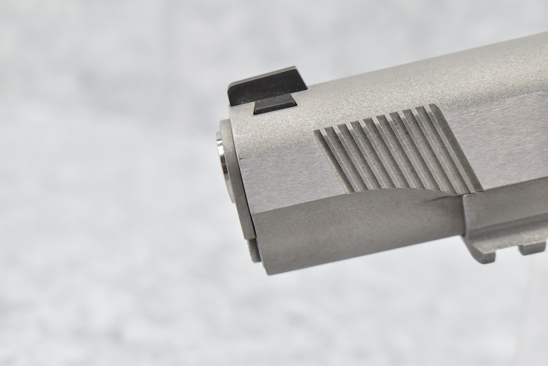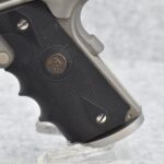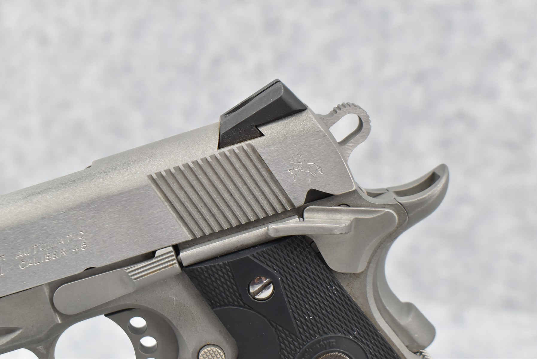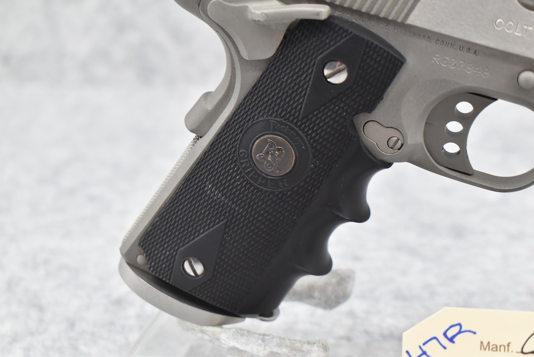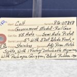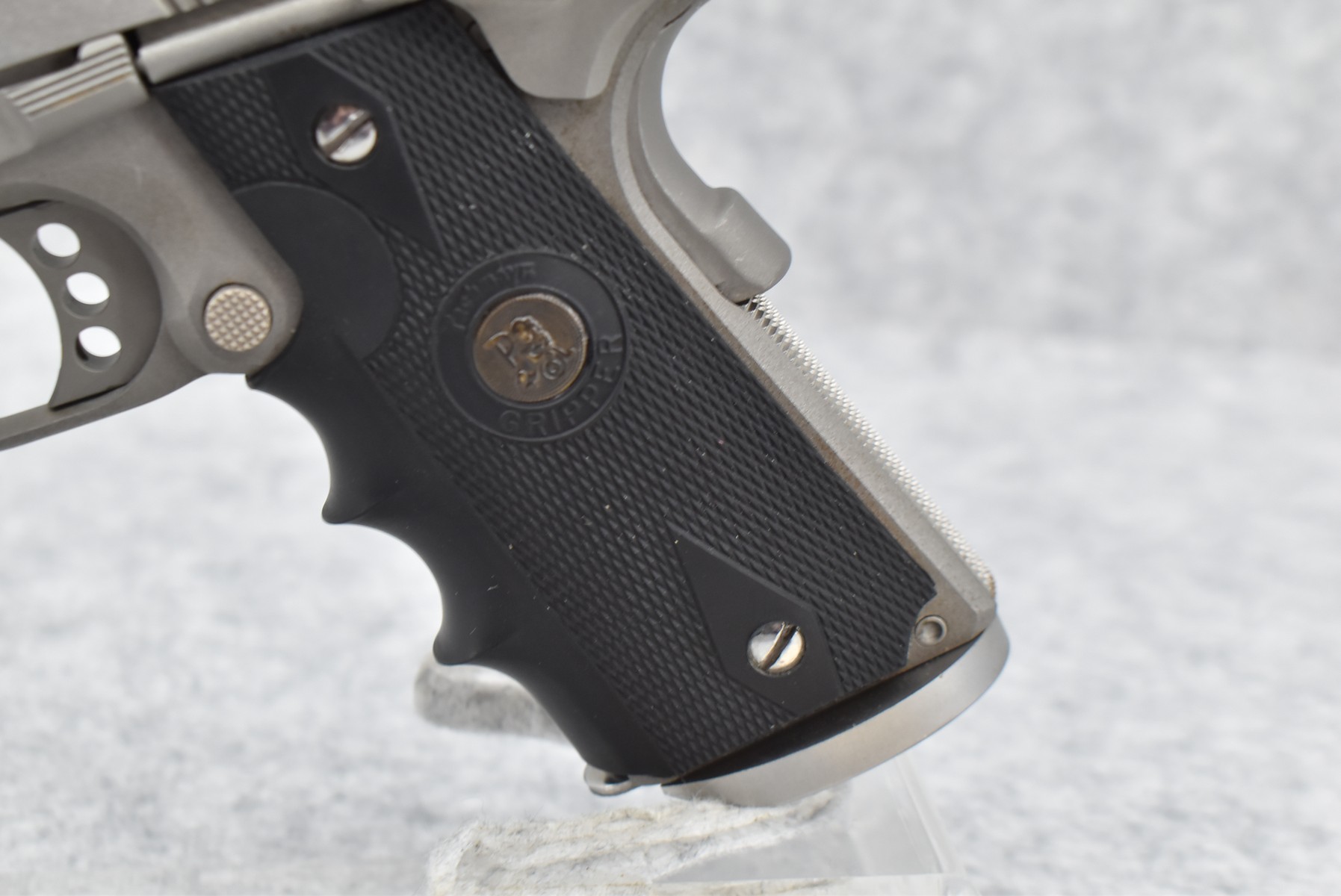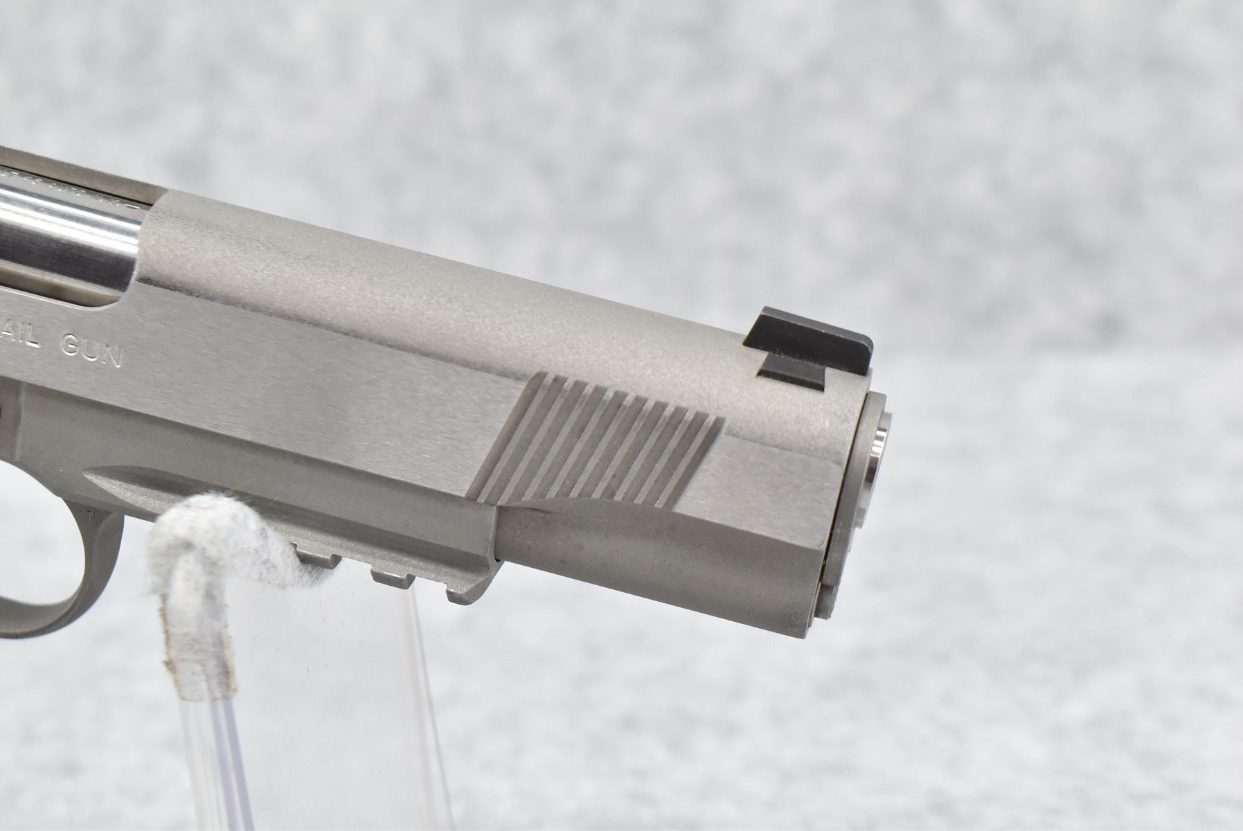 47R. Colt – Government Model-Rail Gun – 45 Auto Cal. Semi-Auto Pistol – w/5” Barrel w/3-Dot Blade Front & Adj. Rear Notch Sights – Stainless Finish – w/Factory Detachable Magazine – w/Pachmayr Gripper Rubber Grips & Colt Factory Diamond Checkered Wood Grips – As New w/Factory Hard Case & Manual