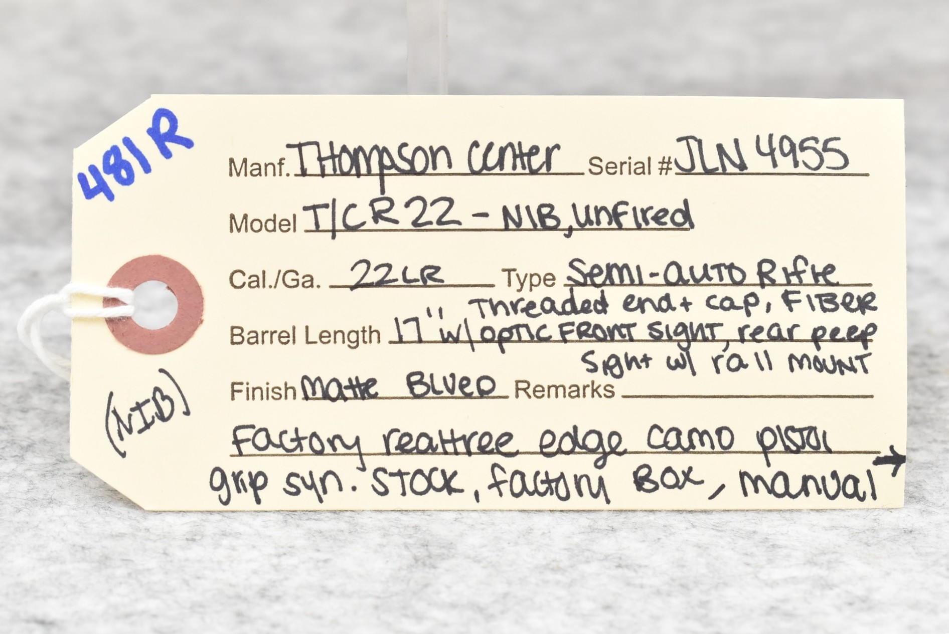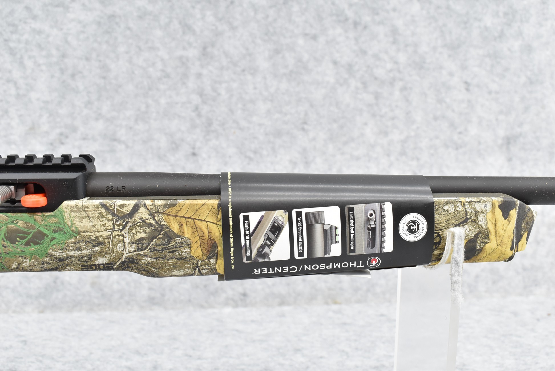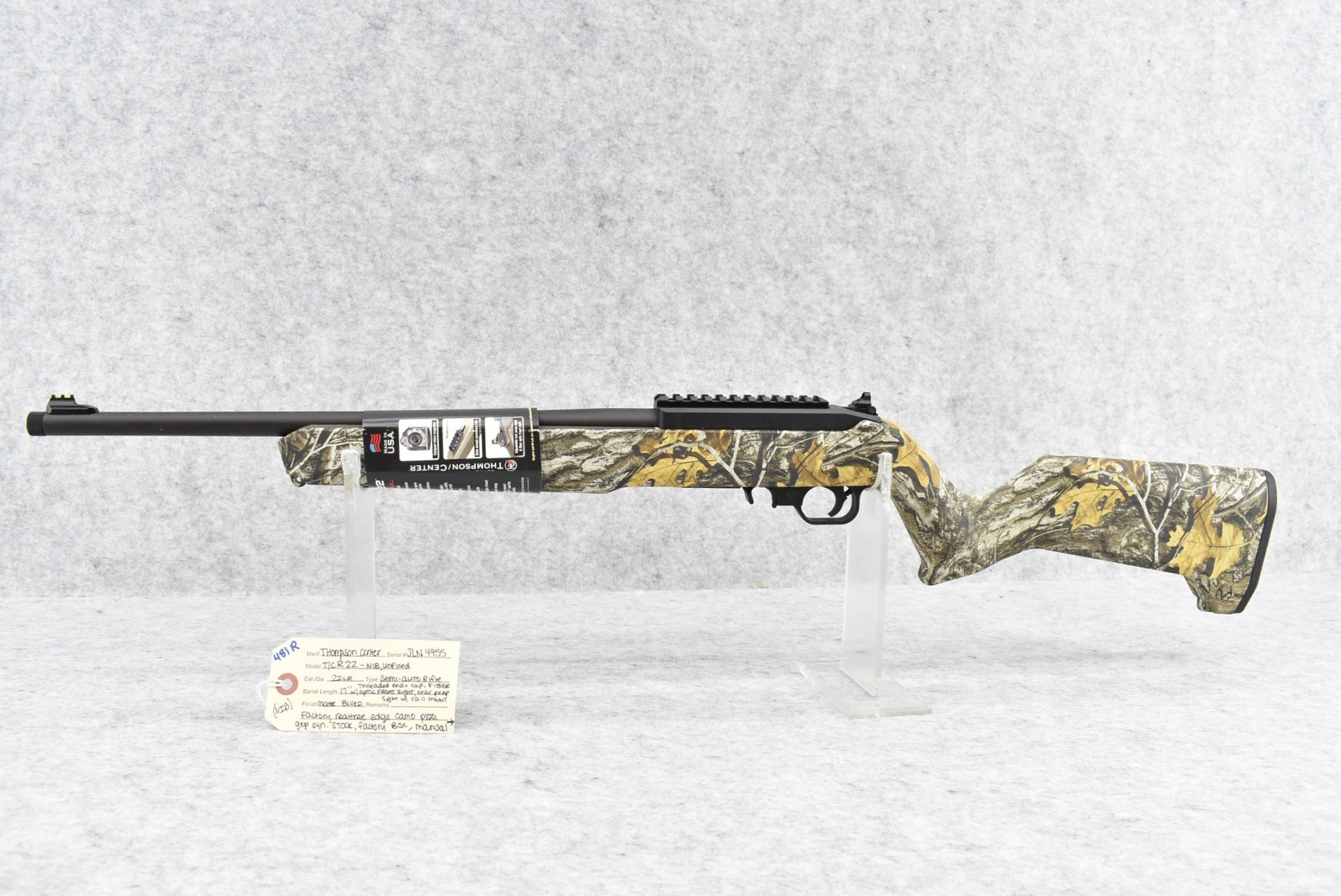 481R.     Thompson Center -Mod. T/C R22 – 22LR Cal. Semi-Auto Rifle – w/17” Barrel w/Threaded Muzzle w/Cap w/Fiber Optic Front Sight & Rear Peep Sights – Matte Blued Finish – w/Factory Realtree Edge Camo Pistol Grip Synthetic Stock – w/Rail Mount – Unfired w/Factory Box, Manual & Detachable Mag