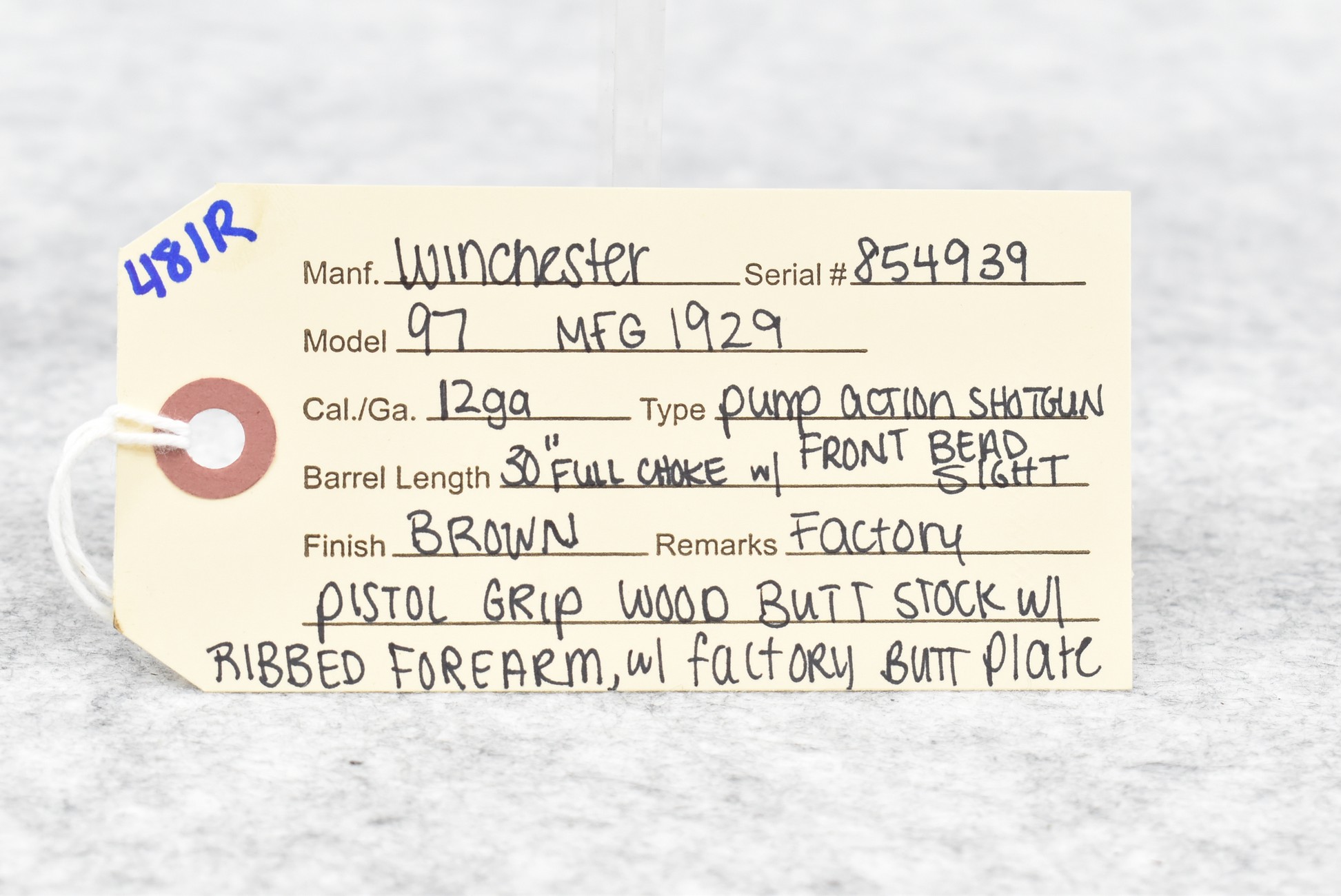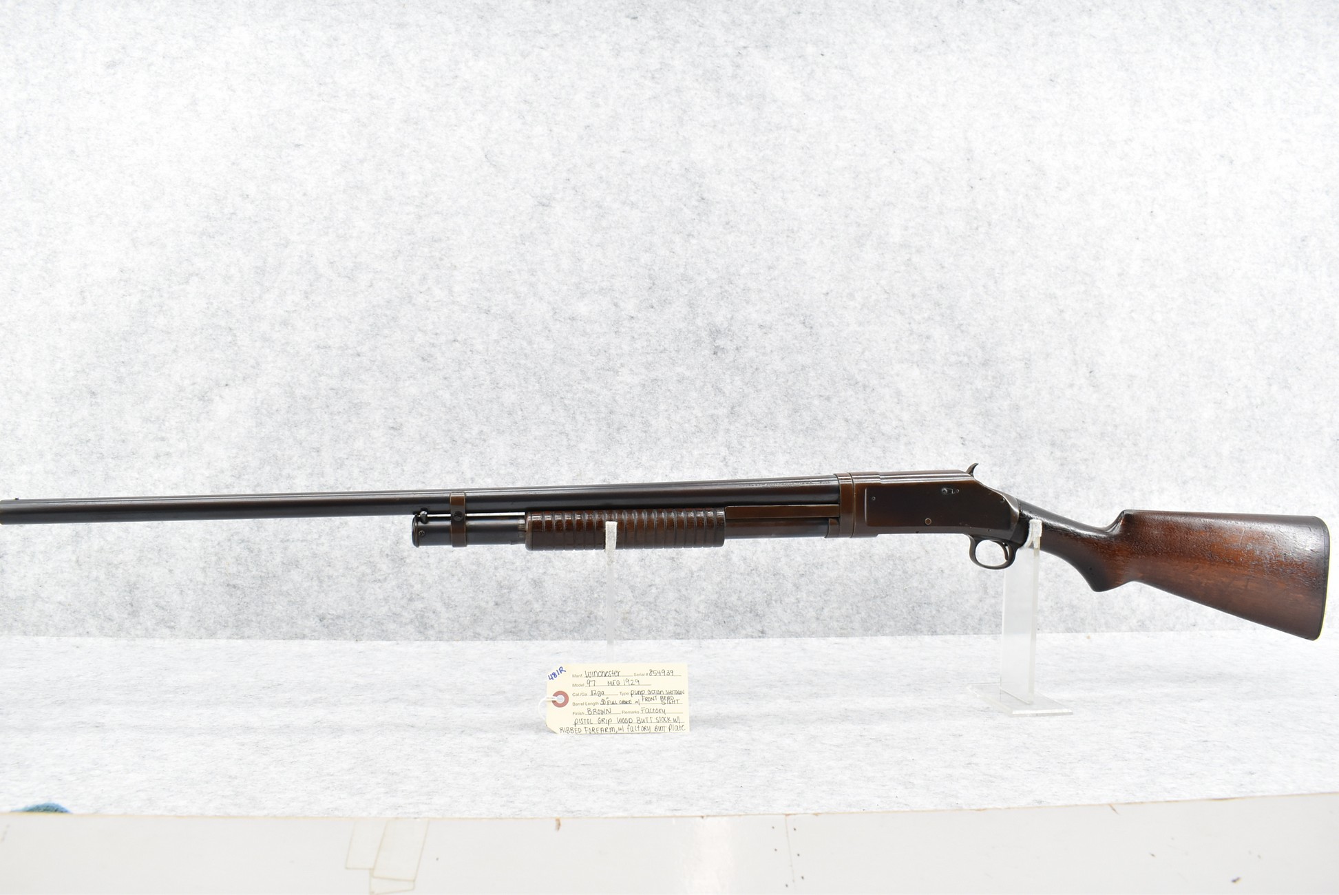 481R. Winchester – Mod. 97 – 12ga. Pump Action Shotgun – w/30” Full Choked Barrel w/Front Bead Sight – Brown Finish – w/Factory Pistol Grip Wood Butt Stock and Ribbed Forearm w/Factory Butt Plate – Manufactured 1929