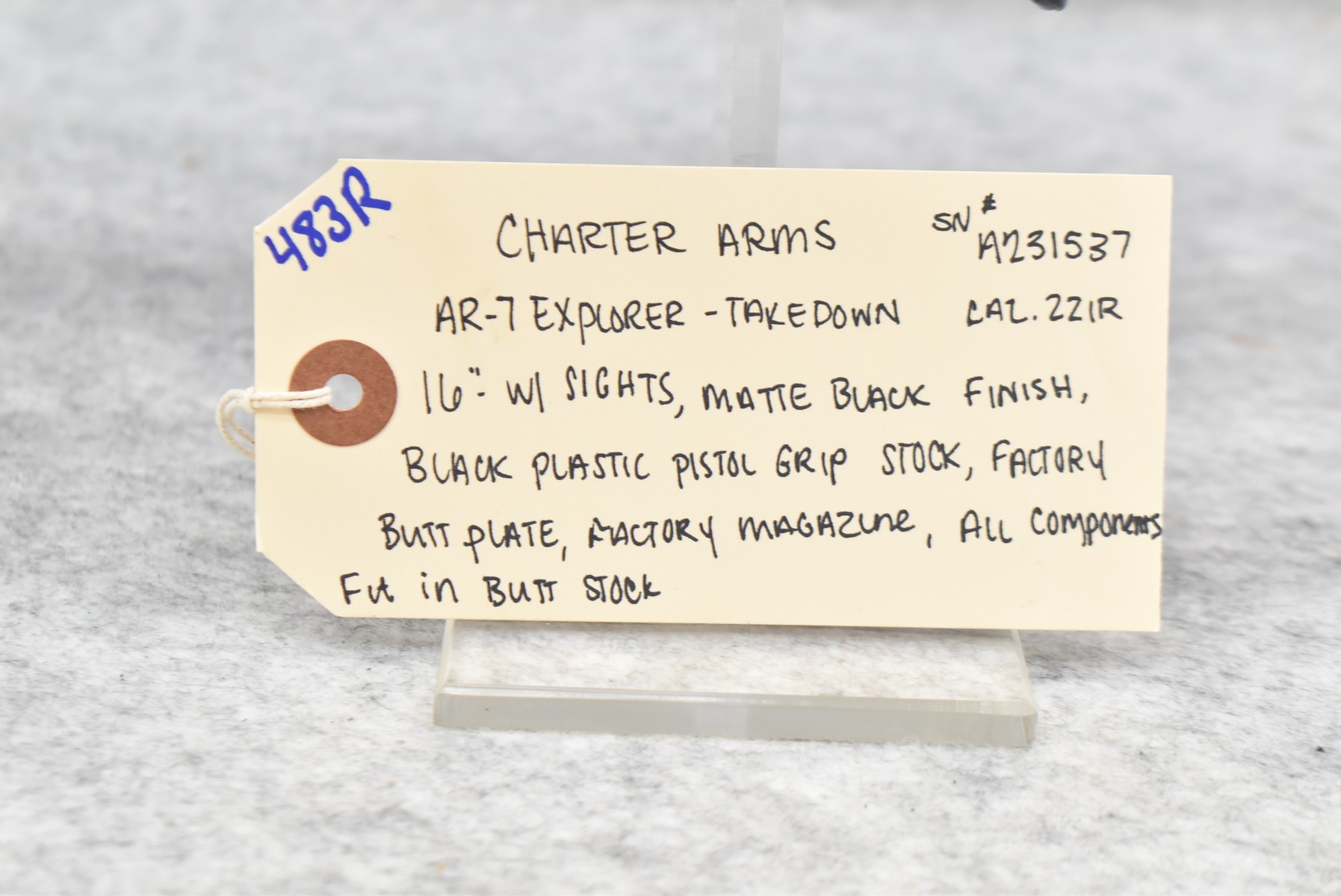 483R. Charter Arms – Mod. AR-7 Explorer Takedown – 22LR Cal. Semi-Auto Rifle – w/16” Barrel w/Sights – Matte Black Finish – w/Black Plastic Pistol Grip Stock w/Factory Butt Plate – w/Factory Magazine – All Components Store in Butt Stock