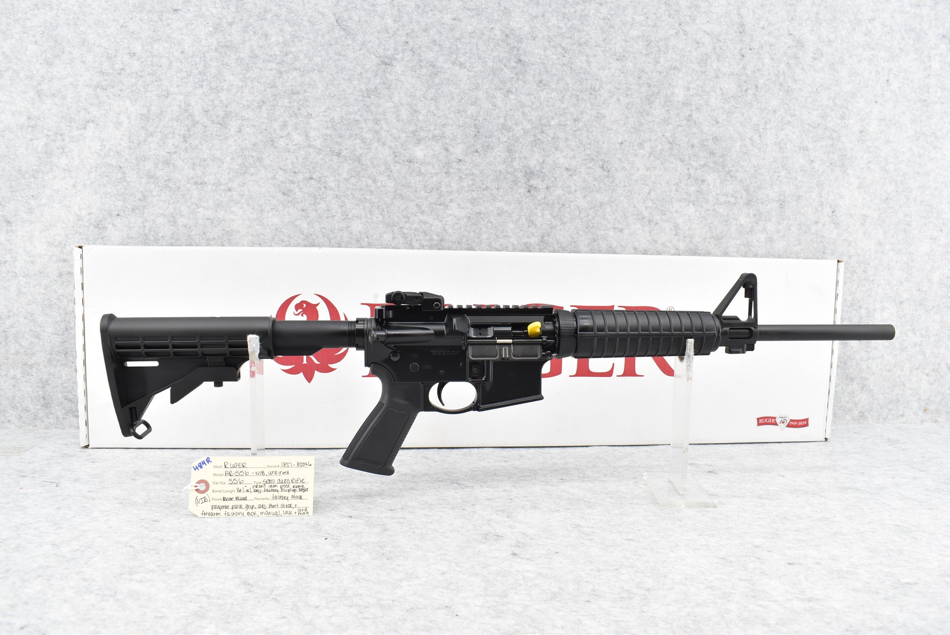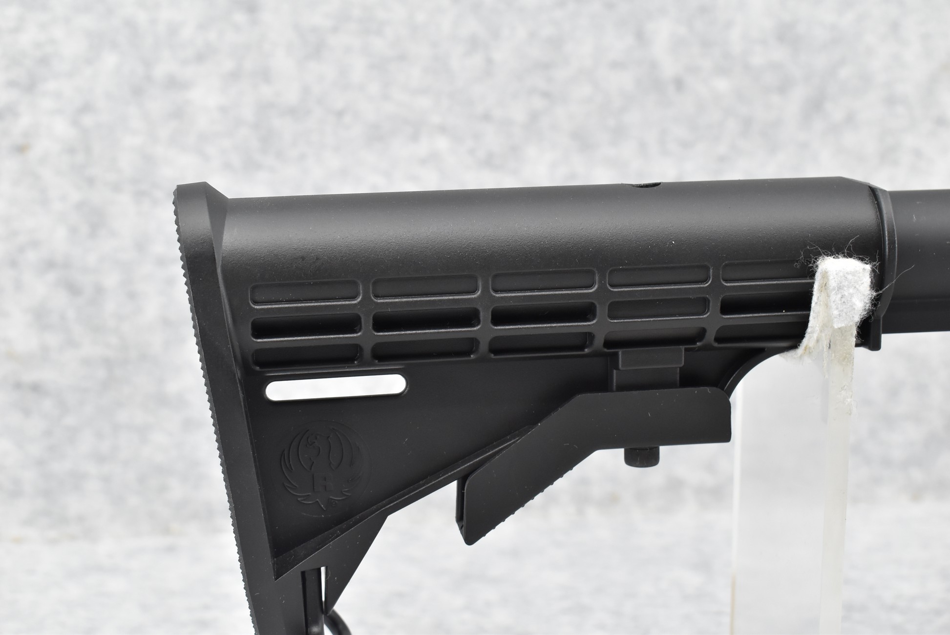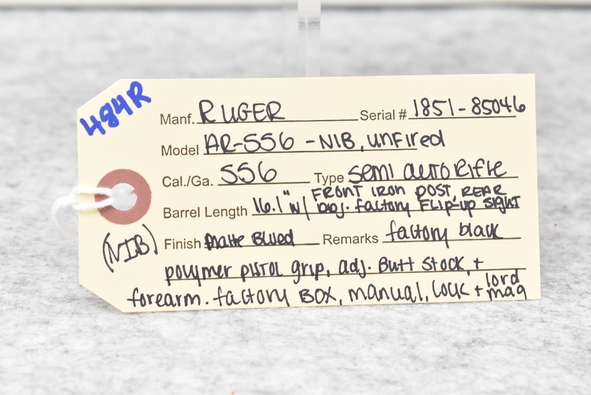 484R. Ruger – Mod. AR-556 – 5.56 Cal. Semi-Auto Rifle – w/16.1” Barrel w/Front Iron Post & Rear Adj. Factory Flip Up Sights – Matte Blued Finish – w/Factory Black Polymer Pistol Grip, Adj. Butt Stock & Forearm – Unfired w/Factory Box, Manual & 10Rd Mag (MARYLAND COMPLIANT)