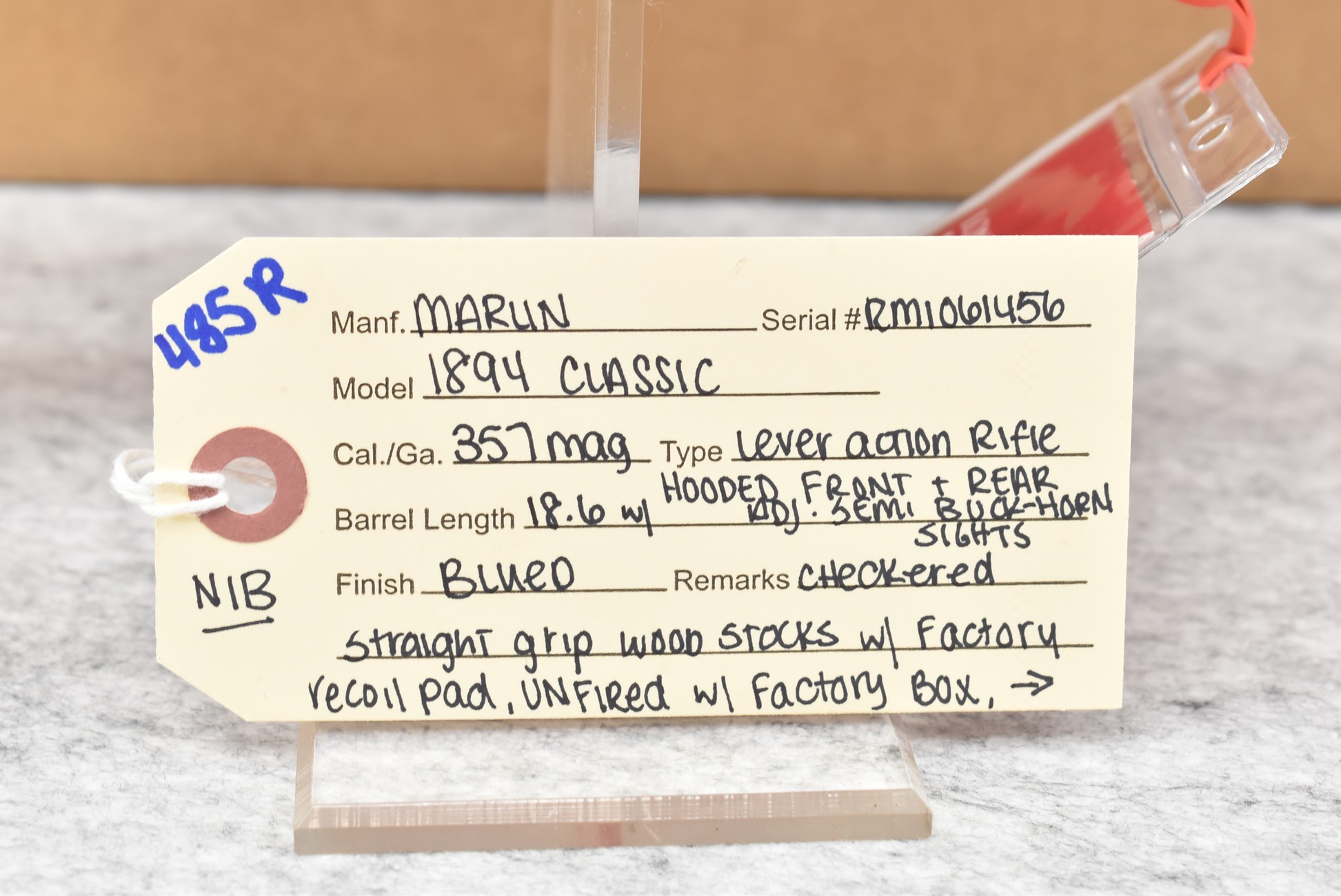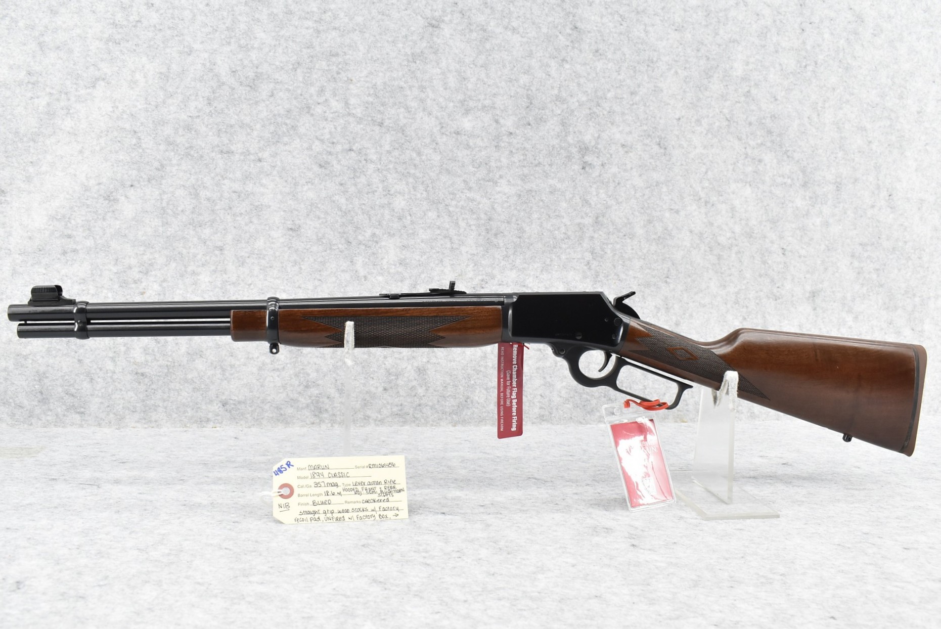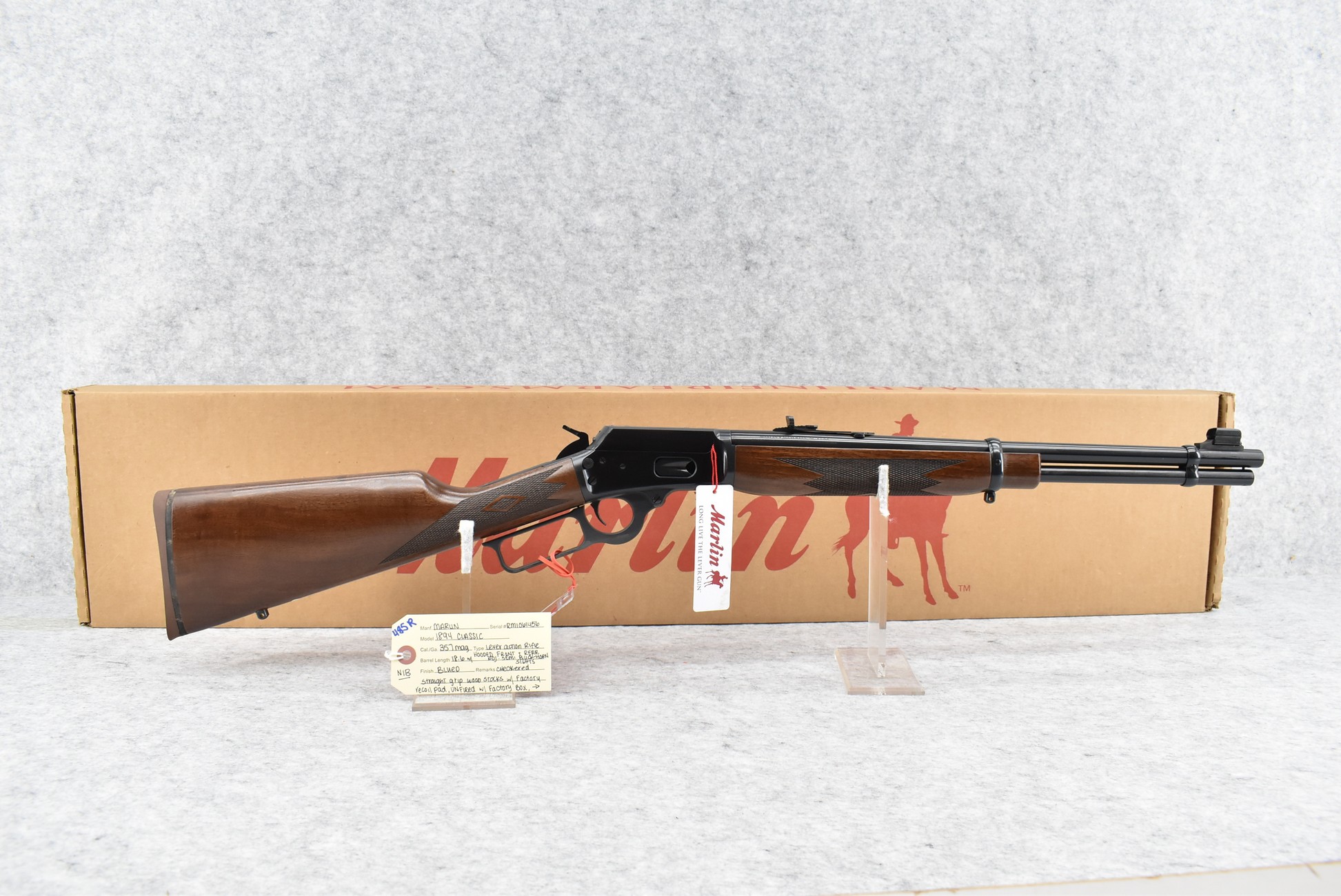 485R. Marlin – Mod. 1894 Classic – 357 Mag. Cal. Lever Action Rifle – w/18.6” Barrel w/Hooded Front & Rear Adj. Semi Buckhorn Sights – Blued Finish – w/Checkered Straight Grip Wood Stocks w/Factory Recoil Pad – Unfired w/Factory Box, Manual, Hang Tag