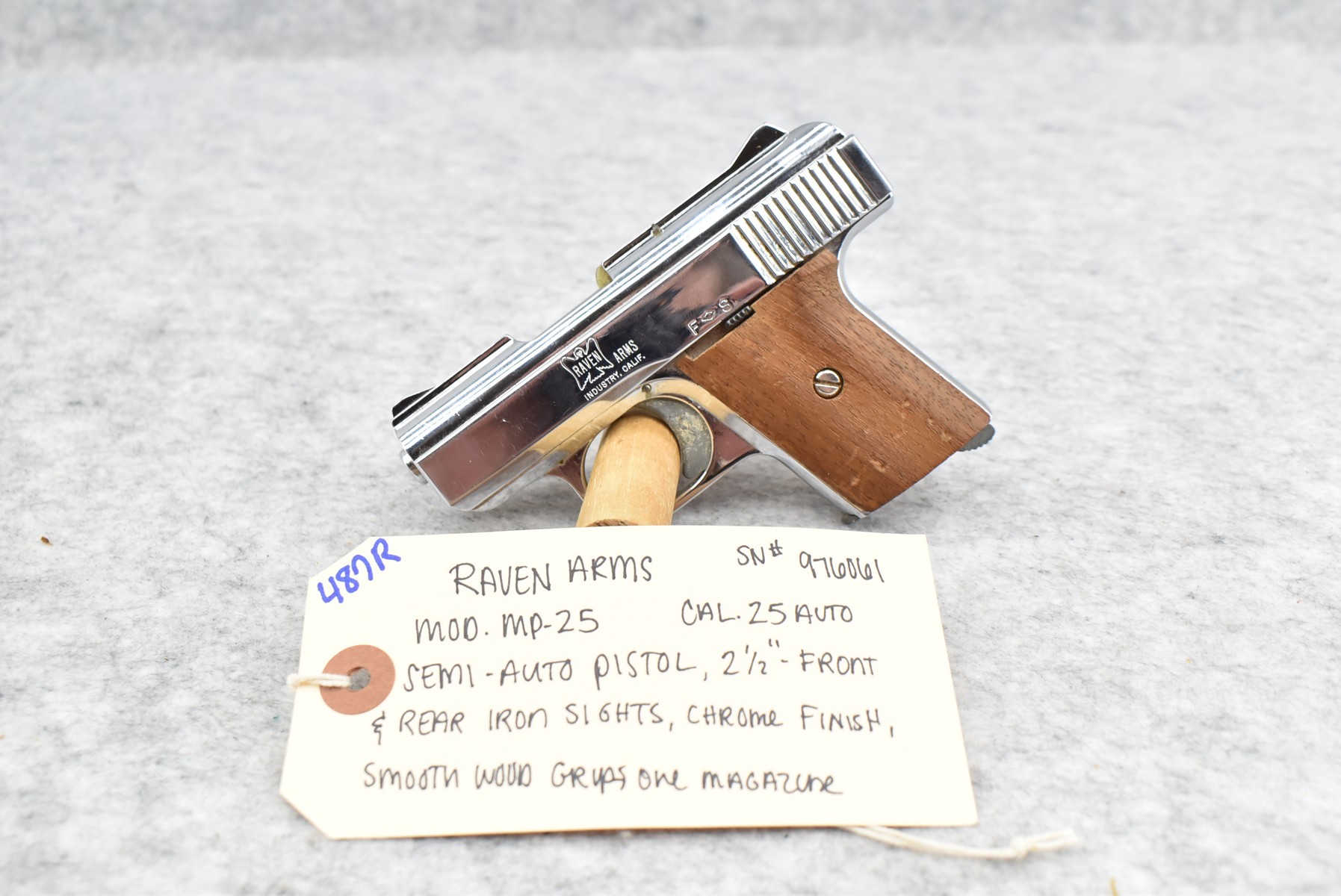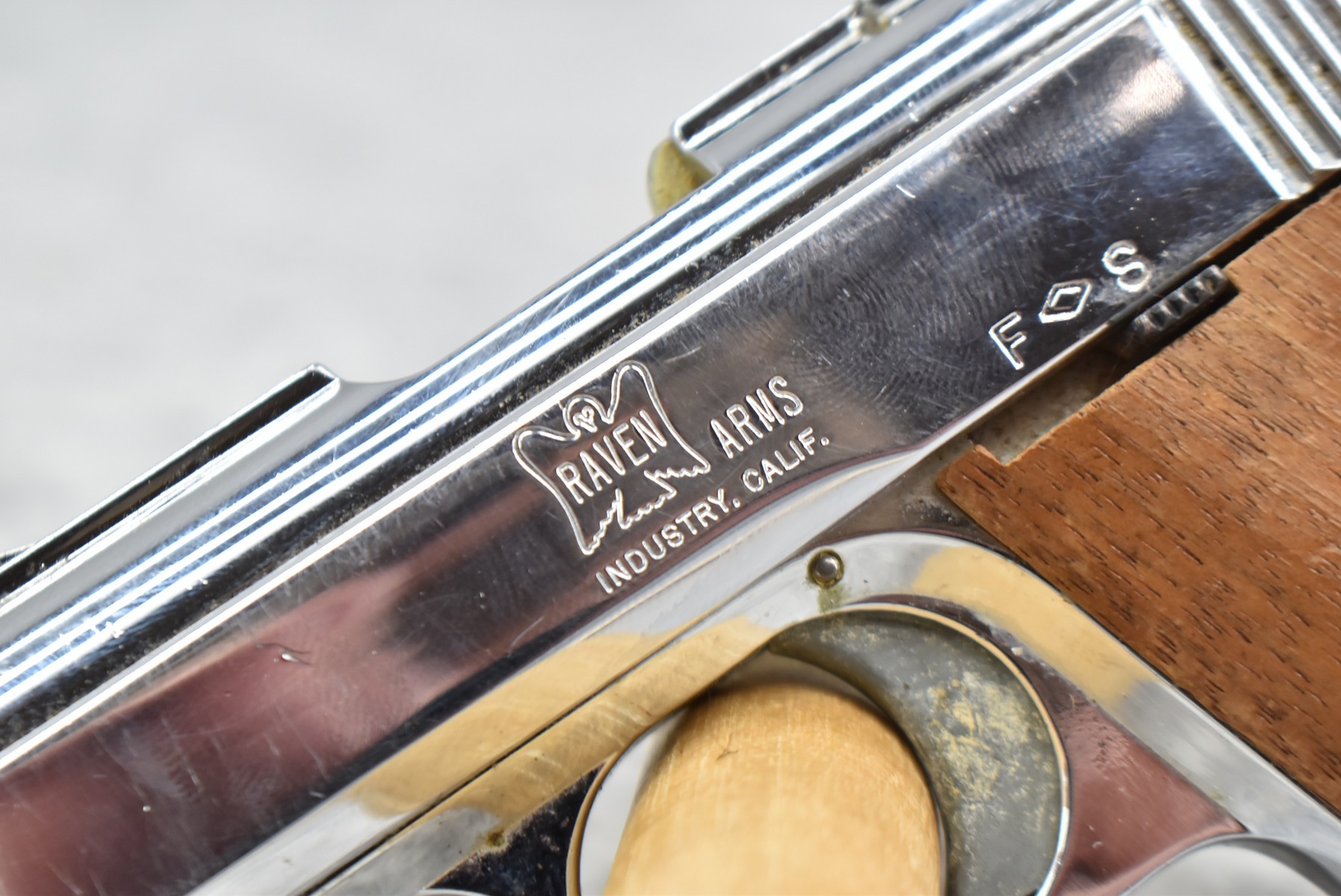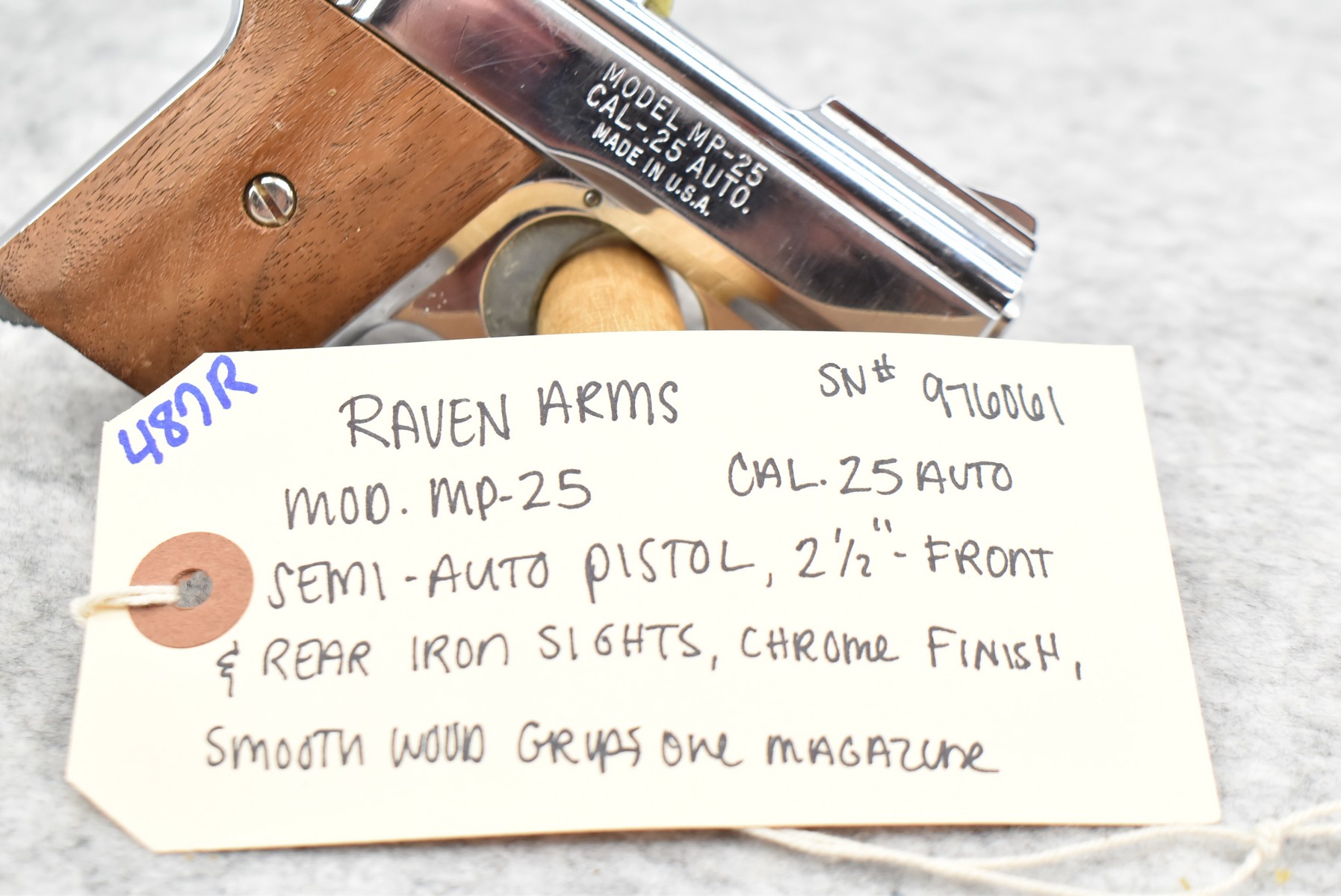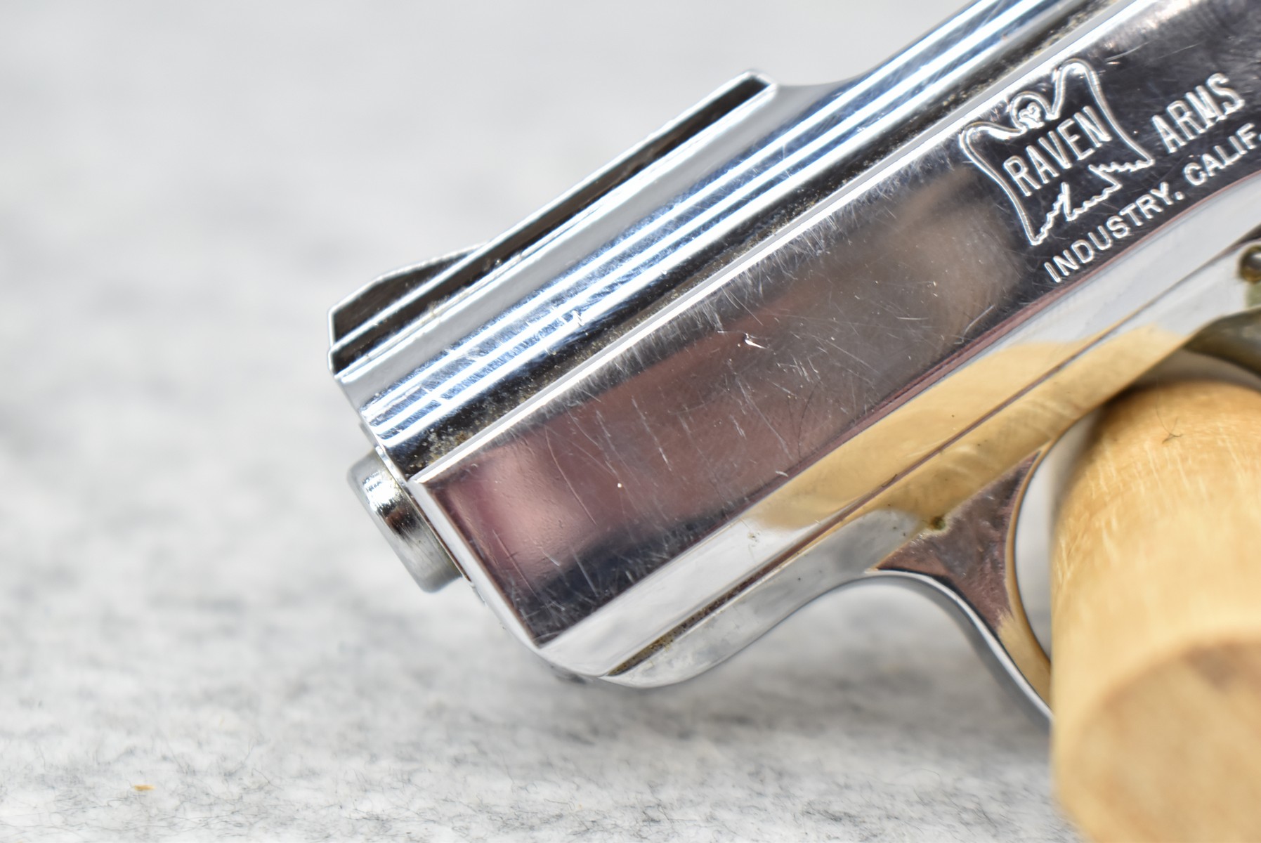 487R. Raven Arms – Mod. MP-25 – 25 Auto Cal. Semi-Auto Pistol – w/2 ½” Barrel w/Front & Rear Iron Sights – Chrome Finish – w/Smooth Wood Grips – w/Magazine (CANNOT GO TO MARYLAND!)