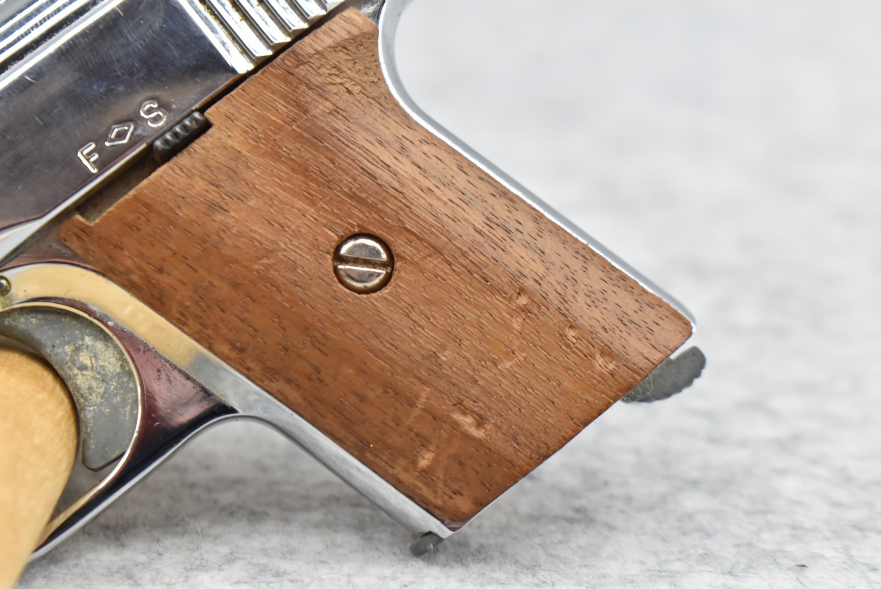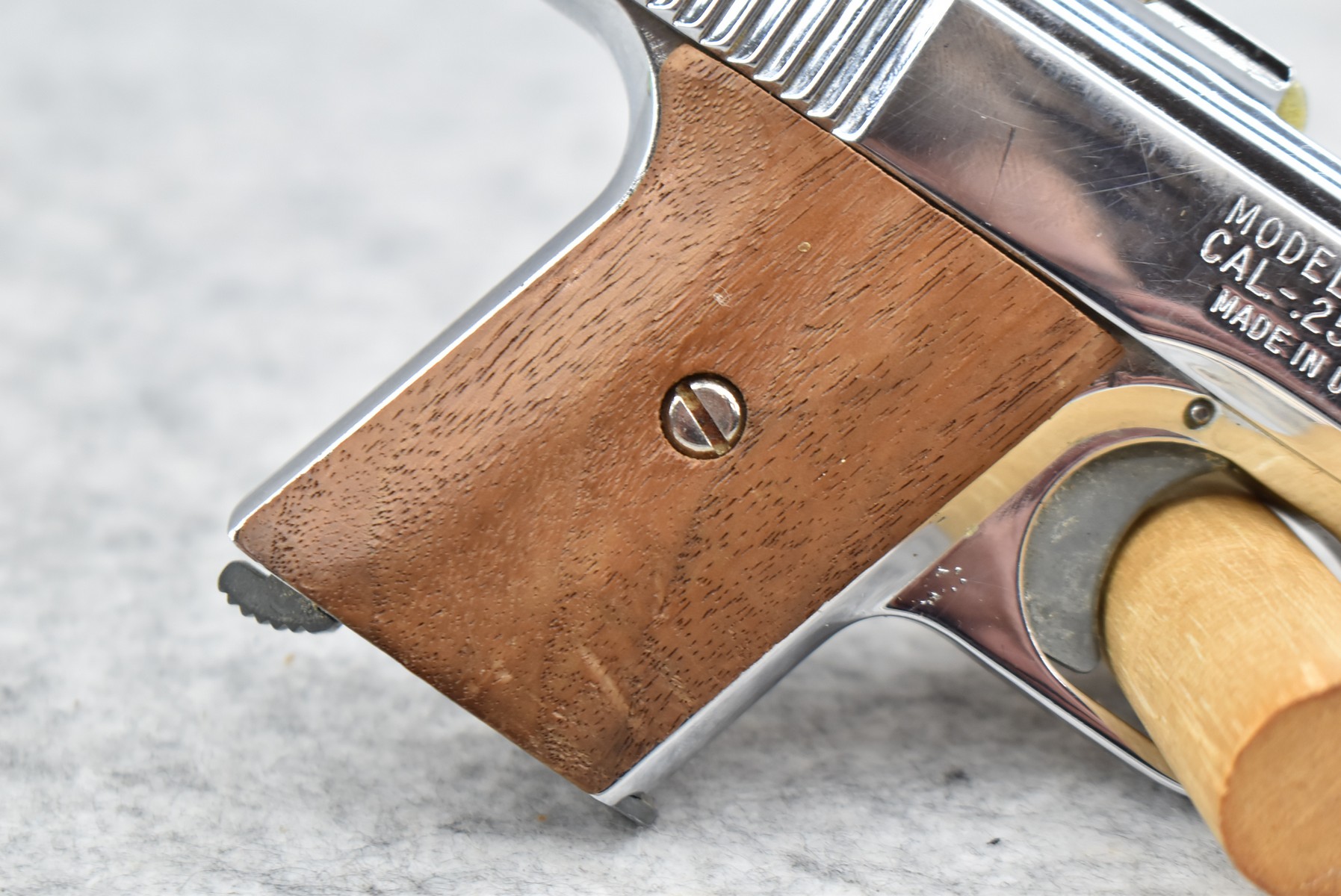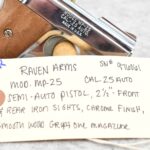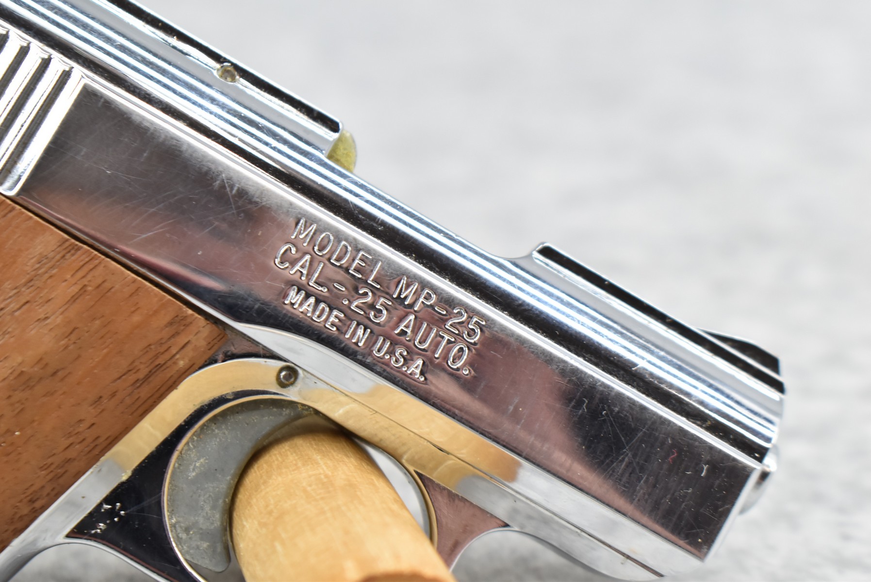 487R. Raven Arms – Mod. MP-25 – 25 Auto Cal. Semi-Auto Pistol – w/2 ½” Barrel w/Front & Rear Iron Sights – Chrome Finish – w/Smooth Wood Grips – w/Magazine (CANNOT GO TO MARYLAND!)