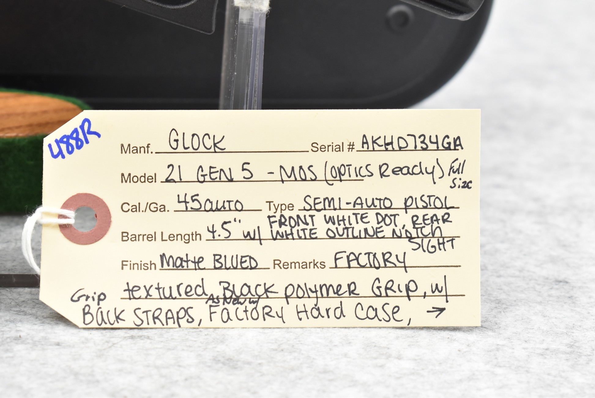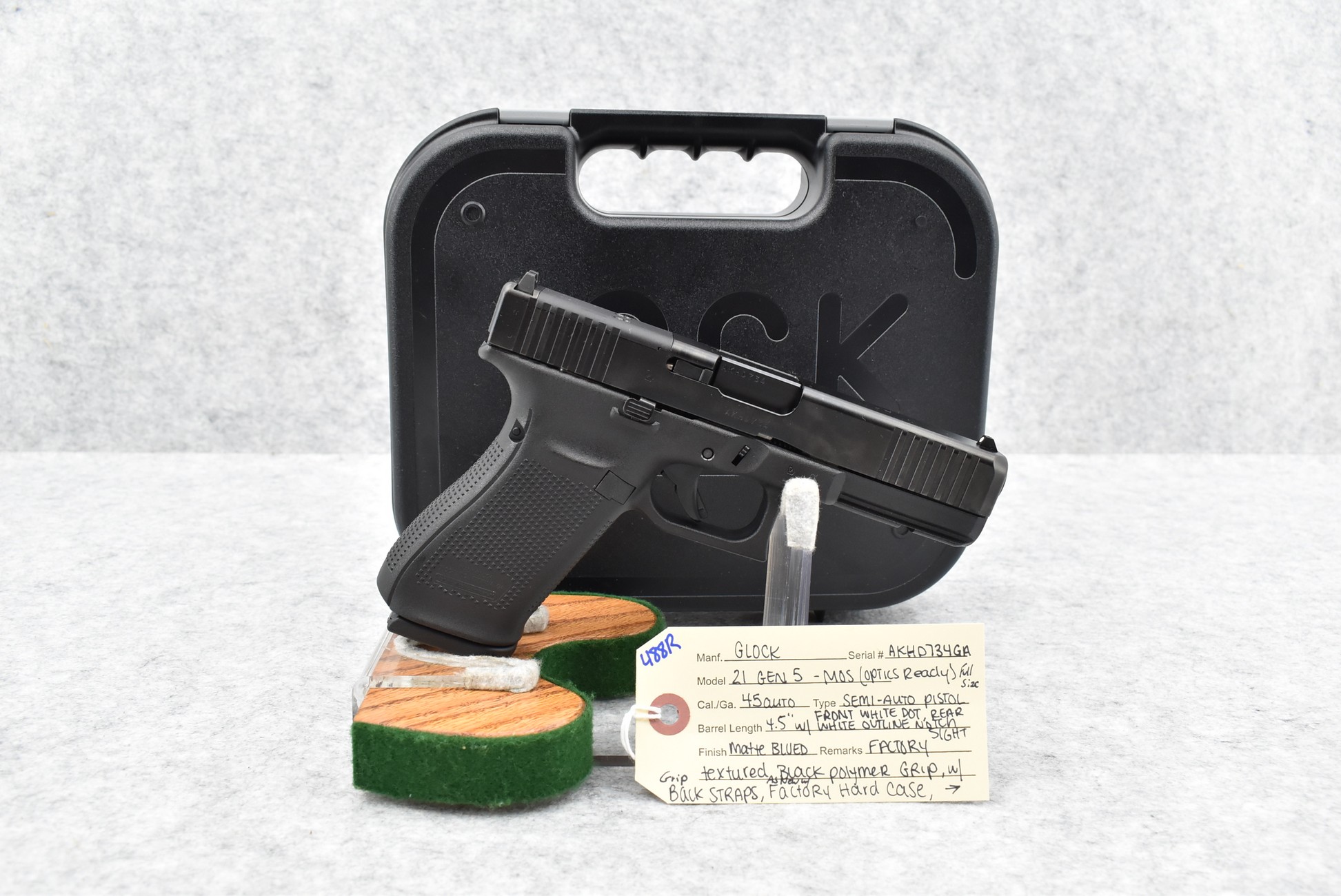 488R. Glock – Mod. 21 Gen 5 MOS (Optics Ready) Full Size – 45 Auto Cal. Semi-Auto Pistol – w/4½” Barrel w/White Dot Front and White Outlined Rear Notch Sights – Matte Blued Finish – w/Factory Textured Black Polymer Grip w/Grip Straps – w/3 Magazines – w/Factory Hard Case and Manual