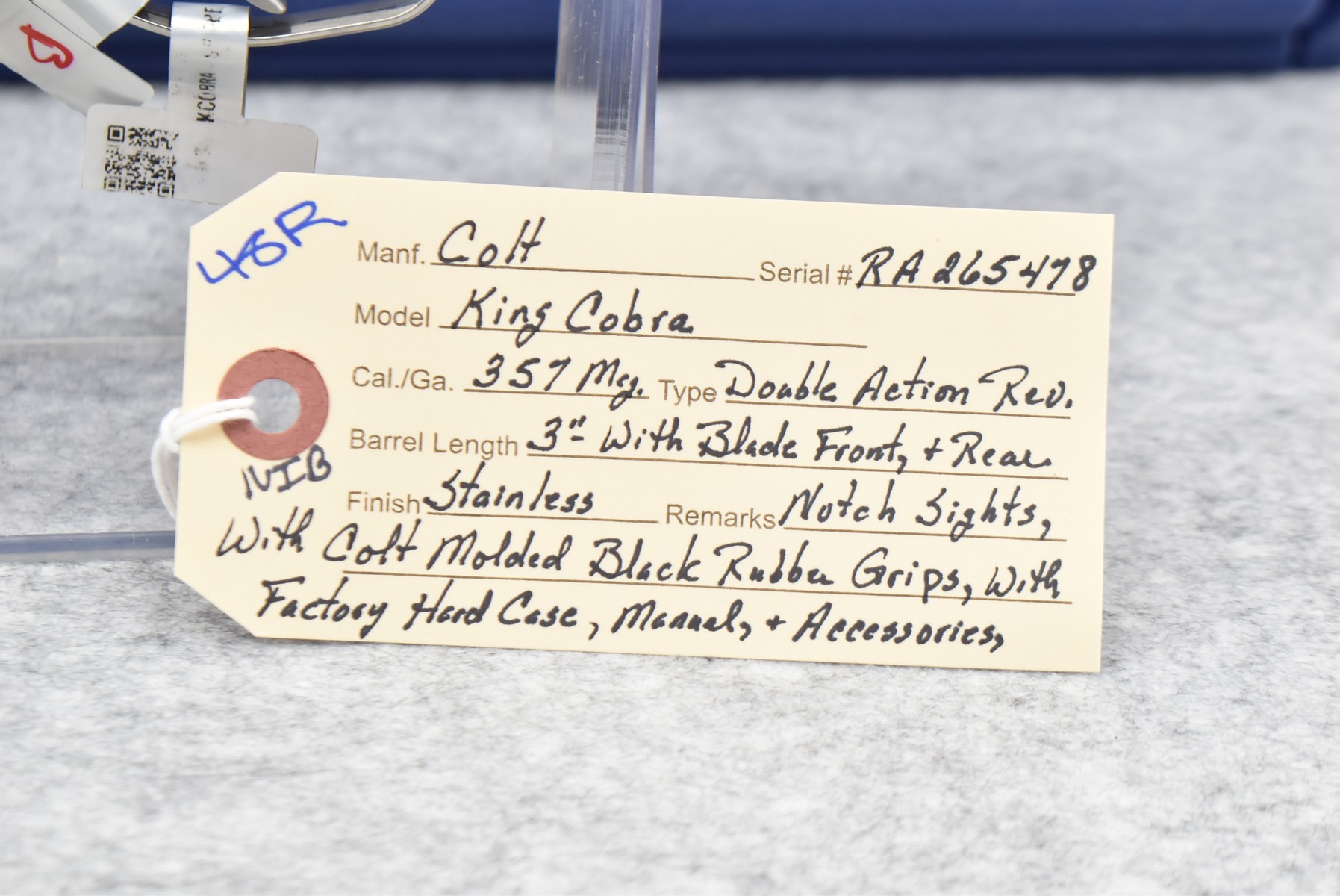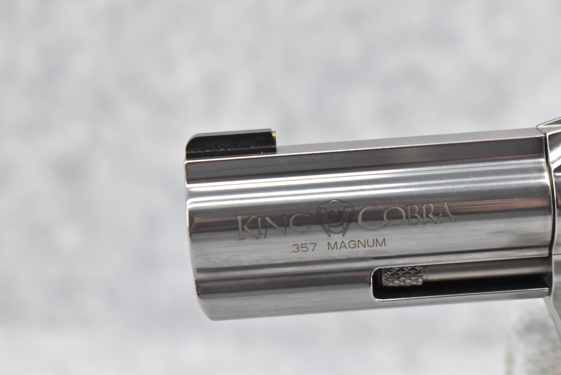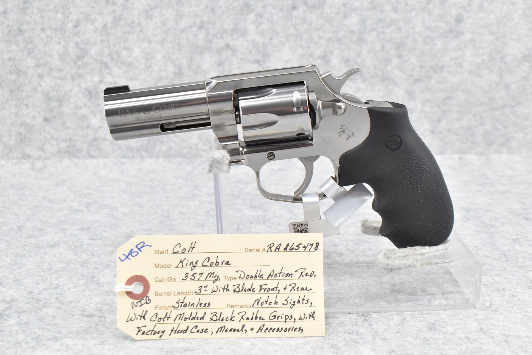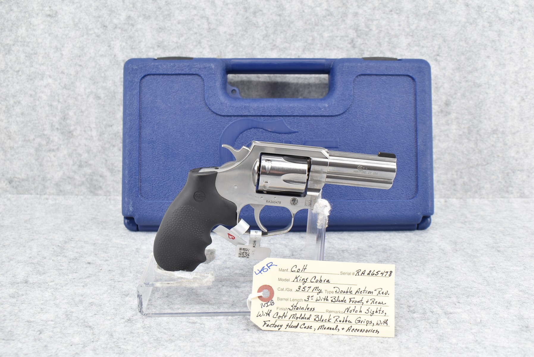 48R. Colt – Mod. King Cobra – 357 Mag. Cal. Double Action Revolver – w/3” Barrel w/Blade Front & Rear Notch Sights – Stainless Finish – w/Colt Molded Black Rubber Grips – New w/Factory Hard Case, Manual & Accessories
