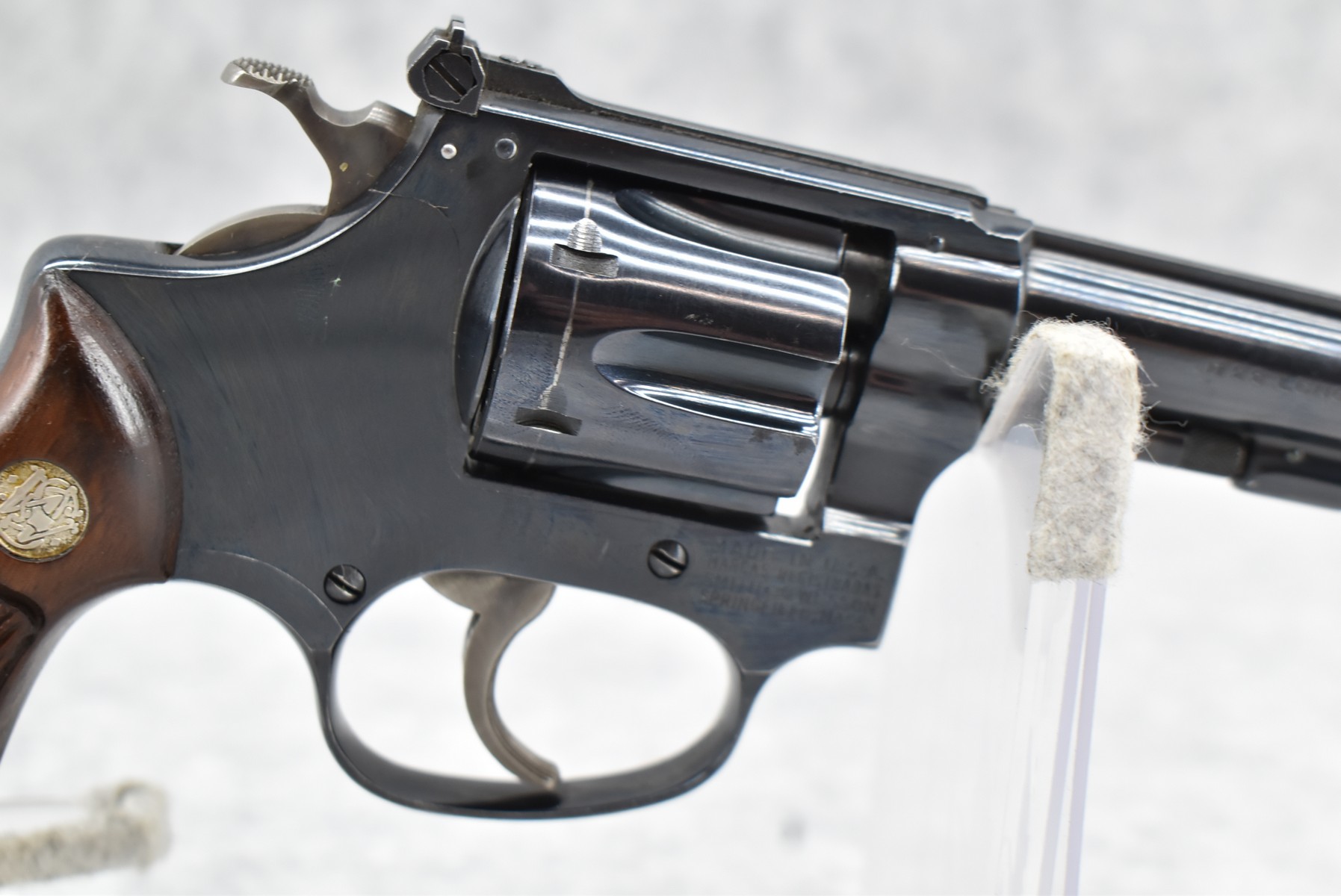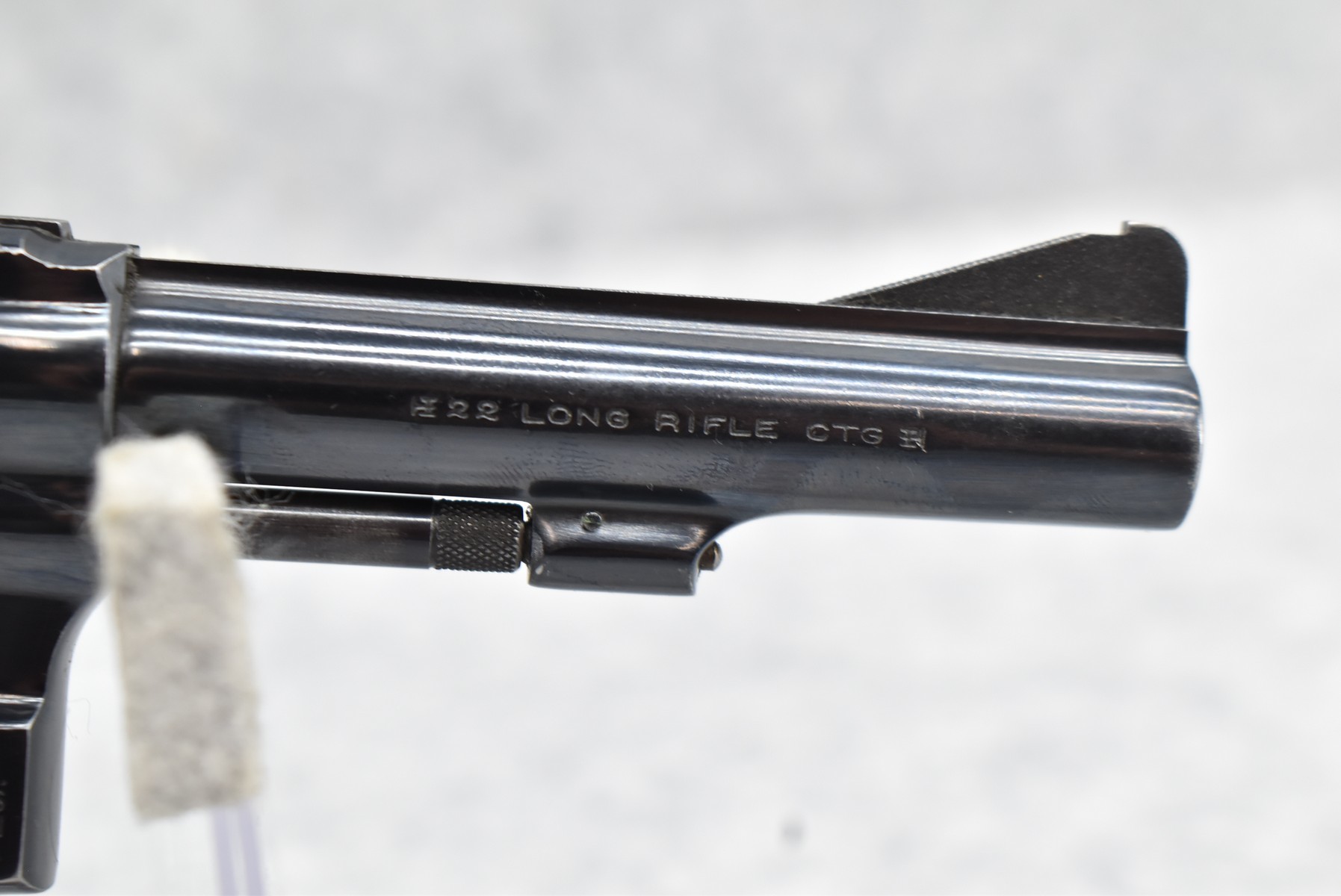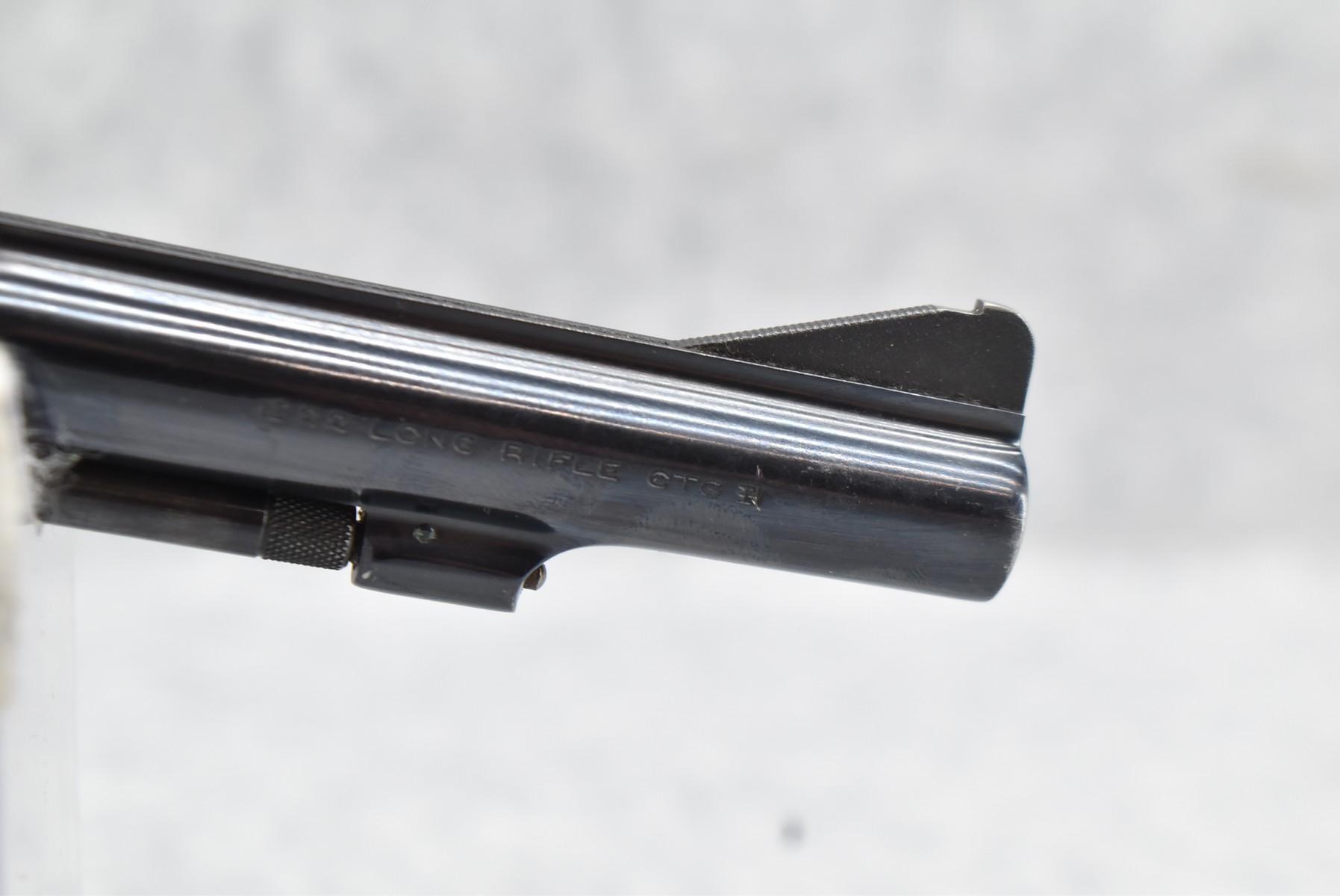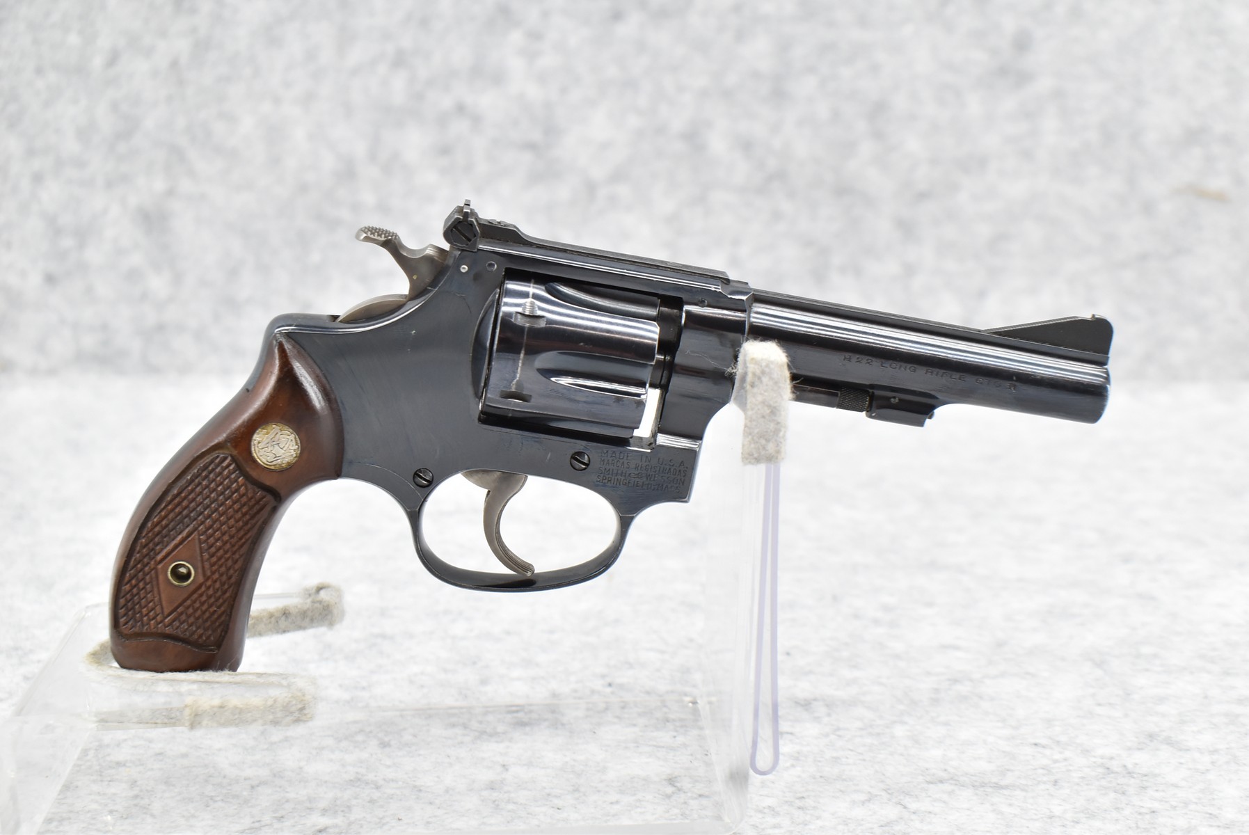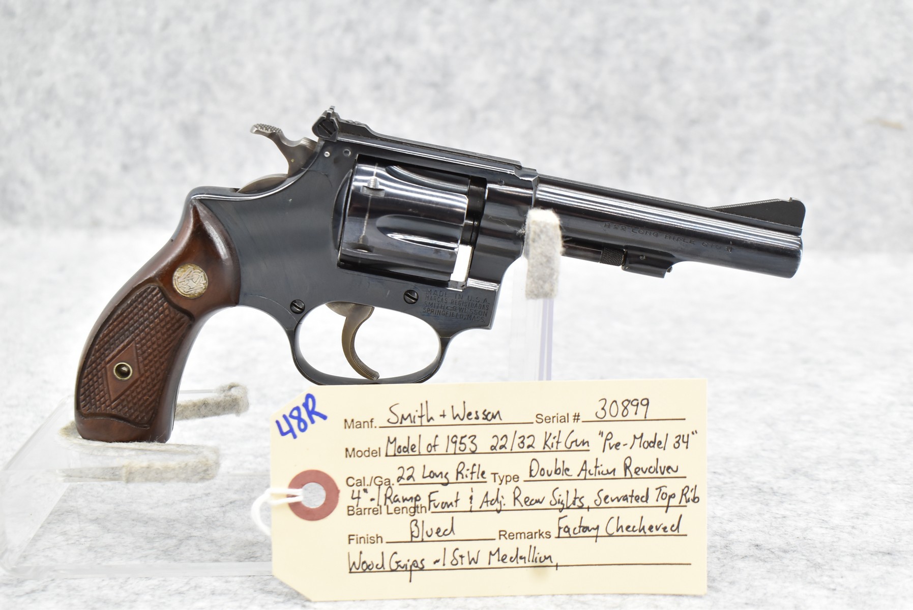48R. Smith & Wesson – Model of 1953 22/32 Kit Gun “Pre-Model 34” – 22 Long Rifle Cal. Double Action Revolver – w/4” Serrated Top Rib Barrel w/Ramp Front & Adj. Rear Sights – Blued Finish – w/Factory Checkered Diamond Wood Grips w/S&W Medallion – Serial Number in Original Serial Number Series Mfg. Circa 1953-1969