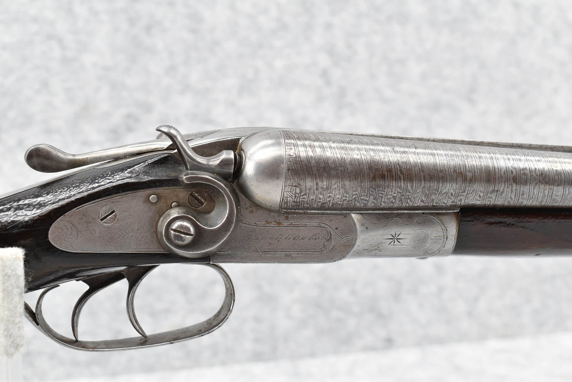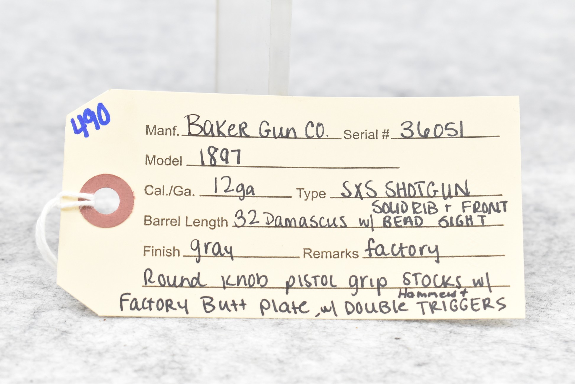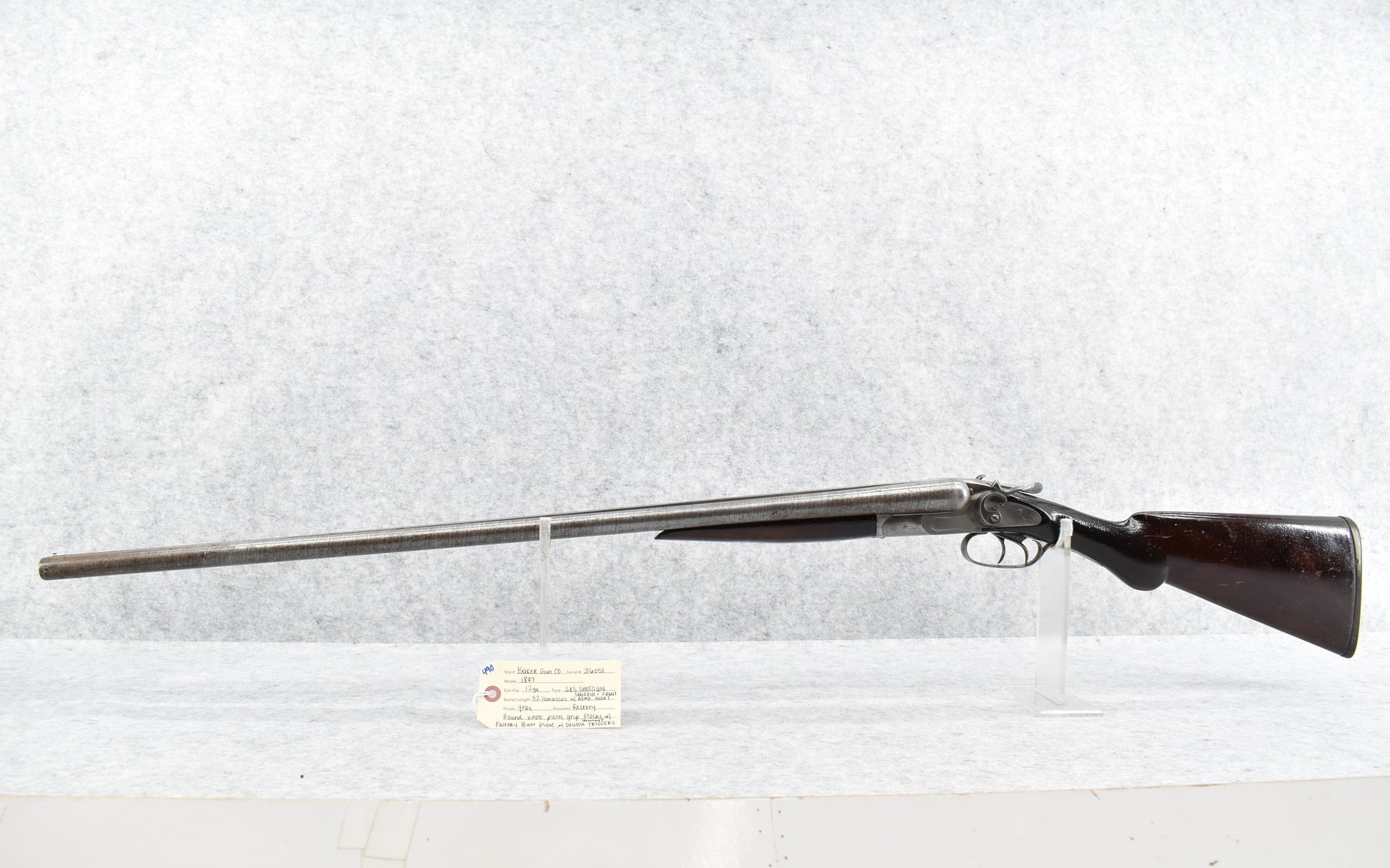 490. Baker Gun Co. – Mod. 1897 – 12ga. Double Barrel Shotgun – w/32” Solid Rib Damascus Barrel w/Bead Front Sight – Grey Finish – w/Factory Round Knob Pistol Grip Stocks w/Factory Butt Plate – w/Double Hammers and Triggers