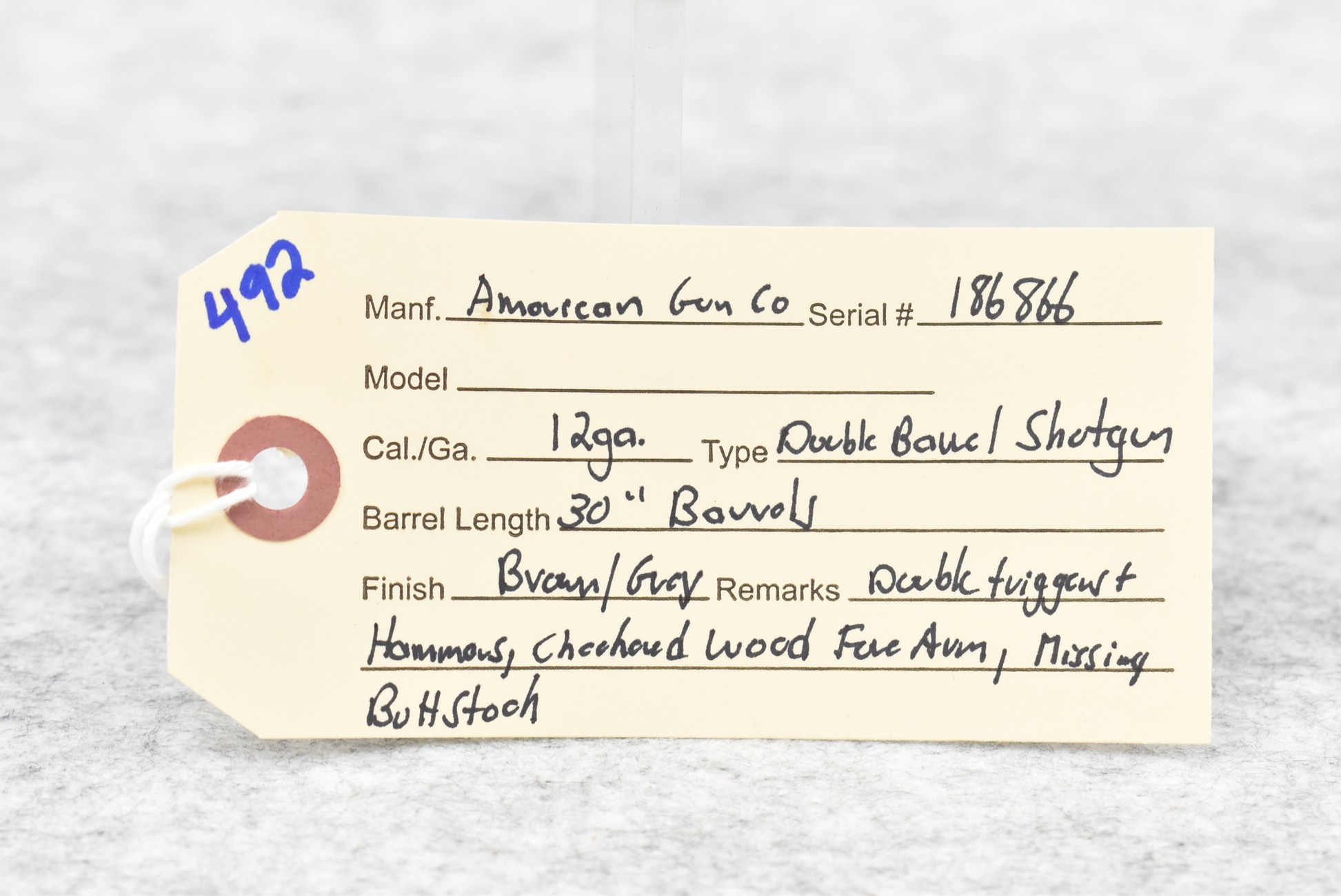 492. American Gun Co. – 12ga. Double Barrel Shotgun – w/30” Barrels – Brown/Grey Finish – w/Checkered Wood Forearm – Missing Butt Stock – w/Double Triggers and Hammers