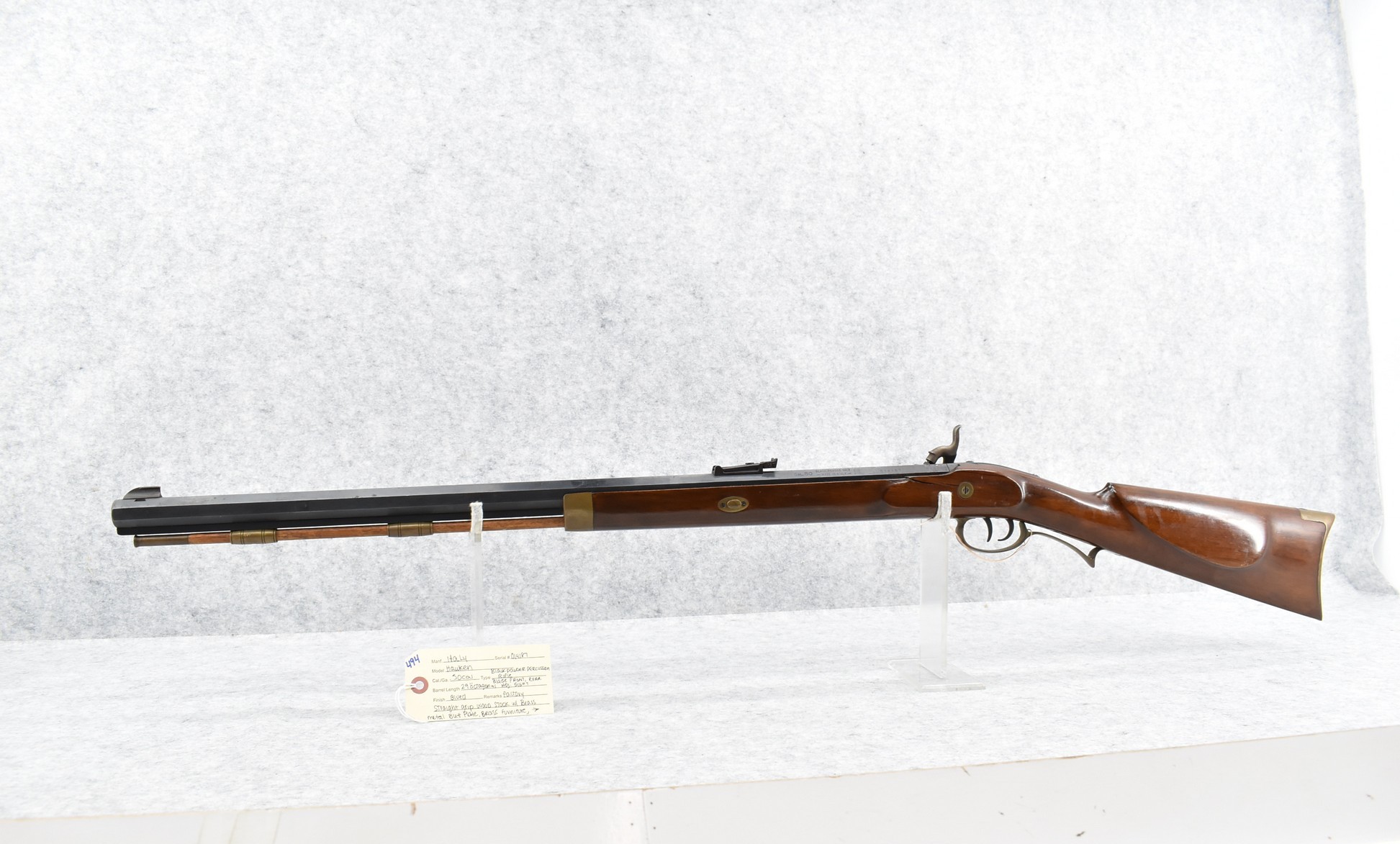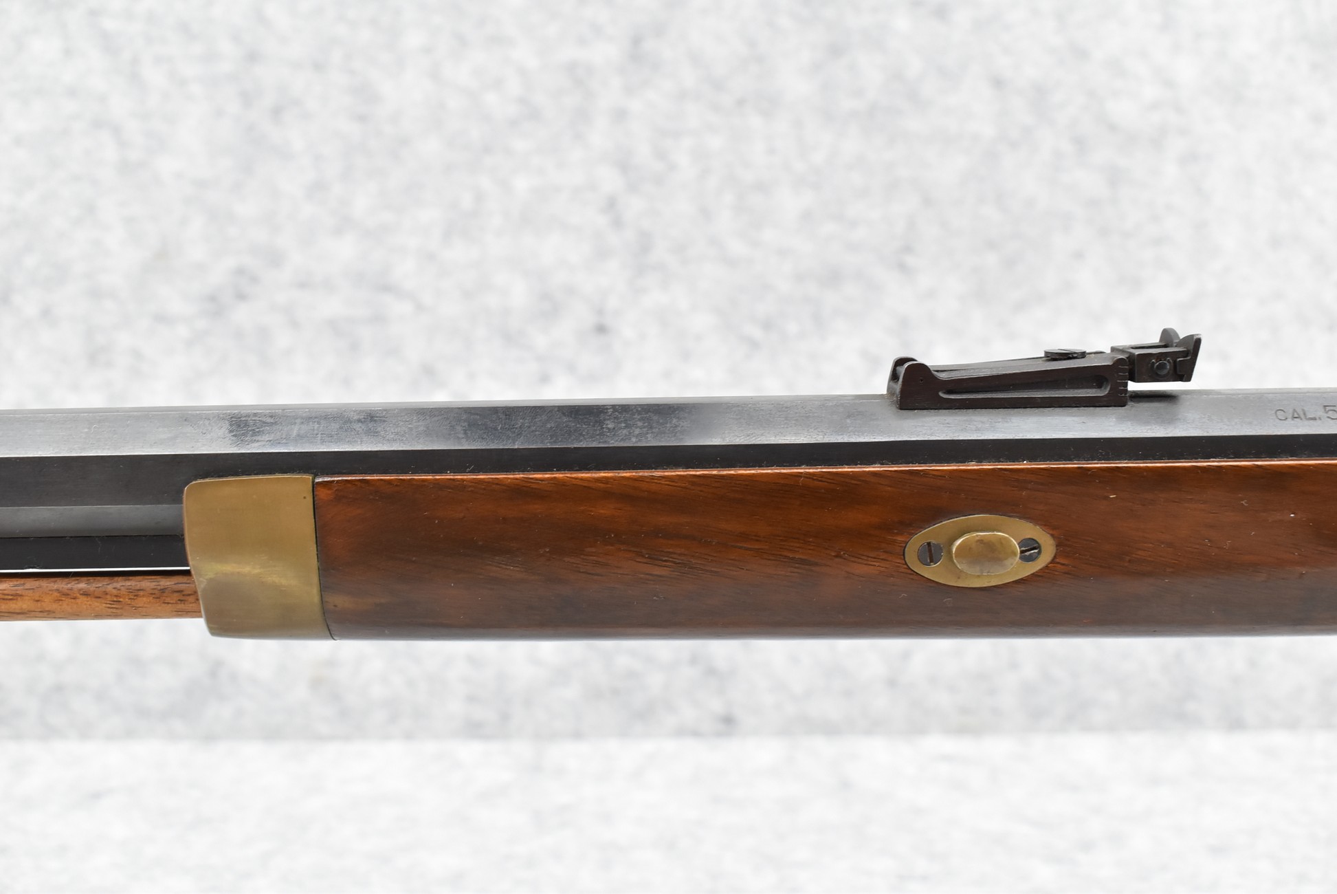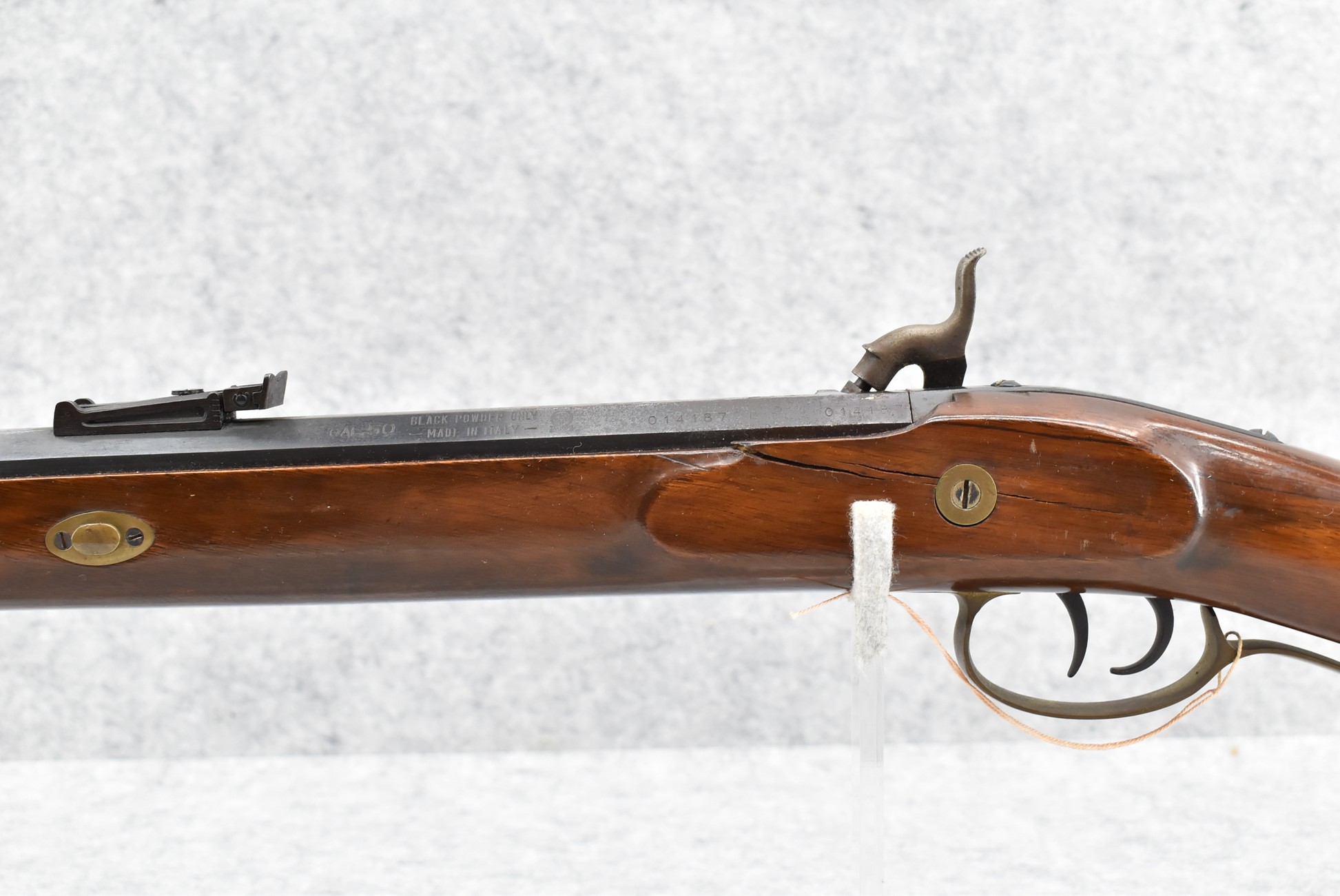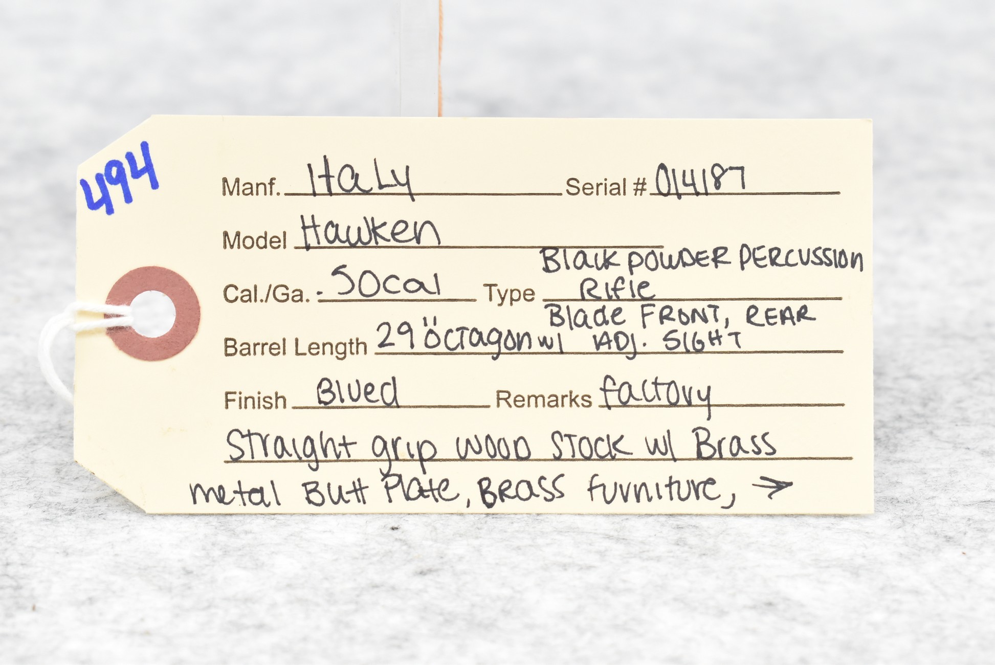 494. Italy – Mod. Hawken – 50 Cal. Black Powder Percussion Rifle – w/29” Octagon Barrel w/Blade Front and Adjustable Rear Sights – Blued Finish – w/Factory Straight Grip Wood Stock w/Brass Metal Butt Plate – w/Brass Furniture – Stock has Crack in the Side – w/Ram Rod