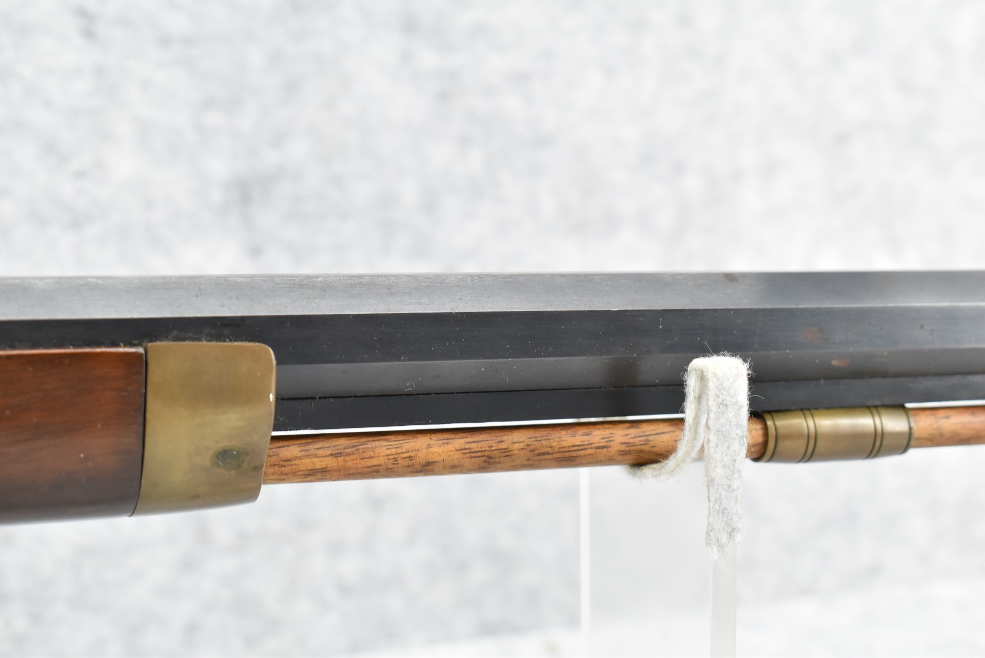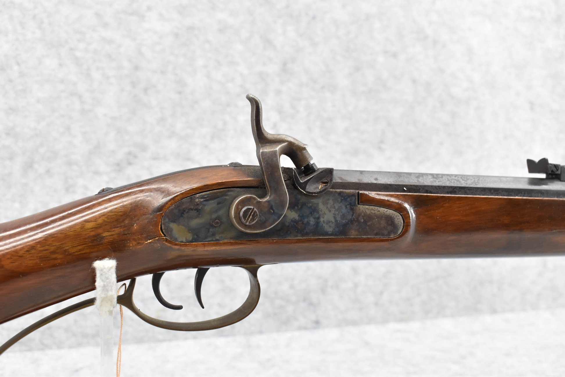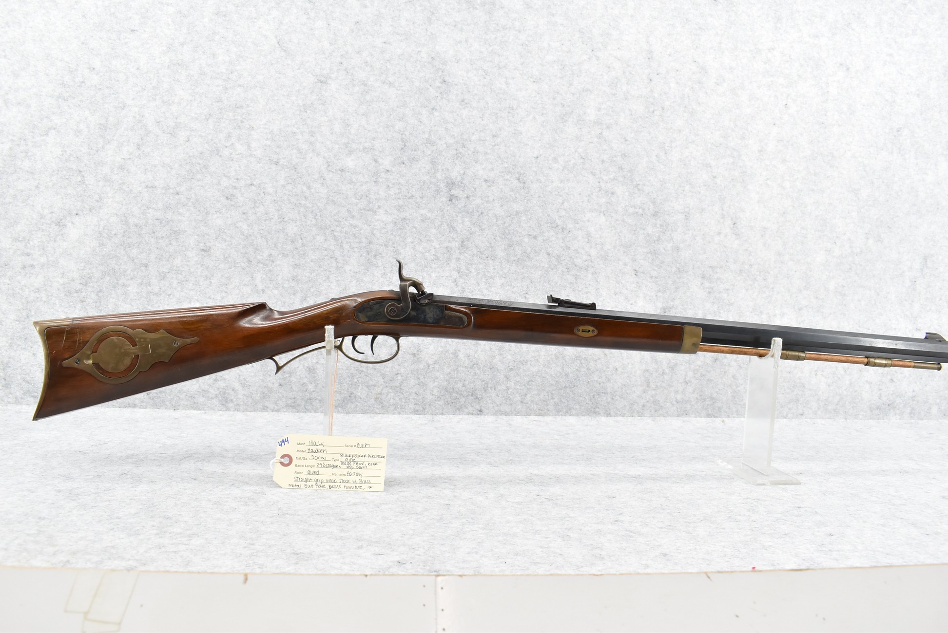 494. Italy – Mod. Hawken – 50 Cal. Black Powder Percussion Rifle – w/29” Octagon Barrel w/Blade Front and Adjustable Rear Sights – Blued Finish – w/Factory Straight Grip Wood Stock w/Brass Metal Butt Plate – w/Brass Furniture – Stock has Crack in the Side – w/Ram Rod