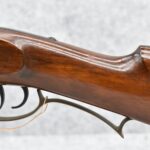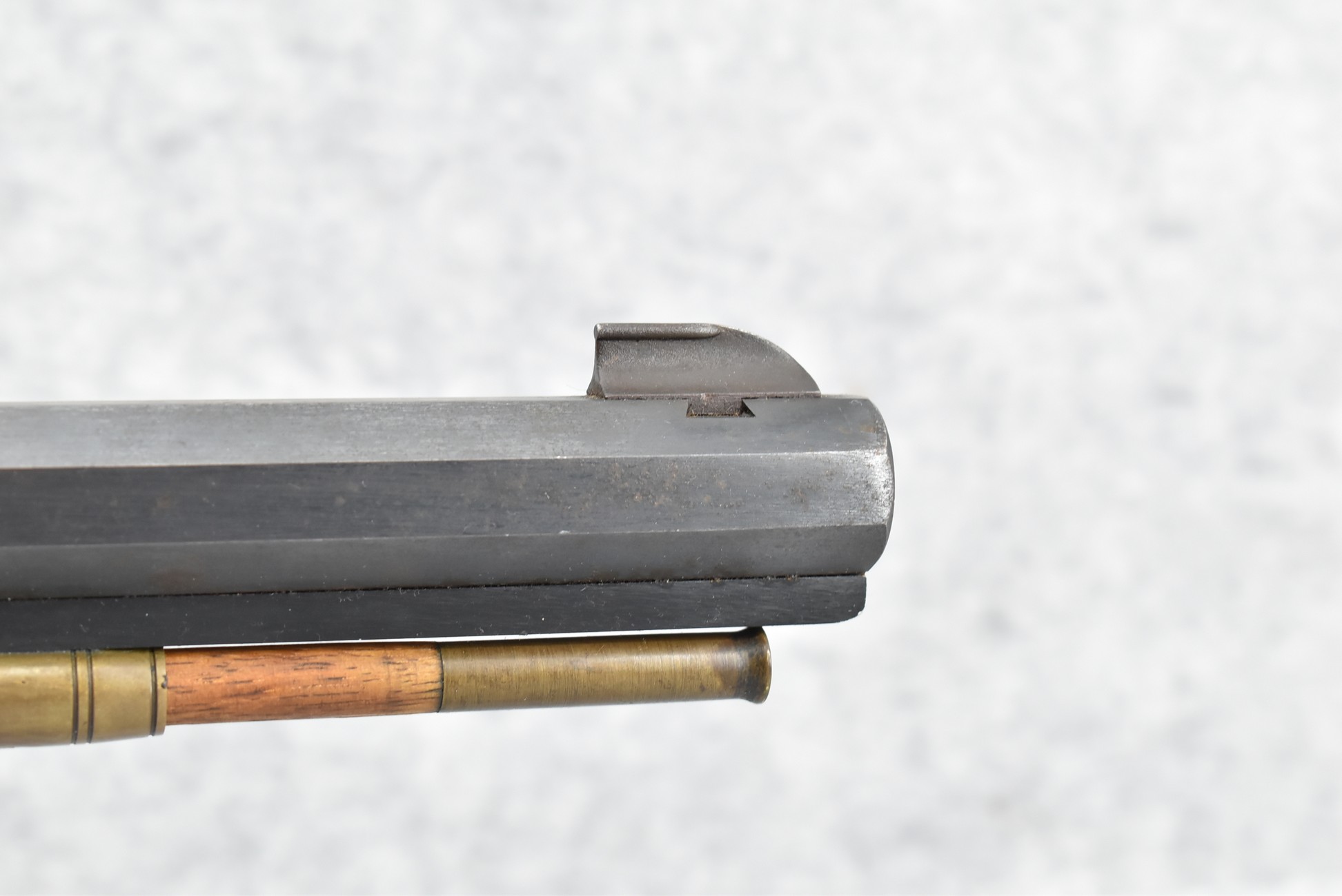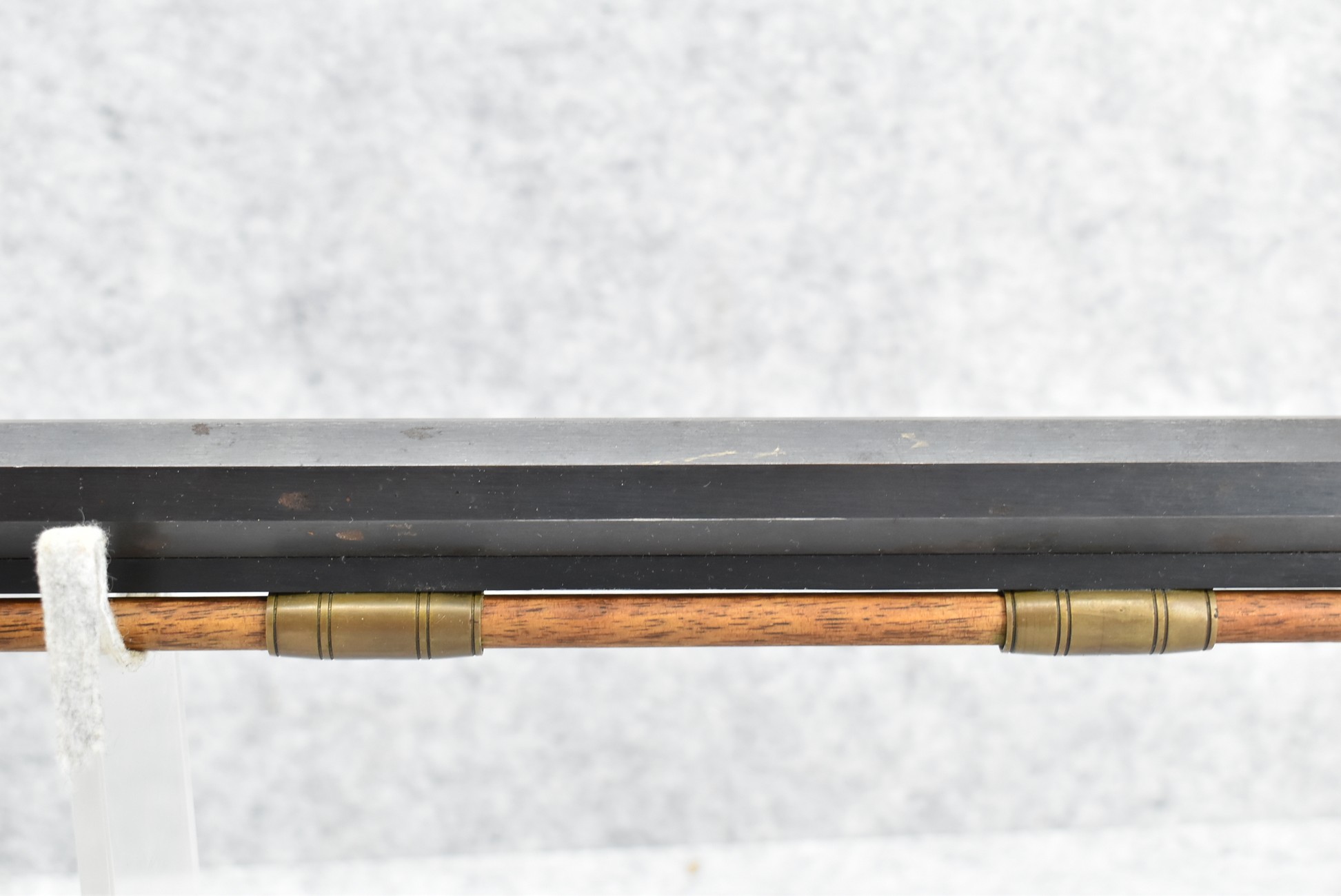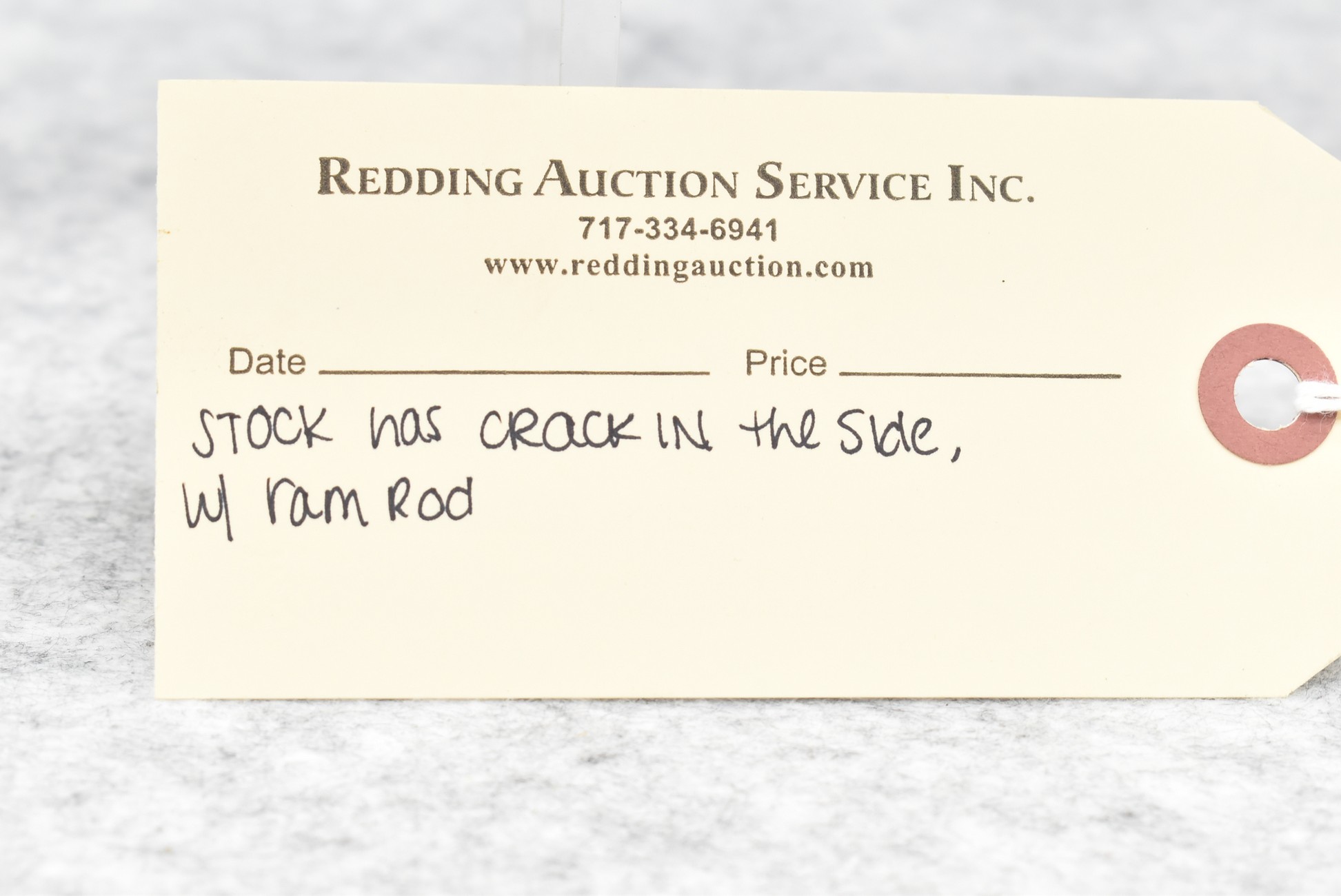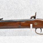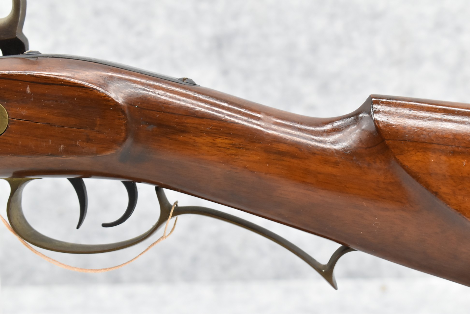 494. Italy – Mod. Hawken – 50 Cal. Black Powder Percussion Rifle – w/29” Octagon Barrel w/Blade Front and Adjustable Rear Sights – Blued Finish – w/Factory Straight Grip Wood Stock w/Brass Metal Butt Plate – w/Brass Furniture – Stock has Crack in the Side – w/Ram Rod