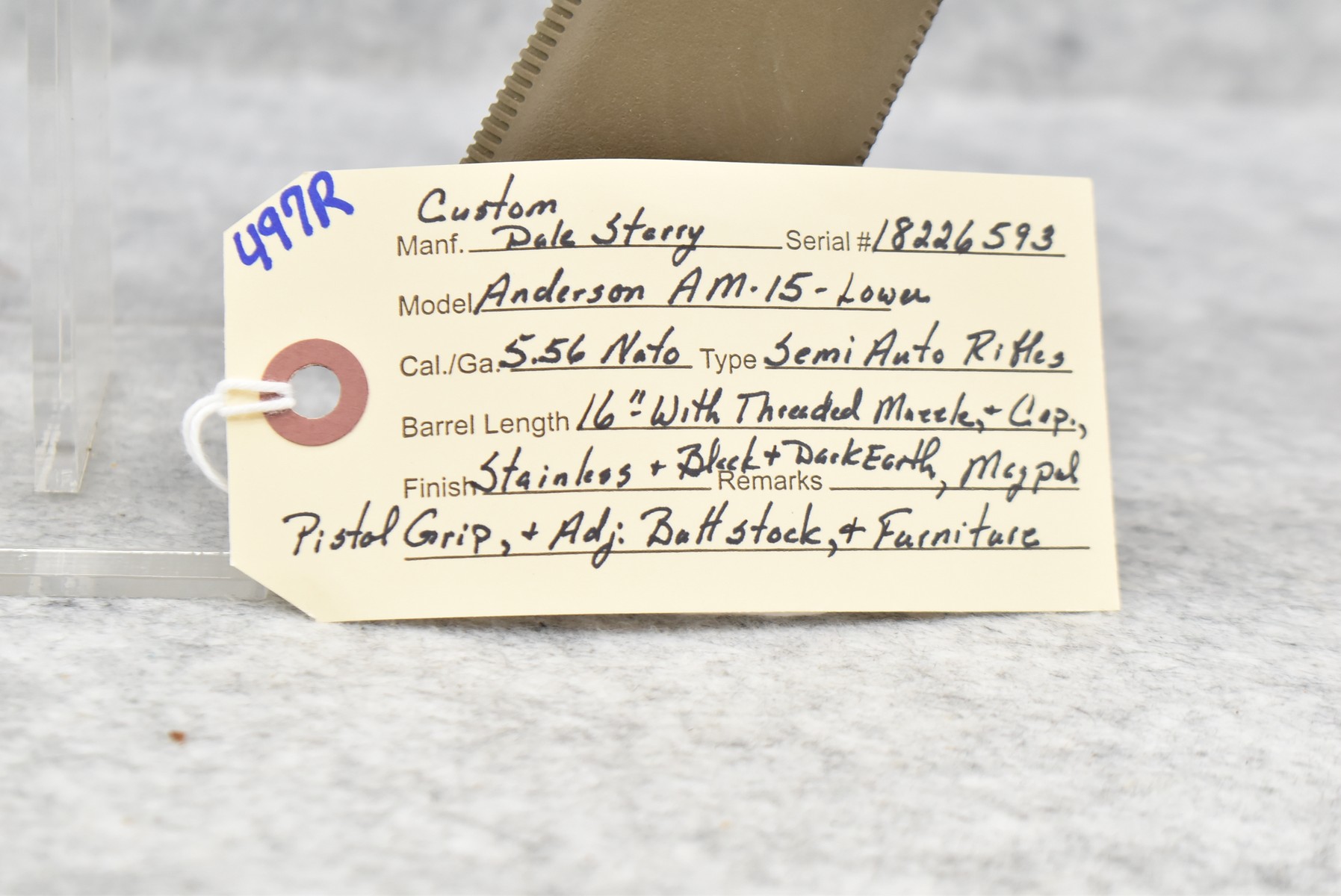 497R. Custom Dale Starry – Built on Anderson Mod. AM-15 Lower – 5.56 NATO Cal. Semi-Auto Rifle – w/16” Stainless Barrel w/Threaded Muzzle & Cap – Matte Black Finish – w/Flat Dard Earth Finish MagPul Pistol Grip & Adj. Butt Stock & Furniture (CANNOT GO TO MARYLAND)