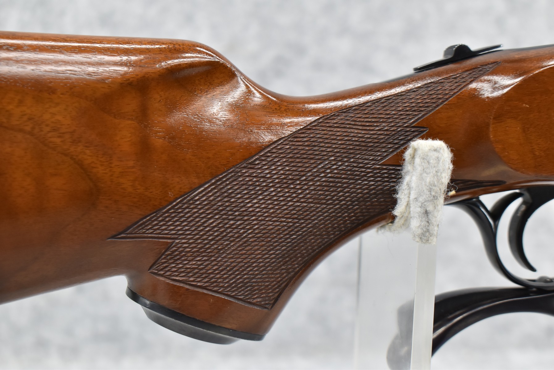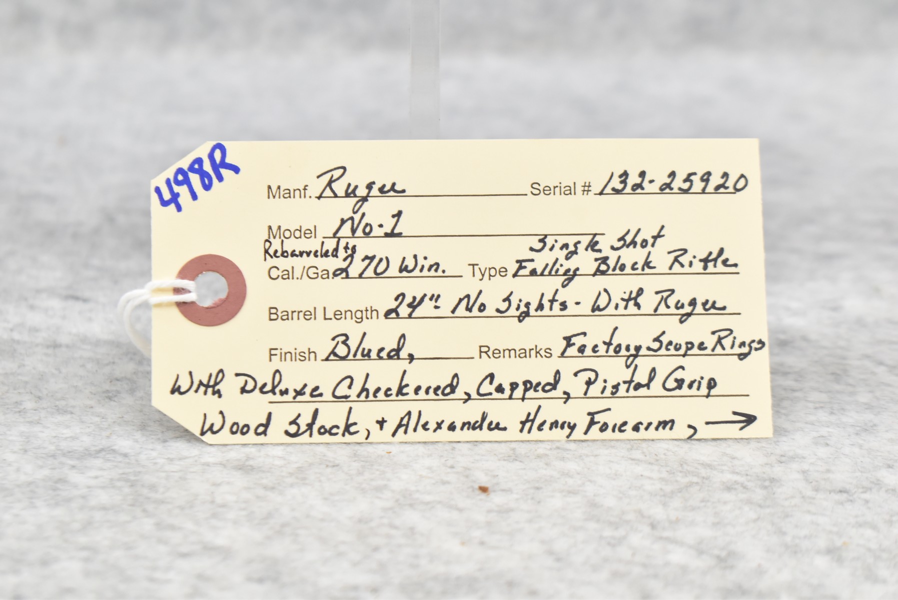 498R. Ruger – Mod. No. 1 – Re-Chambered to 270 Win. Cal. Falling Block Single Shot Rifle – w/24” Barrel (No Sights) – w/Ruger Factory Scope Rings – Blued Finish – w/Deluxe Checkered Capped Pistol Grip Wood Stock w/Factory Butt Pad & Alexander Henry Forearm