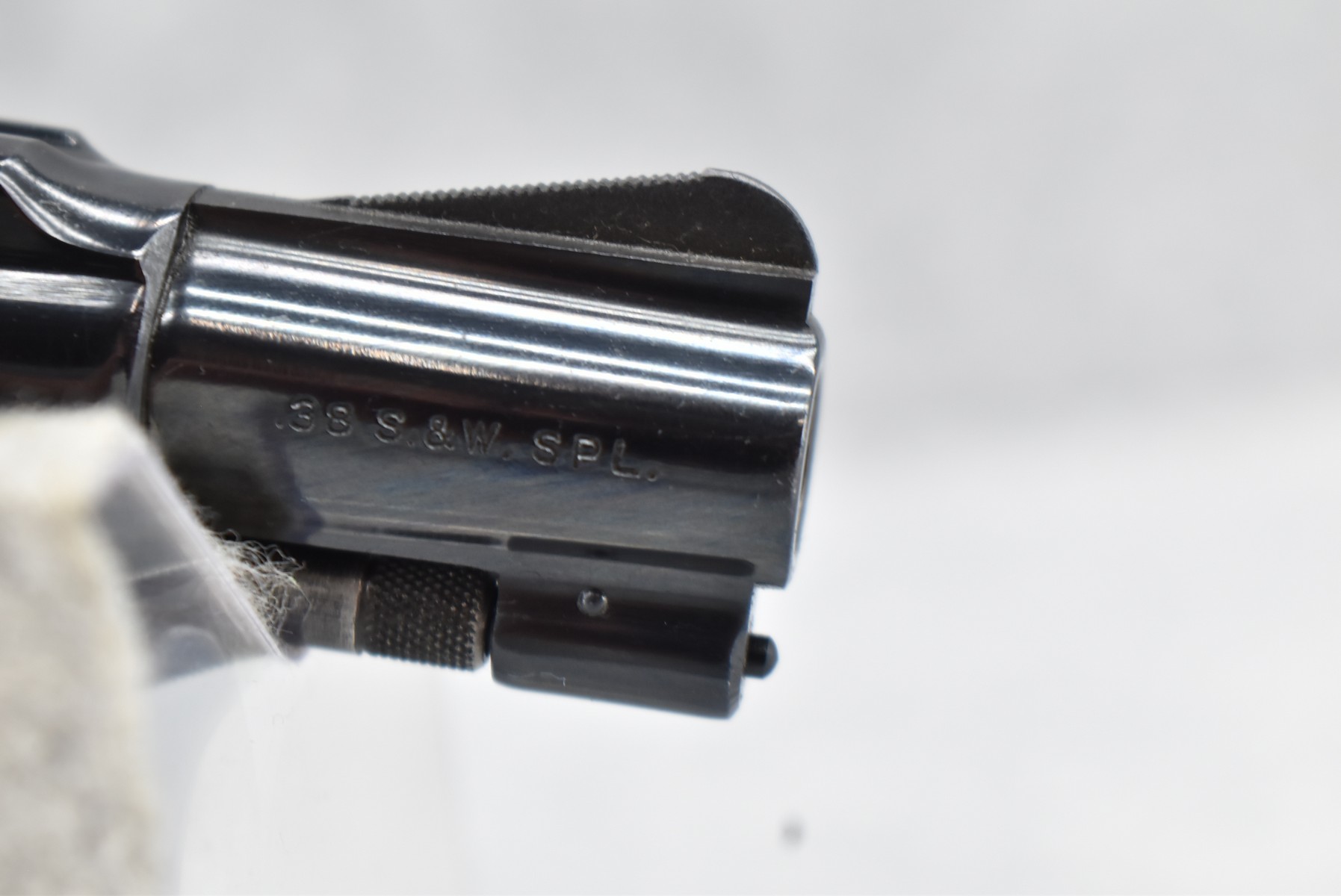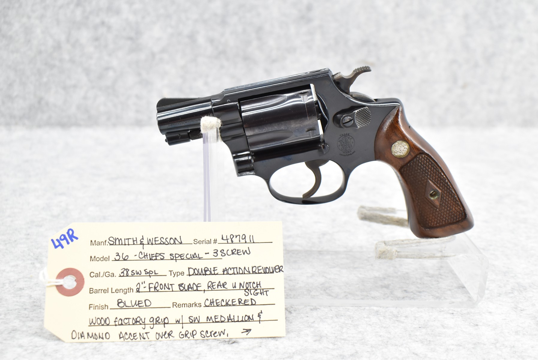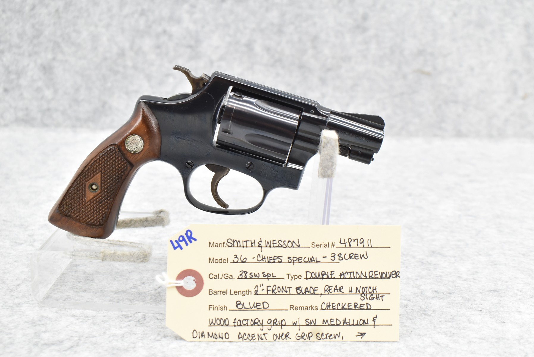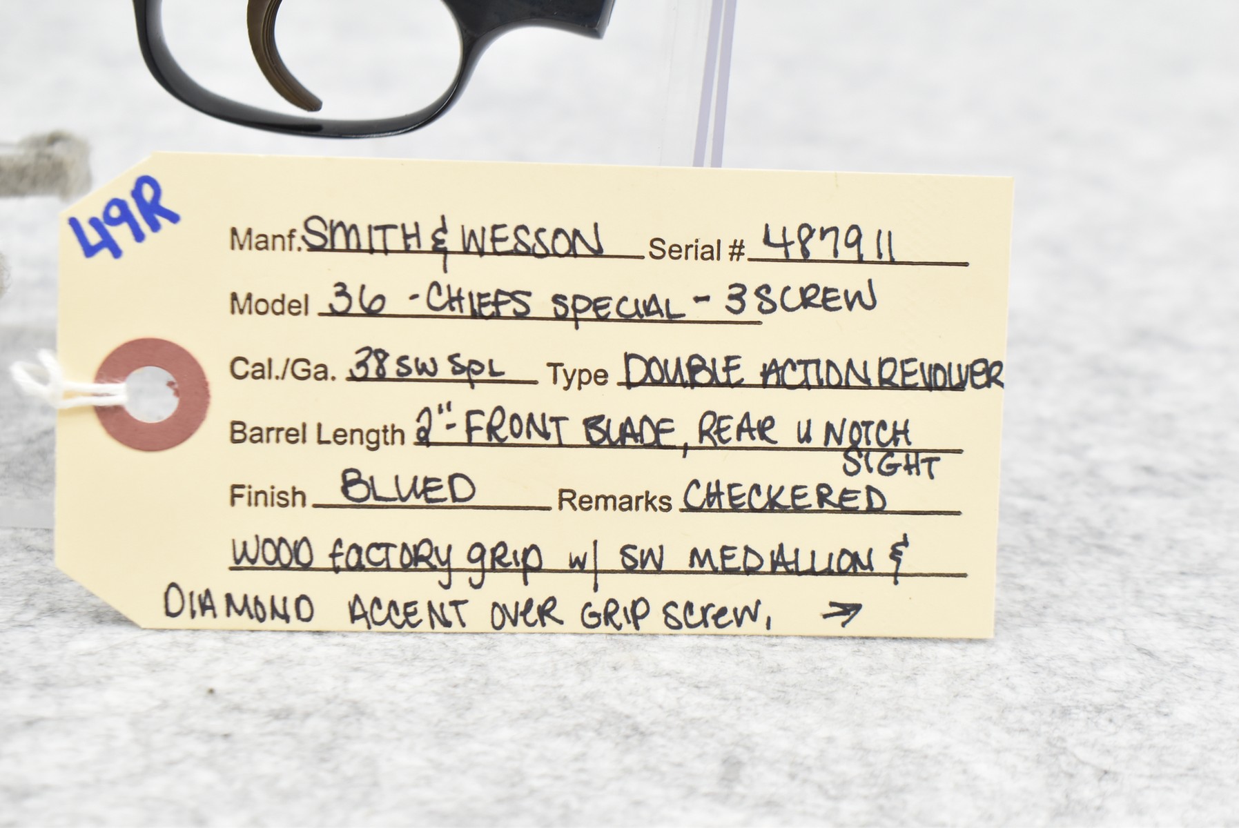 49R. Smith & Wesson – Mod. 36 Chiefs Special (3-Screw) – 38 S&W Spl. Cal. Double Action Revolver – w/2” Barrel w/Front Blade & Rear U-Notch Sights – Blued Finish – w/Checkered Wood Factory Grip w/S&W Medallion & Diamond Accent Over Grip Screw – Grips Number to Gun! – Serial Number in Original Chiefs Special Series